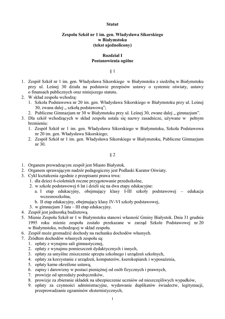 Statut Zespołu Szkół nr 1 im. gen. Władysława Sikorskiego w Białymstoku (tekst ujednolicony) Rozdział I Postanowienia ogólne §1 1. Zespół Szkół nr 1 im. gen. Władysława Sikorskiego w Białymstoku z siedzibą w Białymstoku przy ul. Leśnej 30 działa na podstawie przepisów ustawy o systemie oświaty, ustawy o finansach publicznych oraz niniejszego statutu. 2. W skład zespołu wchodzą: 1. Szkoła Podstawowa nr 20 im. gen. Władysława Sikorskiego w Białymstoku przy ul. Leśnej 30, zwana dalej „ szkołą podstawową”; 2. Publiczne Gimnazjum nr 30 w Białymstoku przy ul. Leśnej 30, zwane dalej „ gimnazjum”. 3. Dla szkół wchodzących w skład zespołu ustala się nazwy zasadnicze, używane w pełnym brzmieniu: 1. Zespół Szkół nr 1 im. gen. Władysława Sikorskiego w Białymstoku, Szkoła Podstawowa nr 20 im. gen. Władysława Sikorskiego; 2. Zespół Szkół nr 1 im. gen. Władysława Sikorskiego w Białymstoku, Publiczne Gimnazjum nr 30. §2 1. Organem prowadzącym zespół jest Miasto Białystok. 2. Organem sprawującym nadzór pedagogiczny jest Podlaski Kurator Oświaty. 3. Cykl kształcenia zgodnie z przepisami prawa trwa: 1. dla dzieci 6-cioletnich roczne przygotowanie przedszkolne, 2. w szkole podstawowej 6 lat i dzieli się na dwa etapy edukacyjne: a. I etap edukacyjny, obejmujący klasy I-III szkoły podstawowej – edukacja wczesnoszkolna, b. II etap edukacyjny, obejmujący klasy IV-VI szkoły podstawowej, 3. w gimnazjum 3 lata – III etap edukacyjny. 4. Zespół jest jednostką budżetową. 5. Mienie Zespołu Szkół nr 1 w Białymstoku stanowi własność Gminy Białystok. Dnia 31 grudnia 1995 roku mienie zespołu zostało przekazane w zarząd Szkole Podstawowej nr 20 w Białymstoku, wchodzącej w skład zespołu. 6. Zespół może gromadzić dochody na rachunku dochodów własnych. 7. Źródłem dochodów własnych zespołu są: 1. opłaty z wynajmu sali gimnastycznej, 2. opłaty z wynajmu pomieszczeń dydaktycznych i innych, 3. opłaty za umyślne zniszczenie sprzętu szkolnego i urządzeń szkolnych, 4. opłaty za korzystanie z urządzeń, komputerów, kserokopiarek i wyposażenia, 5. opłaty karne określone ustawą, 6. zapisy i darowizny w postaci pieniężnej od osób fizycznych i prawnych, 7. prowizje od sprzedaży podręczników, 8. prowizje za zbieranie składek na ubezpieczenie uczniów od nieszczęśliwych wypadków, 9. opłaty za czynności administracyjne, wydawanie duplikatów świadectw, legitymacji, przeprowadzanie egzaminów eksternistycznych, 1 10. środki pochodzące ze sprzedaży surowców wtórnych, 11. wpływy pochodzące z odsetek od środków na rachunku dochodów własnych, 12. opłaty za organizację kursów językowych, informatycznych i innych kursów z zakresu edukacji nie związanych z programem nauczania szkoły, kół zainteresowań, imprez organizowanych w ramach programu nauczania i wychowania. 8. Dochody własne wymienione w ust.7 mogą być wydatkowane na potrzeby szkoły: 1. zakup wyposażenia, 2. opłata za usługi materialne, 3. opłata za usługi niematerialne, 4. zakup pomocy naukowych, 5. wydatki celowe wynikające z dotacji celowych, 6. zakup energii, 7. delegacje służbowe, 8. inne wydatki szkoły. 9. Źródłem dochodów własnych zespołu są opłaty pochodzące z wpłat za korzystanie z wyżywienia w stołówce szkolnej. 10. Uzyskane dochody własne w sposób wymieniony w ust. 9 przeznacza się na zakup artykułów żywnościowych niezbędnych do prowadzenia żywienia. §3 Dokonywanie zmian w statucie następuje w drodze uchwały Rady Szkoły, a jeżeli ta nie funkcjonuje, w drodze uchwały Rady Pedagogicznej. Rozdział II Cele i zadania szkoły §4 1. 2. 3. 4. Zespół realizuje cele i zadania określone w ustawie z dnia 7 września 1991 roku o systemie oświaty oraz przepisach wykonawczych wydanych na jej podstawie. W realizacji zadań zespół respektuje zobowiązania wynikające z: -Powszechnej Deklaracji Praw Człowieka ONZ, -Deklaracji Praw Dziecka ONZ, -Konwencji o Prawach Dziecka. Celem kształcenia ogólnego w szkole podstawowej jest: 1. przyswojenie przez uczniów podstawowego zasobu wiadomości na temat faktów, zasad, teorii i praktyki, dotyczących przede wszystkim tematów i zjawisk bliskich doświadczeniom uczniów, 2. zdobycie przez uczniów umiejętności wykorzystywania posiadanych wiadomości podczas wykonywania zadań i rozwiązywania problemów, 3. kształtowanie u uczniów postaw warunkujących sprawne i odpowiedzialne funkcjonowanie we współczesnym świecie. Do najważniejszych umiejętności zdobywanych przez ucznia w trakcie kształcenia ogólnego w szkole podstawowej należą: 1. czytanie – rozumiane zarówno jako prosta czynność, jako umiejętność rozumienia, wykorzystywania i przetwarzania tekstów w zakresie umożliwiającym zdobywanie wiedzy, rozwój emocjonalny, intelektualny i moralny oraz uczestnictwo w życiu społeczeństwa, 2. myślenie matematyczne – umiejętność korzystania z podstawowych narzędzi matematyki w życiu codziennym oraz prowadzenia elementarnych rozumowań matematycznych, 3. myślenie naukowe – umiejętność formułowania wniosków opartych na obserwacjach empirycznych dotyczących przyrody i społeczeństwa, 2 4. umiejętność komunikowania się w języku ojczystym i w języku obcym, zarówno w mowie, jak i w piśmie, 5. umiejętność posługiwania się nowoczesnymi technologiami informacyjno komunikacyjnymi, w tym także dla wyszukiwania i korzystania z informacji, 6. umiejętność uczenia się jako sposób zaspokajania naturalnej ciekawości świata, odkrywania swoich zainteresowań i przygotowania do dalszej edukacji, 7. umiejętność pracy zespołowej. 5. Celem kształcenia ogólnego w gimnazjum jest: 1. przyswojenie przez uczniów określonego zasobu wiadomości na temat faktów, zasad, teorii i praktyk, 2. zdobycie przez uczniów umiejętności wykorzystania posiadanych wiadomości podczas wykonywania zadań i rozwiązywan