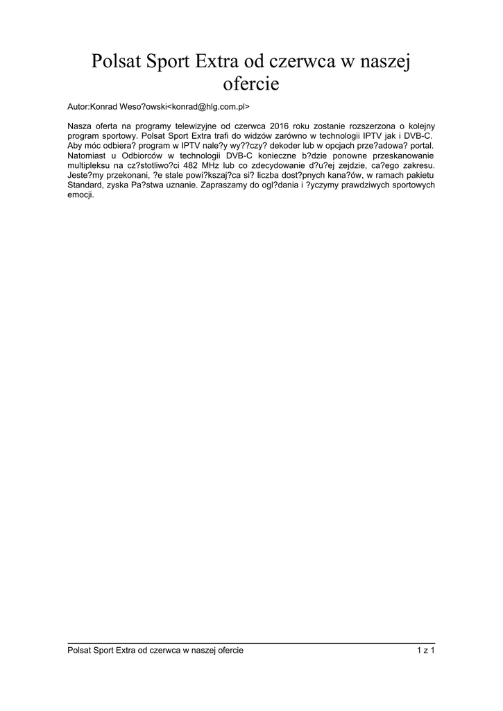 Polsat Sport Extra od czerwca w naszej ofercie Autor:Konrad Weso?owski<[email protected]> Nasza oferta na programy telewizyjne od czerwca 2016 roku zostanie rozszerzona o kolejny program sportowy. Polsat Sport Extra trafi do widzów zarówno w technologii IPTV jak i DVB-C. Aby móc odbiera? program w IPTV nale?y wy??czy? dekoder lub w opcjach prze?adowa? portal. Natomiast u Odbiorców w technologii DVB-C konieczne b?dzie ponowne przeskanowanie multipleksu na cz?stotliwo?ci 482 MHz lub co zdecydowanie d?u?ej zejdzie, ca?ego zakresu. Jeste?my przekonani, ?e stale powi?kszaj?ca si? liczba dost?pnych kana?ów, w ramach pakietu Standard, zyska Pa?stwa uznanie. Zapraszamy do ogl?dania i ?yczymy prawdziwych sportowych emocji. Polsat Sport Extra od czerwca w naszej ofercie 1z1