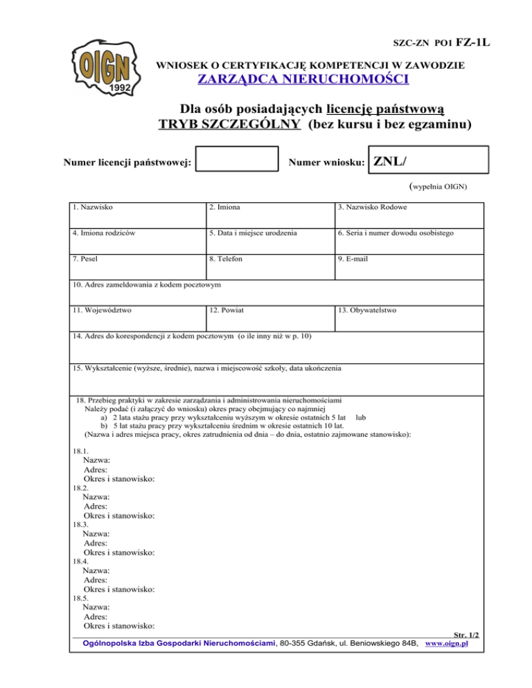 SZC-ZN PO1 FZ-1L WNIOSEK O CERTYFIKACJĘ KOMPETENCJI W ZAWODZIE ZARZĄDCA NIERUCHOMOŚCI Dla osób posiadających licencję państwową TRYB SZCZEGÓLNY (bez kursu i bez egzaminu) Numer licencji państwowej: Numer wniosku: ZNL/ (wypełnia OIGN) 1. Nazwisko 2. Imiona 3. Nazwisko Rodowe 4. Imiona rodziców 5. Data i miejsce urodzenia 6. Seria i numer dowodu osobistego 7. Pesel 8. Telefon 9. E-mail 10. Adres zameldowania z kodem pocztowym 11. Województwo 12. Powiat 13. Obywatelstwo 14. Adres do korespondencji z kodem pocztowym (o ile inny niż w p. 10) 15. Wykształcenie (wyższe, średnie), nazwa i miejscowość szkoły, data ukończenia 18. Przebieg praktyki w zakresie zarządzania i administrowania nieruchomościami Należy podać (i załączyć do wniosku) okres pracy obejmujący co najmniej a) 2 lata stażu pracy przy wykształceniu wyższym w okresie ostatnich 5 lat lub b) 5 lat stażu pracy przy wykształceniu średnim w okresie ostatnich 10 lat. (Nazwa i adres miejsca pracy, okres zatrudnienia od dnia – do dnia, ostatnio zajmowane stanowisko): 18.1. Nazwa: Adres: Okres i stanowisko: 18.2. Nazwa: Adres: Okres i stanowisko: 18.3. Nazwa: Adres: Okres i stanowisko: 18.4. Nazwa: Adres: Okres i stanowisko: 18.5. Nazwa: Adres: Okres i stanowisko: Str. 1/2 Ogólnopolska Izba Gospodarki Nieruchomościami, 80-355 Gdańsk, ul. Beniowskiego 84B, www.oign.pl 19. Dokumenty potwierdzające dotychczas uzyskane kwalifikacje w zakresie zarządzania i administrowania nieruchomościami w okresach wymienionych w punkcie 18 (świadectwa pracy, zaświadczenie o zatrudnieniu), z podaniem rodzaju dokumentu, nazwy przedsiębiorstwa i daty wydania. 19.1. 19.2. 19.3. 19.4. 19.5 20. Czy wnioskujący zgłasza do OIGN specjalne potrzeby dotyczące procesu certyfikacji (np. przy niepełnosprawności). Jeżeli tak, to jakie? II. Oświadczenie nr 1. Stwierdzam własnoręcznym podpisem prawdziwość powyższych danych. Oświadczam, że zobowiązuję się powiadomić OIGN o każdej zmianie swego adresu. Wiem, że w przypadku poświadczenia nieprawdy przyznany mi certyfikat zostanie cofnięty. data i podpis III. Oświadczenie nr 2. Oświadczam, że posiadam pełną zdolność do czynności prawnych oraz, że nie byłem/-am karany/-a za przestępstwa przeciwko mieniu, dokumentom, za przestępstwa gospodarcze, za fałszowanie pieniędzy, papierów wartościowych, znaków urzędowych, za składanie fałszywych zeznań oraz za przestępstwa skarbowe. data i podpis IV. Oświadczenie nr 3. Oświadczam, że zapoznałem/am się z programem certyfikacji kompetencji OIGN osób w zawodzie zarządca nieruchomości i zobowiązuję się do stosowania i realizacji wymogów i zasad w nim zawartych, a w szczególności dotyczących certyfikacji, nadzoru nad certyfikatem i podnoszeniem kwalifikacji a także obowiązków zarządcy nieruchomości i należytego wykonywania zadań i czynności zarządzania nieruchomościami. data i podpis V. Zgoda na przetwarzanie danych osobowych. Wyrażam zgodę na przetwarzanie moich danych osobowych w związku z prowadzonym postępowaniem kwalifikacyjnym , w tym na publikację na stronie internetowej OIGN mojego nazwiska, imienia, adresu do korespondencji, adresu e-mail i numeru certyfikatu na liście osób które pozytywnie zakończyły postępowanie kwalifikacyjne. (zgodnie z data i podpis Ustawą z dnia 29.08.1997 r. o ochronie danych osobowych Dz.U. 2002 Nr 101 poz.926, z późn. zm.) VI. Załączniki (załączniki załącz do wniosku lub zeskanuj i wyślij na adres e-mail [email protected] ): 1. Świadectwo nadania państwowej licencji zawodowej zarządcy nieruchomości 2. Dokumenty potwierdzające uzyskane przez kandydata kwalifikacje i kompetencje w czasie dotychczasowej pracy zawodowej (wymienione w punkcie 19). 3. Dowód wniesienia na konto OIGN opłaty za postępowanie certyfikujące. Numer konta: 65 1160 2202 0000 0000 6190 6295. VI. Decyzja OIGN: Data: Decyzja: / NEGATYWNA / POZYTYWNA /* Nr wniosku: Nazwisko i Imię: _______________ (nr certyfikatu) Uwagi: 1. /* - niepotrzebne skreślić 2. Wniosek bez wymaganych załączników nie będzie rozpatrywany Str. 2/2 Ogólnopolska Izba Gospodarki Nieruchomościami, 80-355 Gdańsk, ul. Beniowskiego 84B, tel. 58 558 45 25