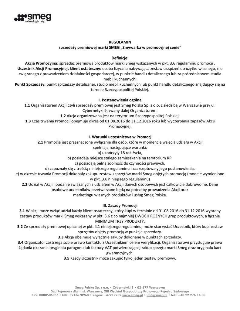 REGULAMIN sprzedaży premiowej marki SMEG „Zmywarka w promocyjnej cenie” Definicje: Akcja Promocyjna: sprzedaż premiowa produktów marki Smeg wskazanych w pkt. 3.6 regulaminu promocji . Uczestnik Akcji Promocyjnej, klient ostateczny: osoba fizyczna nabywająca zestaw urządzeń do użytku własnego, nie związanego z prowadzeniem działalności gospodarczej, w punkcie handlu detalicznego lub za pośrednictwem studia mebli kuchennych. Punkt Sprzedaży: punkt sprzedaży detalicznej, studio mebli kuchennych lub punkt handlu detalicznego znajdujący się na terenie Rzeczypospolitej Polskiej. I. Postanowienia ogólne 1.1 Organizatorem Akcji czyli sprzedaży premiowej jest Smeg Polska Sp. z o.o. z siedzibą w Warszawie przy ul. Cybernetyki 9, zwany dalej Organizatorem. 1.2 Akcja organizowana jest na terytorium Rzeczypospolitej Polskiej. 1.3 Czas trwania Promocji obejmuje okres od 01.08.2016 do 31.12.2016 roku lub wyczerpania zapasów Akcji Promocyjnej. II. Warunki uczestnictwa w Promocji 2.1 Promocja jest przeznaczona wyłącznie dla osób, które w momencie wzięcia udziału w Akcji spełniają następujące warunki: a) ukończyły 18 rok życia, b) posiadają miejsce stałego zamieszkania na terytorium RP, c) posiadają pełną zdolność do czynności prawnych, d) zapoznały się z treścią niniejszego regulaminu i zaakceptowały jego postanowienia, e) w okresie trwania Promocji dokonały zakupu zestawu sprzętów marki Smeg objętych promocją (modele wymienione w pkt. 3.6 niniejszego regulaminu) 2.2 Udział w Akcji i podanie związanych z udziałem w Akcji danych osobowych jest całkowicie dobrowolne. Dane osobowe uczestników przetwarzane będą na potrzeby prowadzenia Akcji oraz marketingu własnych produktów i usług Smeg Polska. III. Zasady Promocji 3.1 W akcji może wziąć udział każdy klient ostateczny, który kupi w terminie od 01.08.2016 do 31.12.2016 wybrany zestaw produktów marki Smeg wskazany w pkt. 3.6 z co najmniej DWÓCH RÓŻNYCH grup produktowych, a łącznie MINIMUM TRZY PRODUKTY. 3.2 Ze sprzedaży premiowej opisanej w pkt. 4.1 niniejszego regulaminu, może skorzystać Uczestnik, który kupi zestaw sprzętów objęty promocją w punkcje sprzedaży. 3.3 Akcja obejmuje wyłącznie zakupy dokonane w punktach sprzedaży. 3.4 Organizator zastrzega sobie prawo kontaktu z Uczestnikiem celem weryfikacji. Organizatorowi przysługuje prawo żądania okazania oryginału paragonu lub faktury VAT potwierdzającej zakup sprzętu marki Smeg oraz oryginału kart gwarancyjnych. 3.5 Każdy Uczestnik może zakupić tylko jeden zestaw premiowy. Smeg Polska Sp. z o.o. • Cybernetyki 9 • 02-677 Warszawa Sąd Rejonowy dla m.st. Warszawy, XIII Wydział Gospodarczy Krajowego Rejestru Sądowego KRS: 0000506856 • NIP: 5213670968 • Regon: 147219782 www.smeg.pl • [email protected] • tel.: +48 22 276 14 00 3.6 Promocją objęte są tylko i wyłącznie poniżej wymienione modele sprzętu marki Smeg: Piekarniki elektryczne SFP6604NRE, SFP6604NXE, SFP6603NRE, SFP6603NXE, SF6603NRE, SF6603NXE, SFP140E, SFP140SE, SFP140NE, SFP140BE, SF140E, SFP130E, SFP130SE, SFP130NE, SFP130BE, SF130E, SF130NE, SF130BE, SFP125E, SFP125SE, SFP125PZE, SFP125NE, SF122E, SF122PZE, SF122NE, SF122TNE, SF122BE, SFP120-1, SFP120S-1, SFP120N-1, SFP120B-1, SFP9395X, SF9315XR, SFP6395XE, SF6395XE, SFP6390XE, SF6390XE, SF6390XPZE, SF6399XP, SF6381X, SF6381XPZ, F67-7, SFP6925NPZE, SFP6925BPZE, SFP6925PPZE, SFP6925XPZE, SF6922NPZE, SF6922BPZE, SF6922PPZE, SF6922XPZE, SFP750AXPZ, SFP750BSPZ, SFP750POPZ, SFP750AOPZ, SF750RWX, SF750PO, SF750AO, SF750PX, SF750PS, SF750AS, SF750BS, SF750RA, SF750OT, SF750POL, SF9800PRO, SFP805P, SFP805A, SFP805PO, SFP805AO, SF855RA, SF855X, SF855PX, SF855A, SF855P, SF855PO, SF855AO, SF850APZ, SF850A, SF850P, SF850AVO, SF850RA, SF850X, SFT805AO, SFT805PO, SF805A, SF805P. Urządzenia kompaktowe CMS4601NR, CMS4601NX, CMSC451, CMSC451NE, CMSC451B, CMSC45, CMSC45NE, CMSC45B, CMS6451X, CMS8451A, CMS8451P, CM845A-9, CM845P-9, SF4604VCNR, SF4604VCNX, SF4603VCNR, SF4603VCNX, SF4140VC, SF4140VCN, SF4140VCB, SF4120VC, SF4120VCS, SF4120VCN, SF4120VCB, SF4390VCX, SF4920VCN, SF4920VCB, SF4920VCP, SF4920VCX, SF4750VCOT, SF4750VCPO, SF4120V, SF4390VX, SF4800VPO, SF4800VP, SF4800VA, SF4800VAO, SF4604MCNR, SF4604MCNX, SF4603MCNR, SF4603MCNX, SF4140MC, SF4140MCN, SF4140MCB, SF4120MC, SF4120MCS, SF4120MCN, SF4120MCB, SF4390MCX, SF4920MCN, SF4920MCB, SF4920MCP, SF4920MCX, SF4750MCPO, SF4750MCAO, SF4750MCBS, SF4750MCOT, SF4800MCA, SF4800MCAO, SF4800MCP, SF4800MCPO, SFP4120PZ, SFP4390XPZ, SF4120M, SF4120MN, SF4120MB, SF4109M, SF4390MX, SF4309MX, SF4750MPO, SF4750MAO, SF4750MBS, SF4750MOT, SF4800MA, SF4800MAO, SF4800MP, SF4800MPO, MP822PO, MP122, MP6322X. Płyty kuchenne SIM693WLDR, SIM693WLDX, SIM662WLDR, SIM662WLDX, SIM631WLDR, SIM631WLDX, PI964B, PI964N, PI964P, PI964X, PI764PO, PI764AO, SI5952B, SIH5935B, SIM592B, SIM592D, SIM581B, SIM571B, SIM580B, SIM570B, SIM562B, SIM562D, SIM562FX, SIM561B, SI5643B, SI5643D, SI5633B, P764PO, P764AO, P775AO, P775PO, P864P-9, P864A-9, P875P, P875A, PXL6106, PVL6106CN, PXL675L, PVL675LCN, PXL664, PVL664CN, PV695LCNR, PV695LCNX, PV675CNR, PV675CNX, PV664LCNR, PV664LCNX, PV632CNR, PV632CNX, PV631CNR, PV631CNX, SR975BGH, SR975NGH, SR975PGH, SR975XGH, SR964BGH, SR964NGH, SR964PGH, SR964XGH, SR775PO, SR775PX, SR775OT, SR775RA, SR775AO, SR775AX, SR775BS, SR775XRW, SR775PS, SR775AS, SR764XRW, SR764RA, SR764PX, SR764OT, SR764PO, SR764AO, SR764AX, SR764BS, SR764PS, SR764AS, SRV876C6, SRV876AS6, SRV876A6, SRV876P-9, SRV876RA5, SR896PGH9, SR896AGH9, SPR896PGH, SPR896AGH, SPR896AOGH, SPR896POGH, SPR876AGH, SPR876PGH, SPR876AVOGH, SPR876BGH, SPR876RAGH, P106ES, P64ES, P705ES, PTV705ES, PTV64ES, P705VTES, PX140, PX750, PVS750, PVB750, PVN750, PV175CB, PV175CN, PV164CB, PV164CN, PV175S-1, PV175N-1, PV175B-1, PV164S-1, PV164N-1, PV164B-1, PV163S-1, PV163N-1, PV163B-1, PV175N, PV175S, PV175B, PV164S, PV164N, PV164B, PV163S, PV163N, PV630S, PV630N, P1752X, PGF95-4, PGF95F-4, PGF75-4, PGF7