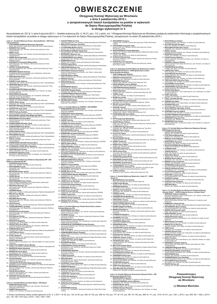 OBWIESZCZENIE Okręgowej Komisji Wyborczej we Wrocławiu z dnia 5 października 2015 r. o zarejestrowanych listach kandydatów na posłów w wyborach do Sejmu Rzeczypospolitej Polskiej w okręgu wyborczym nr 3 Na podstawie art. 221 § 1 z dnia 5 stycznia 2011 r. - Kodeks wyborczy (Dz. U. Nr 21, poz. 112, z późn. zm.1) Okręgowa Komisja Wyborcza we Wrocławiu podaje do wiadomości informację o zarejestrowanych listach kandydatów na posłów w okręgu wyborczym nr 3 w wyborach do Sejmu Rzeczypospolitej Polskiej, zarządzonych na dzień 25 października 2015 r. Lista nr 1, Komitet Wyborczy Prawo i Sprawiedliwość - KW Prawo i Sprawiedliwość 11. STACHOWIAK-RÓŻECKA Mirosława Agnieszka, 13. AUGUSTYŃSKI Iwo Piotr, 12. BABIARZ Piotr Łukasz, 15. LA FONTAINE Matthew Aaron, broker, zam. Wrocław; członek partii politycznej: Prawo i Sprawiedliwość. parlamentarzysta, zam. Wrocław; członek partii politycznej: Prawo i Sprawiedliwość. 13. ŚWIAT Jacek, specjalista marketingu, zam. Wrocław; członek partii politycznej: Prawo i Sprawiedliwość. 14. KEMPA Beata Agnieszka, prawnik, zam. Syców; członek partii politycznej: Solidarna Polska Zbigniewa Ziobro. 15. CZARNECKI Przemysław Maksymilian, parlamentarzysta, zam. Wrocław; członek partii politycznej: Prawo i Sprawiedliwość. 16. JAROCH Andrzej Stanisław, nauczyciel akademicki, zam. Wrocław; członek partii politycznej: Prawo i Sprawiedliwość. 17. BREZDEŃ Zdzisław Ireneusz, przedstawiciel władzy samorządowej, zam. Godzikowice; członek partii politycznej: Prawo i Sprawiedliwość. 18. SOIN Agnieszka Anna, nauczyciel akademicki, zam. Wrocław; członek partii politycznej: Partia Razem. 14. WIELICZKO Katarzyna Dominika, menedżer, zam. Wrocław; członek partii politycznej: Partia Razem. prawnik, zam. Wrocław; członek partii politycznej: Partia Razem. matematyk, zam. Wrocław; nie należy do partii politycznej. 17. BROWARNY Wojciech Jan, 19. WAŚKÓW Andrzej Piotr, 18. STANIOROWSKA Anna Maria, 26. KUBACKI Rafał Andrzej, 10. CAŁKO Paulina Stefania, 27. KURYŚ Hieronim Stanisław, 11. SOBIERAJ Sławomir Maciej, nauczyciel akademicki, zam. Wrocław; członek partii politycznej: Partia Razem. historyk sztuki, zam. Wrocław; członek partii politycznej: Partia Razem. 19. DEMBOWSKI Paweł, tłumacz, zam. Wrocław; członek partii politycznej: Partia Razem. 10. KRESKA Agata Maria, pracownik kancelaryjny, zam. Wrocław; członek partii politycznej: Partia Razem. 11. UNIEJEWSKI Bartosz Jan, politolog, zam. Kiełczówek; członek partii politycznej: Partia Razem. 12. PASTUSZKA Katarzyna Paulina, doradca do spraw rynku nieruchomości, zam. Bieruń; członek partii politycznej: Partia Razem. 13. GOŁOSZ Makary Stefan, urzędnik, zam. Wrocław; członek partii politycznej: Polskie Stronnictwo Ludowe. urzędnik, zam. Oleśnica; nie należy do partii politycznej. nauczyciel akademicki, zam. Wrocław; członek partii politycznej: Polskie Stronnictwo Ludowe. przedsiębiorca, zam. Smolec; członek partii politycznej: Polskie Stronnictwo Ludowe. Lista nr 6, Koalicyjny Komitet Wyborczy Zjednoczona Lewica SLD+TR+PPS+UP+Zieloni - KKW Zjednoczona Lewica SLD+TR+PPS+UP+Zieloni 11. TRACZ Małgorzata Elżbieta, filolog, zam. Wrocław; członek partii politycznej: „Zieloni”. kierownik do spraw sprzedaży, zam. Wrocław; nie należy do partii politycznej. audytor, zam. Wrocław; nie należy do partii politycznej. inżynier organizacji i planowania produkcji, zam. Wrocław; nie należy do partii politycznej. inżynier mechanik-technologia mechaniczna, zam. Wrocław; nie należy do partii politycznej. 12. FRANKIEWICZ Ewa Maria, architekt, zam. Malin; nie należy do partii politycznej. 13. LASKA Piotr Paweł, lekarz dentysta, zam. Wołów; nie należy do partii politycznej. 14. JACHYMCZYK Karolina Irena, dyrektor generalny, zam. Wrocław; nie należy do partii politycznej. 12. DOŁECKI Andrzej Dariusz, 15. KAŹMIERCZAK Adam, 13. MIROWSKI Dawid Jan, 16. TRZECIAK-WACH Karolina Paula, inżynier oprogramowania, zam. Wrocław; członek partii politycznej: Partia Razem. 14. KRUK-GRĘZIAK Joanna Elżbieta, 17. KUCHARSKI Janusz Paweł, nauczyciel, zam. Wrocław; członek partii politycznej: Partia Razem. 15. CIĄŻYŃSKI Bartłomiej Zygmunt, 18. CZERKAWSKA Agnieszka Beata, menedżer, zam. Wrocław; członek partii politycznej: Partia Razem. 16. WICHA Stanisław, 19. SROKA Rafał Marcin, student, zam. Wrocław; członek partii politycznej: Partia Razem. 17. TABISZ Jacek, pisarz, zam. Wrocław; nie należy do partii politycznej. 20. KUBIT Agnieszka, projektant baz danych, zam. Wrocław; członek partii politycznej: Partia Razem. grafik komputerowy, zam. Wrocław; członek partii politycznej: Partia Razem. nauczyciel akademicki, zam. Wrocław; członek partii politycznej: Prawo i Sprawiedliwość. 16. BAGNOWSKA Barbara, 12. ZIÓŁKOWSKI Aleksander, aktor, zam. Wrocław; nie należy do partii politycznej. 17. WACŁAWCZYK Mirosław Janusz, 25. GALIK Ewa Maria, animator kultury, zam. Psary; członek partii politycznej: Partia Razem. 15. SZNAJDER Michał, zawodowy działacz organizacji związkowej, zam. Wrocław; nie należy do partii politycznej. inżynier rolnik, zam. Wrocław; członek partii politycznej: Polskie Stronnictwo Ludowe. dyrektor sprzedaży, zam. Wrocław; nie należy do partii politycznej. 16. JACHIRA Klaudia Krystyna, 18. DONAJ Jolanta, ekonomista, zam. Wołów; członek partii politycznej: Prawo i Sprawiedliwość. 11. CALIŃSKA-MAYER Małgorzata Maria, 23. STACHURSKI Krzysztof Józef, 15. BUTLER Mariusz Robert, 24. BARTOSZEWICZ Urszula Agnieszka, 14. PIENIAS Gabriela, 10. JĘDRYSEK Mariusz Orion, urzędnik, zam. Jankowa; członek partii politycznej: Polskie Stronnictwo Ludowe. 16. RUTKOWSKA-DOBOSZ Izabela Ewa, ekspert prawa pracy, zam. Warszawa; członek partii politycznej: Prawica Rzeczypospolitej. 19. CIOŁEK Łukasz Tadeusz, 22. KRAJEWSKA Grażyna, plastyczka, zam. Wrocław; członek partii politycznej: Partia Razem. 17. KOSTUREK Bogdan Mare