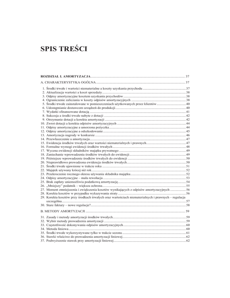 SPIS TREĝCI ROZDZIAà I. AMORTYZACJA........................................................................................................... 37 A. CHARAKTERYSTYKA OGÓLNA..................................................................................................... 37 1. 2. 3. 4. 5. 6. 7. 8. 9. 10. 11. 12. 13. 14. 15. 16. 17. 18. 19. 20. 21. 22. 23. 24. 25. 26. 27. 28. 29. ĝrodki trwaáe i wartoĞci niematerialne a koszty uzyskania przychodu ................................................. 37 Aktualizacja wartoĞci a koszt sprzedaĪy............................................................................................... 38 Odpisy amortyzacyjne kosztem uzyskania przychodów....................................................................... 38 Ograniczenie zaliczania w koszty odpisów amortyzacyjnych .............................................................. 38 ĝrodki trwaáe zainstalowane w pomieszczeniach uĪytkowanych przez klientów ................................. 40 UdostĊpnianie dostawcom urządzeĔ do produkcji................................................................................ 40 Wydatki sfinansowane dotacją ............................................................................................................. 41 Sukcesja a Ğrodki trwaáe nabyte z dotacji ............................................................................................. 42 Otrzymanie dotacji a korekta amortyzacji ............................................................................................ 42 Zwrot dotacji a korekta odpisów amortyzacyjnych .............................................................................. 44 Odpisy amortyzacyjne a umorzona poĪyczka....................................................................................... 44 Odpisy amortyzacyjne a odszkodowanie .............................................................................................. 45 Amortyzacja nagrody w konkursie ....................................................................................................... 46 Przewáaszczenie a amortyzacja............................................................................................................. 47 Ewidencja Ğrodków trwaáych oraz wartoĞci niematerialnych i prawnych............................................. 47 Formalne wymogi ewidencji Ğrodków trwaáych ................................................................................... 48 Wycena ewidencji skáadników majątku prywatnego ............................................................................ 49 Zaniechanie wprowadzenia Ğrodków trwaáych do ewidencji ................................................................ 49 PóĨniejsze wprowadzenie Ğrodków trwaáych do ewidencji .................................................................. 50 Nieprawidáowo prowadzona ewidencja Ğrodków trwaáych................................................................... 50 ĝrodki trwaáe ujawnione w trakcie roku ............................................................................................... 51 Majątek uĪywany krócej niĪ rok........................................................................................................... 52 Przekroczenie rocznego okresu uĪywania skáadnika majątku............................................................... 52 Odpisy amortyzacyjne – maáa rewolucja .............................................................................................. 53 Brak zapáaty uniemoĪliwia podatkową amortyzacjĊ............................................................................. 54 „Mniejszy” podatnik – wiĊksza ochrona............................................................................................... 55 Moment zmniejszenia i zwiĊkszenia kosztów wynikających z odpisów amortyzacyjnych .................. 56 Korekta kosztów w przypadku wykazywania straty ............................................................................. 56 Korekta kosztów przy Ğrodkach trwaáych oraz wartoĞciach niematerialnych i prawnych – regulacja szczególna............................................................................................................................................. 57 30. Stare faktury – nowe regulacje?............................................................................................................ 58 B. METODY AMORTYZACJI ................................................................................................................. 59 31. 32. 33. 34. 35. 36. 37. Zasady i metody amortyzacji Ğrodków trwaáych................................................................................... 59 Wybór metody prowadzenia amortyzacji ............................................................................................. 59 CzĊstotliwoĞü dokonywania odpisów amortyzacyjnych ....................................................................... 60 Metoda liniowa ..................................................................................................................................... 60 ĝrodki trwaáe wykorzystywane tylko w trakcie sezonu ........................................................................ 61 Stawki wáaĞciwe do prowadzenia amortyzacji liniowej........................................................................ 62 PodwyĪszenie stawek przy amortyzacji liniowej.................................................................................. 62 6 38. 39. 40. 41. 42. 43. 44. 45. 46. 47. 48. 49. 50. 51. 52. 53. 54. 55. 56. 57. 58. 59. 60. 61. 62. 63. 64. 65. 66. 67. 68. 69. 70. 71. 72. 73. 74. 75. 76. 77. 78. Warunki záe i pogorszone ..................................................................................................................... 63 Maszyny uĪywane bardziej intensywnie................................................................