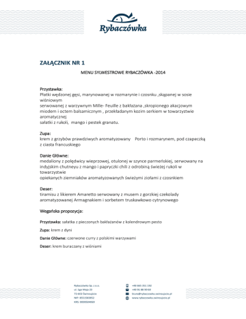 ZAŁĄCZNIK NR 1 MENU SYLWESTROWE RYBACZÓWKA -2014 Przystawka: Płatki wędzonej gęsi, marynowanej w rozmarynie i czosnku ,skąpanej w sosie wiśniowym serwowanej z warzywnym Mille- Feuille z bakłażana ,skropionego akacjowym miodem i octem balsamicznym , przekładanym kozim serkiem w towarzystwie aromatycznej sałatki z rukoli, mango i pestek granatu. Zupa: krem z grzybów prawdziwych aromatyzowany Porto i rozmarynem, pod czapeczką z ciasta francuskiego Danie Główne: medaliony z polędwicy wieprzowej, otulonej w szynce parmeńskiej, serwowany na indyjskim chutneyu z mango i papryczki chili z odrobiną świeżej rukoli w towarzystwie opiekanych ziemniaków aromatyzowanych świeżymi ziołami z czosnkiem Deser: tiramisu z likierem Amaretto serwowany z musem z gorzkiej czekolady aromatyzowanej Armagnakiem i sorbetem truskawkowo cytrynowego Wegańska propozycja: Przystawka: sałatka z pieczonych bakłażanów z kolendrowym pesto Zupa: krem z dyni Danie Główne: czerwone curry z polskimi warzywami Deser: krem buraczany z wiśniami Rybaczówka Sp. z o.o. +48 665 351 192 ul. 1go Maja 23 +48 91 88 90 60 72-602 Świnoujście [email protected] NIP: 8551583852 www.rybaczowka.swinoujscie.pl KRS: 0000504069 Zimny bufet : 1.sałaty i sałatki a) sałata dębolistna z warzywami sezonowymi , gęsimi polędwiczkami z grilla w towarzystwie sosu z lawendy b) mix sałat i warzyw z melonem, pomarańczą i winogronem z grillowanym sandaczem, polana cytrusowym vinaigrette c) sałatka „VERDURA MISTA”(marynowane i grillowane warzywa w asyście ziół i czosnku , skąpane w oliwie z oliwek z dodatkiem białego octu balsamico) a) b) c) d) e) 2.zimne przekąski pescaccio z kiszonego łososia polane oliwa truflowa z piórkami kopru włoskiego z płatkami sera Bursztyn tatar ze śledzia matjas z pomarańczą ,na łódeczce z jabłek krewetki Black Tiger na salsie z papryki i mango podane w foremkach z ciasta kruchego deska mięs pieczystych , rolad i pasztetów własnego wyrobu z zimnymi sosami ryby wędzone : leszcz, lin, karp, miętus 3.dania gorące a) rolada z indyka nadziewana brokułami serwowana na sosie winnym Borgo Dei Vassali z kawałkami brzoskwiń b) warzywa parowane w maśle cytrynowo czosnkowym z prażonymi migdałami c) pikantny ryż w rytmie flamenco PO 24:00 a) Dzik w sosie z wędzonych śliwek , zapiekane z tymiankiem i czosnkiem ziemniaczki b) Dla wegan: kaszotto z kaszy pęczak z grzybem prawdziwym i rozmarynem Ponadto wybór ciast, ciasteczek, świeżych owoców: o sernik o szarlotka o tartaletki z owocami i galaretką o ciasto z makiem o ciastka kruche o patery świeżych owoców Rybaczówka Sp. z o.o. +48 665 351 192 ul. 1go Maja 23 +48 91 88 90 60 72-602 Świnoujście [email protected] NIP: 8551583852 www.rybaczowka.swinoujscie.pl KRS: 0000504069 Rybaczówka Sp. z o.o. +48 665 351 192 ul. 1go Maja 23 +48 91 88 90 60 72-602 Świnoujście [email protected] NIP: 8551583852 www.rybaczowka.swinoujscie.pl KRS: 0000504069
