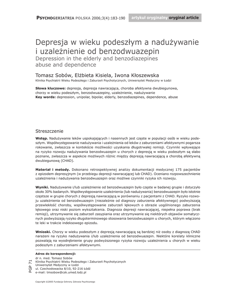 PSYCHOGERIATRIA POLSKA 2006;3(4):183-190 artykuł oryginalny oryginal article Depresja w wieku podeszłym a nadużywanie i uzależnienie od benzodwuazepin Depression in the elderly and benzodiazepines abuse and dependence Tomasz Sobów, Elżbieta Kisiela, Iwona Kłoszewska Klinika Psychiatrii Wieku Podeszłego i Zaburzeń Psychotycznych, Uniwersytet Medyczny w Łodzi Słowa kluczowe: depresja, depresja nawracająca, choroba afektywna dwubiegunowa, chorzy w wieku podeszłym, benzodwuazepiny, uzależnienie, nadużywanie Key words: depression, unipolar, bipolar, elderly, benzodiazepines, dependence, abuse Streszczenie Wstęp. Nadużywanie leków uspokajających i nasennych jest częste w populacji osób w wieku podeszłym. Współwystępowanie nadużywania i uzależnienia od leków z zaburzeniami afektywnymi pogarsza rokowanie, zwłaszcza w kontekście możliwości uzyskania długotrwałej remisji. Czynniki wpływające na ryzyko rozwoju nadużywania benzodwuazepin u chorych z depresją w wieku podeszłym są słabo poznane, zwłaszcza w aspekcie możliwych różnic między depresją nawracającą a chorobą afektywną dwubiegunową (CHAD). Materiał i metody. Dokonano retrospektywnej analizy dokumentacji medycznej 175 pacjentów z epizodem depresyjnym (w przebiegu depresji nawracającej lub CHAD). Oceniano rozpowszechnienie uzależnienia i nadużywania benzodwuazepin oraz możliwe czynniki ryzyka ich rozwoju. Wyniki. Nadużywanie i/lub uzależnienie od benzodwuazepin było częste w badanej grupie i dotyczyło około 30% badanych. Współwystępowanie uzależnienia (lub nadużywania) benzodwuazepin było istotnie częstsze w grupie chorych z depresją nawracającą w porównaniu z pacjentami z CHAD. Ryzyko rozwoju uzależnienia od benzodwuazepin (niezależnie od diagnozy zaburzenia afektywnego) podwyższają przewlekłość choroby, współwystępowanie zaburzeń lękowych o obrazie uogólnionego zaburzenia lękowego oraz niski poziom wykształcenia. Diagnoza depresji nawracającej, niepełna poprawa (brak remisji), utrzymywanie się zaburzeń zasypiania oraz utrzymywanie się niektórych objawów somatycznych podwyższają ryzyko długoterminowego stosowania benzodwuazepin u chorych, którym włączono te leki w trakcie indeksowego epizodu. Wnioski. Chorzy w wieku podeszłym z depresją nawracającą są bardziej niż osoby z diagnozą CHAD narażeni na ryzyko nadużywania i/lub uzależnienia od benzodwuazepin. Niektóre korelaty kliniczne pozwalają na wyodrębnienie grupy podwyższonego ryzyka rozwoju uzależnienia u chorych w wieku podeszłym z zaburzeniami afektywnymi. PGP 71 Adres do korespondencji: dr n. med. Tomasz Sobów Klinika Psychiatrii Wieku Podeszłego i Zaburzeń Psychotycznych Uniwersytet Medyczny w Łodzi ul. Czechosłowacka 8/10, 92-216 Łódź e-mail: [email protected] Copyright ©2005 Fundacja Ochrony Zdrowia Psychicznego 184 Sobów i wsp.: Depresja a nadużywanie i uzależnienie od benzodiazepin Summary Indroduction. Benzodiazepines abuse and/or dependence is common in the elderly. Prognosis in depressed elderly, particularly the chance of long-term remission, is severely compromised in those with co-morbid drug dependence or abuse. Factors influencing the risk of drug abuse and dependence in the depressed elderly (including differences between unipolar and bipolar cases) are poorly understood. Material and methods. A retrospective medical charts analysis has been done to assess the prevalence and clinical correlates of benzodiazepines abuse and dependence in 175 depressed (unipolar and bipolar), hospitalized elderly. Results. Benzodiazepines abuse or dependence was common in the cohort of interest and amounted to 30% of cases. Unipolar depressed subjects were at higher risk than their bipolar counterparts. The risk of drug abuse or dependence was higher in patients with chronic affective illness, co-morbid generalized anxiety disorder and less educated. The risk of long-term use of benzodiazepines in subjects who started them during index episode was higher in unipolars, those without remission, sleeping disorders and somatic complaints. Conclusions. Unipolar depression raises the risk of benzodiazepine abuse or dependence more than bipolar depression. Based on the presence of several clinical correlates, it is possible to characterize a group of subjects with higher risk of developing benzodiazepine dependence or their long-term use. Wstęp Stosowanie benzodwuazepin przez osoby w wieku podeszłym jest bardzo częste. Dane z badań epidemiologicznych wskazują, że pacjenci po 65. roku życia otrzymują ponad jedną czwartą wszystkich recept na benzodwuazepiny [1, 2]. Ponadto w przeciwieństwie do osób młodszych stosowanie benzodwuazepin w grupie wiekowej powyżej 65. roku życia jest często przewlekłe, a wskazania do kontynuacji zaleceń rzadziej oceniane i weryfikowane w toku terapii [3, 4]. Wśród czynników ryzyka długotrwałego stosowania benzodwuazepin u chorych w wieku podeszłym wymienia się starszy wiek, płeć żeńską, niższy poziom wykształcenia, liczne hospitalizacje (także niepsychiatryczne) lub przebywanie w ośrodkach opiekuńczych oraz korzystanie z porad wielu lekarzy [5-7]. Chorzy w wieku podeszłym z zaburzeniami afektywnymi (zwłaszcza depresją) stanowią grupę ryzyka długotrwałego stosowania benzodwuazepin, a czynnikami sprzyjającymi długotrwałemu stosowaniu i nadużywaniu benzodwuazepin są współistniejące zaburzenia lękowe (nawet niespełniające pełnych kryteriów diagnostycznych), zaburzenia snu (zwłaszcza zasypiania) oraz starszy wiek i płeć żeńska [7-8]. Związki między diagnozą choroby afektywnej dwubiegunowej u pacjentów w wieku podeszłym a stosowaniem benzodwuazepin są słabo zbadane, choć zwłaszcza w ostrej fazie choroby leki te są powszechnie stosowane. W pracy podjęliśmy próbę oceny częstości występowania oraz korelatów klinicznych uzależnienia i nadużywania benzodwuazepin w grupie hospi