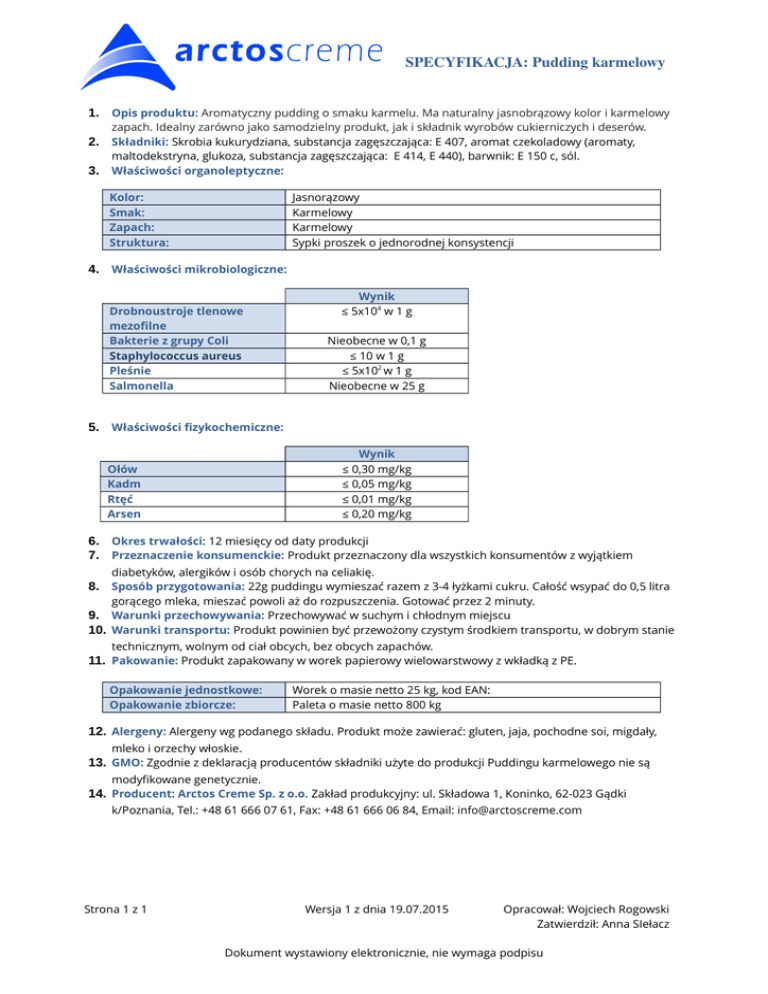 SPECYFIKACJA: Pudding karmelowy 1. Opis produktu: Aromatyczny pudding o smaku karmelu. Ma naturalny jasnobrązowy kolor i karmelowy zapach. Idealny zarówno jako samodzielny produkt, jak i składnik wyrobów cukierniczych i deserów. 2. Składniki: Skrobia kukurydziana, substancja zagęszczająca: E 407, aromat czekoladowy (aromaty, maltodekstryna, glukoza, substancja zagęszczająca: E 414, E 440), barwnik: E 150 c, sól. 3. Właściwości organoleptyczne: Kolor: Smak: Zapach: Struktura: Jasnorązowy Karmelowy Karmelowy Sypki proszek o jednorodnej konsystencji 4. Właściwości mikrobiologiczne: Drobnoustroje tlenowe mezofilne Bakterie z grupy Coli Staphylococcus aureus Pleśnie Salmonella Wynik ≤ 5x104 w 1 g Nieobecne w 0,1 g ≤ 10 w 1 g ≤ 5x102 w 1 g Nieobecne w 25 g 5. Właściwości fizykochemiczne: Wynik ≤ 0,30 mg/kg ≤ 0,05 mg/kg ≤ 0,01 mg/kg ≤ 0,20 mg/kg Ołów Kadm Rtęć Arsen 6. Okres trwałości: 12 miesięcy od daty produkcji 7. Przeznaczenie konsumenckie: Produkt przeznaczony dla wszystkich konsumentów z wyjątkiem diabetyków, alergików i osób chorych na celiakię. 8. Sposób przygotowania: 22g puddingu wymieszać razem z 3-4 łyżkami cukru. Całość wsypać do 0,5 litra gorącego mleka, mieszać powoli aż do rozpuszczenia. Gotować przez 2 minuty. 9. Warunki przechowywania: Przechowywać w suchym i chłodnym miejscu 10. Warunki transportu: Produkt powinien być przewożony czystym środkiem transportu, w dobrym stanie technicznym, wolnym od ciał obcych, bez obcych zapachów. 11. Pakowanie: Produkt zapakowany w worek papierowy wielowarstwowy z wkładką z PE. Opakowanie jednostkowe: Opakowanie zbiorcze: Worek o masie netto 25 kg, kod EAN: Paleta o masie netto 800 kg 12. Alergeny: Alergeny wg podanego składu. Produkt może zawierać: gluten, jaja, pochodne soi, migdały, mleko i orzechy włoskie. 13. GMO: Zgodnie z deklaracją producentów składniki użyte do produkcji Puddingu karmelowego nie są modyfikowane genetycznie. 14. Producent: Arctos Creme Sp. z o.o. Zakład produkcyjny: ul. Składowa 1, Koninko, 62-023 Gądki k/Poznania, Tel.: +48 61 666 07 61, Fax: +48 61 666 06 84, Email: [email protected] Strona 1 z 1 Wersja 1 z dnia 19.07.2015 Opracował: Wojciech Rogowski Zatwierdził: Anna SIełacz Dokument wystawiony elektronicznie, nie wymaga podpisu