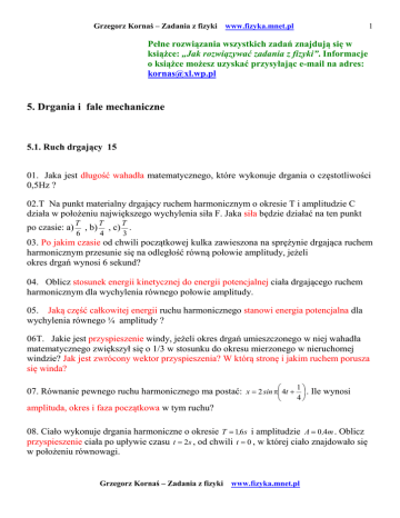 Grzegorz Kornaś – Zadania z fizyki www.fizyka.mnet.pl 1 Pełne rozwiązania wszystkich zadań znajdują się w książce: „Jak rozwiązywać zadania z fizyki”. Informacje o książce możesz uzyskać przysyłając e-mail na adres: [email protected] 5. Drgania i fale mechaniczne 5.1. Ruch drgający 15 01. Jaka jest długość wahadła matematycznego, które wykonuje drgania o częstotliwości 0,5Hz ? 02.T Na punkt materialny drgający ruchem harmonicznym o okresie T i amplitudzie C działa w położeniu największego wychylenia siła F. Jaka siła będzie działać na ten punkt po czasie: a) T T T , b) , c) . 6 4 3 03. Po jakim czasie od chwili początkowej kulka zawieszona na sprężynie drgająca ruchem harmonicznym przesunie się na odległość równą połowie amplitudy, jeżeli okres drgań wynosi 6 sekund? 04. Oblicz stosunek energii kinetycznej do energii potencjalnej ciała drgającego ruchem harmonicznym dla wychylenia równego połowie amplitudy. 05. Jaką część całkowitej energii ruchu harmonicznego stanowi energia potencjalna dla wychylenia równego ¼ amplitudy ? 06T. Jakie jest przyspieszenie windy, jeżeli okres drgań umieszczonego w niej wahadła matematycznego zwiększył się o 1/3 w stosunku do okresu mierzonego w nieruchomej windzie? Jak jest zwrócony wektor przyspieszenia? W którą stronę i jakim ruchem porusza się winda? 1 07. Równanie pewnego ruchu harmonicznego ma postać: x = 2 sin π 4t + . Ile wynosi amplituda, okres i faza początkowa w tym ruchu? 4 08. Ciało wykonuje drgania harmoniczne o okresie T = 1,6s i amplitudzie A = 0,4m . Oblicz przyspieszenie ciała po upływie czasu t = 2s , od chwili t = 0 , w której ciało znajdowało się w położeniu równowagi. Grzegorz Kornaś – Zadania z fizyki www.fizyka.mnet.pl Grzegorz Kornaś – Zadania z fizyki www.fizyka.mnet.pl 2 O 09. Oblicz okres drgań wahadła utworzonego z cienkiej obręczy o promieniu r = 5cm zawieszonej na ostrzu, jak na rysunku obok. C r 10. Pod sufitem wagonu kolejowego zawieszono wahadło o długości l = 50cm . Przy jakiej szybkości pociągu (w km/h) wahadło wpadnie w rezonans, jeżeli szyny mają długość s = 12 ,5m ? 11. Punkt materialny drga ruchem harmonicznym. Wychylenie w chwili początkowej jest równe zero, amplituda drgań wynosi A, a okres drgań T. W jakiej odległości od położenia równowagi i po upływie jakiego najkrótszego czasu energia kinetyczna tego punktu jest równa jego energii potencjalnej? 12. Zawieszony na sprężynie odważnik o masie m = 400g wykonuje drgania o okresie T 1 = 2s. Gdy na tej samej sprężynie zawieszono inny odważnik, to jego okres drgań wzrósł do T 2 = 3s. Oblicz masę drugiego odważnika. 13. Drgania klocka o masie m = 100g opisuje równanie x = 0, 085 ⋅ sin π 0,8t + całkowita energia tego klocka? 5 . Ile wynosi 12 14. Punkt materialny porusza się ruchem jednostajnym po okręgu o promieniu 0,2m z częstotliwością 3Hz. W jakiej fazie ruchu rzut tego punktu na średnicę okręgu ma szybkość 1m/s? Ile wynosi przyspieszenie w tej fazie? 15. Cienki pręt o długości L zawieszono tak, że może się obracać wokół osi prostopadłej do niego i przechodzącej przez jego koniec. Oblicz okres drgań i długość zredukowaną otrzymanego wahadła fizycznego. 5.2 Fale mechaniczne 10 01. Odległość między grzbietami fal na morzu wynosi 10m. Z jaką szybkością rozchodzą się fale, jeśli uderzają o brzeg 12 razy na minutę? 02.T Jaka jest maksymalna szybkość cząsteczek drgających na powierzchni wody, gdy rozchodzi się fala sinusoidalna o amplitudzie 25cm i długości 2m? Szybkość rozchodzenia się fali wynosi 1m/s. Grzegorz Kornaś – Zadania z fizyki www.fizyka.mnet.pl Grzegorz Kornaś – Zadania z fizyki www.fizyka.mnet.pl 3 03. Fala dźwiękowa rozchodząca się w powietrzu z szybkością 330m/s wchodzi do wody, gdzie jej szybkość wynosi 1450m/s. Jaki jest stosunek długości fali w wodzie do długości fali w powietrzu? 04.T Z dwóch źródeł drgających w identyczny sposób wychodzą fale o długości 1m, które do miejsca spotkania przebywają drogi s 1 i s 2 . Co zaobserwujemy w miejscu spotkania fal gdy: a) s 1 =5,5m a s 2 =3m, b) s 1 =6m a s 2 =4m, c) s 1 =2m a s 2 =3,25m? 05. Fala poprzeczna biegnąca wzdłuż gumowej linki jest opisana równaniem: π y = 10 sin 2πt − x gdzie y i x wyrażone są w centymetrach, a t w sekundach. Oblicz 10 a) szybkość rozchodzenia się fali i b) szybkość cząstek sznura w chwili przechodzenia przez położenie równowagi. 06. Ile razy zmieni się długość fali dźwiękowej przy przejściu z powietrza do wody? Fala dźwiękowa rozchodzi się w powietrzu z szybkością 330m / s , a w wodzie z szybkością 1450m / s . 07. Głośnik o mocy 50W emituje kulistą falę dźwiękową. W odległości 4m od głośnika znajduje się otwarte okno o powierzchni 2m2. Jaką energię dostarcza fala do mieszkania przez otwarte okno w czasie 1 minuty? 08. Fala płaska, padająca na granicę dwóch ośrodków pod kątem α =600, ulega załamaniu, a kąt załamania wynosi β = 300. Szybkość fali w pierwszym ośrodku v 1 =27m/s. Jaka jest szybkość fali w drugim ośrodku? 09. Oblicz różnicę faz drgań dwóch punktów ośrodka odległych o x 1 = 8m i x 2 = 14m od źródła fali płaskiej o okresie drgań równym T = 0,04s. Fala rozchodzi się z szybkością v = 300m/s. 10. W chwili t = T/6 wychylenie punktu P znajdującego się w odległości x = 2cm od źródła fali jest równe połowie amplitudy. Punkt P jest leżącym najbliżej źródła punktem o takim wychyleniu. Oblicz długość fali emitowanej przez źródło. Akustyka 8 11. W jakiej odległości znajduje się robotnik uderzający młotem w szynę kolejową, jeżeli przykładając ucho do szyny usłyszymy dźwięk o 1 sekundę wcześniej niż w powietrzu? Szybkość rozchodzenia się dźwięku w powietrzu wynosi 330m/s, a w stali 5000m/s. Grzegorz Kornaś – Zadania z fizyki www.fizyka.mnet.pl Grzegorz K