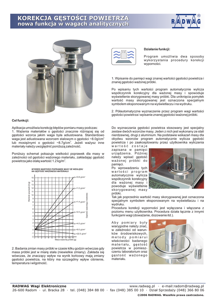 KOREKCJA GĘSTOŚCI POWIETRZA nowa funkcja w wagach analitycznych Działanie funkcji: Program umożliwia dwa sposoby wykorzystania procedury korekcji wyporności. 1. Wpisanie do pamięci wagi znanej wartości gęstości powietrza i znanej gęstości ważonej próbki. Po wpisaniu tych wartości program automatycznie wylicza współczynnik korekcyjny dla ważonej masy i spowoduje wyświetlenie skorygowanej masy próbki. Dla uniknięcia pomyłek wartość masy skorygowanej jest oznaczona specjalnym symbolem eksponowanym na wyświetlaczu i na wydruku. 2. Półautomatyczne wyznaczenie przez program wagi wartości gęstości powietrza i wpisanie znanej gęstości ważonej próbki. Cel funkcji: Aplikacja umożliwia korekcję błędów pomiaru masy podczas: 1. Ważenia materiałów o gęstości znacznie różniącej się od gęstości wzorca jakim waga była adiustowana. Standardowo waga jest adiustowana wzorcem stalowym o gęstości ~8.0g/cm3 lub mosiężnymi o gęstości ~8.7g/cm3. Jeżeli ważysz inne materiały należy uwzględnić poniższą zależność. Poniższy schemat pokazuje wielkości poprawek dla masy w zależności od gęstości ważonego materiału, zakładając gęstość powietrza jako stałą wartość 1.2 kg/m3. WYKRES WARTOŚCI POPRAWEK MASY ZE WZGLĘDU NA GĘSTOŚĆ WAŻONEGO MATERIAŁU ρW=0.8 g/cm3 14 13 ρW=1.0 g/cm3 12 11 10 9 ρW=1.4 g/cm3 8 7 6 ρW=2.0 g/cm3 5 4 Gęstość ważonego materiału Wartość poprawki [mg] 15 Do wyznaczania gęstości powietrza stosowany jest specjalny zestaw dwóch wzorców masy. Jeden z nich jest wykonany ze stali nierdzewnej, drugi z aluminium. Na podstawie wskazań masy dla obydwu wzorców program automatycznie wylicza gęstość powietrza i po zaakceptowaniu przez użytkownika wyliczenia wartość zostaje zapisana w pamięci urządzenia. Później należy wpisać gęstość ważonej próbki do pamięci. Po wprowadzeniu tych wartości program automatycznie wylicza współczynnik korekcyjny dla ważonej masy i powoduje wyświetlenie skorygowanej masy próbki. Tak jak poprzednio wartość masy skorygowanej jest oznaczona specjalnym symbolem eksponowanym na wyświetlaczu i na wydruku. Procedura korekcji wyporności jest wyłączana i włączana z poziomu menu użytkownika. Procedura działa łącznie z innymi funkcjami wagi (doważanie, dozowanie itd.). 3 2 ρW=4.0 g/cm3 1 ρW=8.0 g/cm3 0 -1 -2 0 ρW=22.5 g/cm3 1 2 3 4 5 6 7 8 9 10 11 Masa ważonej próbki [g] 2. Badania zmian masy próbki w czasie kilku godzin wówczas gdy masa próbki jest w miarę stała (niewielkie zmiany). Zakłada się wówczas, że znaczący wpływ na wynik końcowy mają zmiany gęstości powietrza, na który ma szczególny wpływ ciśnienie, temperatura i wilgotność. Aby pomiary były wiarygodne należy znać, w zależności od warunków środowiskowych, metody pomiarui właściwości badanego materiału, gęstość powietrza w pomieszczeniu laboratorium oraz gęstość ważonego materiału. RADWAG Wagi Elektroniczne www.radwag.pl · e-mail:[email protected] 26-600 Radom · ul. Bracka 28 · tel. (048) 384 88 00 · fax (048) 385 00 10 · Dział Sprzedaży (048) 366 80 06 ©2006 RADWAG. Wszelkie prawa zastrzeżone.
