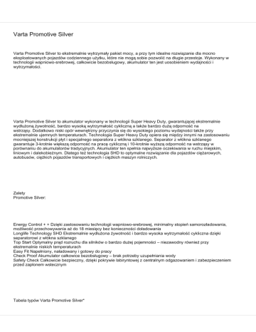 Varta Promotive Silver Varta Promotive Silver to ekstremalnie wytrzymały pakiet mocy, a przy tym idealne rozwiązanie dla mocno eksploatowanych pojazdów codziennego użytku, które nie mogą sobie pozwolić na długie przestoje. Wykonany w technologii wapniowo-srebrowej, całkowicie bezobsługowy, akumulator ten jest uosobieniem wydajności i wytrzymałości. Varta Promotive Silver to akumulator wykonany w technologii Super Heavy Duty, gwarantującej ekstremalnie wydłużoną żywotność, bardzo wysoką wytrzymałość cykliczną a także bardzo dużą odporność na wstrząsy. Dodatkowo niski opór wewnętrzny przyczynia się do wysokiego poziomu wydajności także przy ekstremalnie ujemnych temperaturach. Technologia Super Heavy Duty opiera się między innymi na zastosowaniu mocniejszej konstrukcji płyt i specjalnego separatora z włókna szklanego. Separator z włókna szklanego gwarantuje 3-krotnie większą odporność na pracę cykliczną i 10-krotnie wyższą odporność na wstrząsy w porównaniu do akumulatorów tradycyjnych. Akumulator ten spełnia najwyższe oczekiwania w ruchu miejskim, liniowym i dalekobieżnym. Dlatego też technologia SHD to optymalne rozwiązanie dla pojazdów ciężarowych, autobusów, ciężkich pojazdów transportowych i ciężkich maszyn rolniczych. Zalety Promotive Silver: Energy Control + + Dzięki zastosowaniu technologii wapniowo-srebrowej, minimalny stopień samorozładowania, możliwość przechowywania aż do 18 miesięcy bez konieczności doładowania Longlife Technology SHD Ekstremalnie wydłużona żywotność i bardzo wysoka wytrzymałość cykliczna dzięki separatorowi z włókna szklanego Top Start Optymalny prąd rozruchu dla silników o bardzo dużej pojemności – niezawodny również przy ekstremalnie niskich temperaturach Easy Fit Napełniony, naładowany i gotowy do pracy Check Proof Akumulator całkowice bezobsługowy – brak potrzeby uzupełniania wody Safety Check Całkowicie bezpieczny, dzięki pokrywie labiryntowej z centralnym odgazowaniem i zabezpieczeniem przed zapłonem wstecznym Tabela typów Varta Promotive Silver* Typ akumulatora Prąd rozruchu [A] Wymiary [mm] Układ biegunów** dł. szer. wys. Varta Promotive Silver145 Ah 800 513 189 223 L+ Varta Promotive Silver 180 Ah 1000 513 223 223 L+ Varta Promotive Silver225 Ah 1150 518 276 242 L+ * (więcej szczegółów można znaleźć w katalogu Varta Promotive) ** L+ (lewy plus)