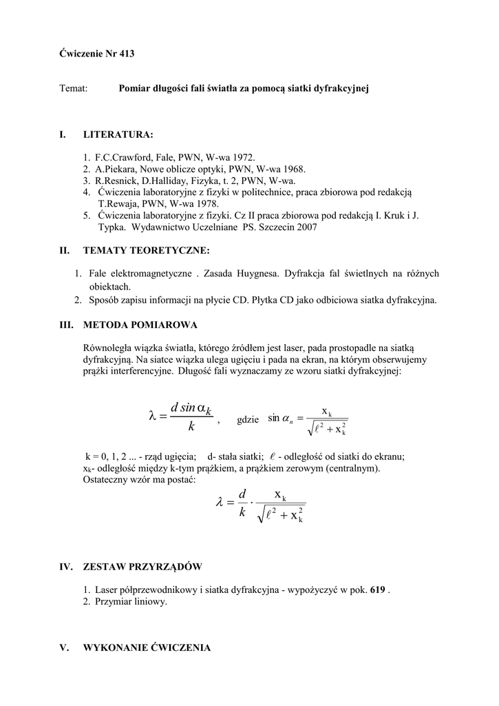 Ćwiczenie Nr 413 Temat: I. Pomiar długości fali światła za pomocą siatki dyfrakcyjnej LITERATURA: 1. 2. 3. 4. F.C.Crawford, Fale, PWN, W-wa 1972. A.Piekara, Nowe oblicze optyki, PWN, W-wa 1968. R.Resnick, D.Halliday, Fizyka, t. 2, PWN, W-wa. Ćwiczenia laboratoryjne z fizyki w politechnice, praca zbiorowa pod redakcją T.Rewaja, PWN, W-wa 1978. 5. Ćwiczenia laboratoryjne z fizyki. Cz II praca zbiorowa pod redakcją I. Kruk i J. Typka. Wydawnictwo Uczelniane PS. Szczecin 2007 II. TEMATY TEORETYCZNE: 1. Fale elektromagnetyczne . Zasada Huygnesa. Dyfrakcja fal świetlnych na różnych obiektach. 2. Sposób zapisu informacji na płycie CD. Płytka CD jako odbiciowa siatka dyfrakcyjna. III. METODA POMIAROWA Równoległa wiązka światła, którego źródłem jest laser, pada prostopadle na siatką dyfrakcyjną. Na siatce wiązka ulega ugięciu i pada na ekran, na którym obserwujemy prążki interferencyjne. Długość fali wyznaczamy ze wzoru siatki dyfrakcyjnej: d sin k k , gdzie sin n xk 2 x 2k k = 0, 1, 2 ... - rząd ugięcia; d- stała siatki; - odległość od siatki do ekranu; xk- odległość między k-tym prążkiem, a prążkiem zerowym (centralnym). Ostateczny wzór ma postać: xk d k 2 x 2k IV. ZESTAW PRZYRZĄDÓW 1. Laser półprzewodnikowy i siatka dyfrakcyjna - wypożyczyć w pok. 619 . 2. Przymiar liniowy. V. WYKONANIE ĆWICZENIA 1. Umocować obudowę z laserem i siatką w statywie. 2. Włączyć laser i ustawić go prostopadle do ekranu na takiej wysokości, aby prążki były widoczne na tle skali. 3. Zmierzyć odległość " " między siatką dyfrakcyjną a ekranem. 4. Zmierzyć odległości xk prążków I, II i III rzędu (rząd prążka k=1, 2, 3) na prawo i na lewo od prążka centralnego (k=0). 5. Pomiary powtórzyć dla trzech różnych odległości " " między siatką a ekranem. 6. Wyniki zestawić w tabelce: [m] k u (k )[ nm] k [nm] x [m] 1 2 3 1 2 3 1 2 3 [nm] 7. Wyznaczyć niepewności wyznaczenia długości fali korzystając ze wzoru: u ( k ) k x k 2 u 2 ( x k ) k u 2 (l ) l 2 2 x2 l x d 1 u 2 ( x k ) 1 k2 2 k u 2 (l ) k z z z we wzorze tym oznaczono (x k ) 2 (l ) 2 ; u 2 (l ) . z xk2 l 2 ; u 2 ( x k ) 3 3 x k - niepewność wyznaczenia odległości x; l - niepewność wyznaczenia odległości l 2 8. Średnią długość fali (ze względu na różną dokładność poszczególnych pomiarów) należy obliczyć jako średnią arytmetyczną ważoną: w w i i i 1 2 2 ... 2 n u (1 ) u (2 ) u ( n ) 2 1 1 1 2 ... 2 u (1 ) u (2 ) u ( n ) 2 gdzie n liczba pomiarów 9. Obliczyć niepewność średniej ważonej u : 1 1 u ( ) 1 1 1 wi 2 ... 2 2 u (1 ) u (2 ) u ( n ) 10. Wynik końcowy przestawić jako u . [Np. x=71(5) oznacza, że x 71 a u ( x ) 5 ] Ćwiczenie 413a. Temat: Wyznaczenie odległości między ścieżkami zapisu na płycie CD i oszacowanie rozmiarów obszaru wykorzystywanego do zapisu jednego bitu informacji. I. TEMATY TEORETYCZNE. 1. Sposób zapisu informacji na płycie CD. 2. Płytka CD jako odbiciowa siatka dyfrakcyjna. 3. Instrukcja obsługi suwmiarki: http://labor.zut.edu.pl/INSTRUKCJE/Suwmiarka.pdf Typowy krążek CD można potraktować jak odbiciową siatkę dyfrakcyjną. Stała tej siatki odpowiada odległości między ścieżkami z zapisaną informacją. Ścieżki te mają kształt współśrodkowych okręgów. Każda zapisana ścieżka składa się z odcinków bardzo dobrze odbijających światło (nie zapisanych) oraz słabo odbijających światło (zapisanych). Pierwszy z nich odpowiada logicznemu zeru, drugi logicznej jedynce. Informacje na płycie zapisane są w postaci cyfrowej w systemie binarnym (dwójkowym) i powstają np. w procesie wypalania określonych obszarów promieniem lasera (w domowych nagrywarkach płyt). II. METODA POMIAROWA. Znając długość fali światła używanego lasera (wyznaczoną w I części ćwiczenia) można wyznaczyć stałą siatki dyfrakcyjnej, jaką jest w tym wypadku płytka CD. Metoda pomiaru jest podobna jak poprzednio, lecz tym razem dyfrakcji ulega światło odbite od siatki, a nie przechodzące przez siatkę. Dlatego laser umieścimy tym razem przy ścianie (wykorzystywanej tu jako ekran) i oświetlimy nim umocowaną w statywie badaną płytkę. Na ścianie powstaje obraz dyfrakcyjny w postaci prążków. Wyraźne są prążki zerowego i pierwszego rzędu i tylko te będziemy badać. Wyprowadzenie wzoru: 1. Będziemy mierzyć: - odległość między płytką a ekranem (odcinek l) oraz - odległość między prążkami pierwszego rzędu a prążkiem zerowym (odcinki x). 2. Wyznaczymy sinus kąta α, a z wzoru siatki dyfrakcyjnej (dla k=1) stałą siatki d (czyli odległość między ścieżkami): d 1 l 2 x2 sin x 3. Liczbę ścieżek n wyznaczymy dzieląc szerokość używanego do zapisu obszaru Δr przez stałą siatki d. n r r2 r1 d d (r1 i r2 to promienie wewnętrznej i zewnętrznej część obszaru z danymi- patrz rysunek obok). 4. Obliczymy teraz średnią długość jednej ścieżki s, przyjmując średni promień r r ścieżki jako r 2 1 2 Wtedy: s 2 r 5. Całkowitą długość y wszystkich ścieżek obliczymy jako iloczyn długości jednej ścieżki s i liczby wszystkich ścieżek n: y= n .s 6. Typowa płytka CD ma pojemność 650Mb informacji. Oznacza to, że można na niej pomieścić : m 650 1024 1024 8 5452595200 5,5 109 bitów informacji. (Jeden 1MB to 1024kB, 1kB to 1024 bajty, a 1 bajt to 8 bitów) 7. Dzieląc długość wszystkich ścieżek y przez liczbę bitów m i jeszcze dzieląc wszystko przez dwa (przyjmiemy, że odstęp między kolejnymi bitami jest taki sam, jak dystans zajmowany przez 1 bit) otrzymamy szacunkową długość b odcinka ścieżki potrzebną do zapisania jednego bitu informacji: b y m2 Po wyjaśnieniu metody rozumowania, można napisać całościowy wzór końcowy: r2 r1 r r 2 2 1 (r22 r12 ) 1 (r22 r12 ) 1 y ns d 2 b m2 2m 2m 2m d d 11 10 9 III. KOLEJNOŚĆ CZYNNOŚCI. 1. Umocować laser w statywie umieszczonym na ścianie. 2. Umieścić płytkę CD w stojaku stroną z