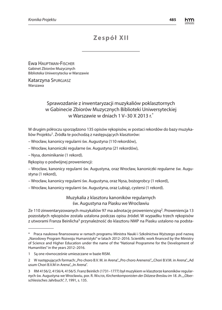 Kronika Projektu 485 Ze s p ó ł XII Ewa Hauptman-Fischer Gabinet Zbiorów Muzycznych Biblioteka Uniwersytecka w Warszawie Katarzyna Spurgjasz Warszawa Sprawozdanie z inwentaryzacji muzykaliów poklasztornych w Gabinecie Zbiorów Muzycznych Biblioteki Uniwersyteckiej w Warszawie w dniach 1 V–30 X 2013 r.* W drugim półroczu sporządzono 135 opisów rękopisów, w postaci rekordów do bazy muzykaliów Projektu1. Źródła te pochodzą z następujących klasztorów: – Wrocław, kanonicy regularni św. Augustyna (110 rekordów), – Wrocław, kanoniczki regularne św. Augustyna (21 rekordów), – Nysa, dominikanie (1 rekord). Rękopisy o podwójnej proweniencji: – Wrocław, kanonicy regularni św. Augustyna, oraz Wrocław, kanoniczki regularne św. Augustyna (1 rekord), – Wrocław, kanonicy regularni św. Augustyna, oraz Nysa, bożogrobcy (1 rekord), – Wrocław, kanonicy regularni św. Augustyna, oraz Lubiąż, cystersi (1 rekord). Muzykalia z klasztoru kanoników regularnych św. Augustyna na Piasku we Wrocławiu Ze 110 zinwentaryzowanych muzykaliów 97 ma adnotację proweniencyjną2. Proweniencja 13 pozostałych rękopisów została ustalona podczas opisu źródeł. W wypadku trzech rękopisów z utworami Franza Beinlicha3 przynależność do klasztoru NMP na Piasku ustalono na podsta* Praca naukowa finansowana w ramach programu Ministra Nauki i Szkolnictwa Wyższego pod nazwą „Narodowy Program Rozwoju Humanistyki” w latach 2012–2016. Scientific work financed by the Ministry of Science and Higher Education under the name of the “National Programme for the Development of Humanities” in the years 2012–2016. 1 Są one równocześnie umieszczane w bazie RISM. 2 W następujących formach: „Pro choro B.V. M. in Arena”, „Pro choro Arenensi”, „Chori B.V.M. in Arena”, „Ad usum Chori B.V.M in Arena”, „In Arena”. 3 RM 4156/2, 4156/4, 4156/5. Franz Beinlich (1731–1777) był muzykiem w klasztorze kanoników regularnych św. Augustyna we Wrocławiu, por. R. Walter, Kirchenkomponisten der Diözese Breslau im 18. Jh., „Oberschlesisches Jahrbuch”, 7, 1991, s. 135. 486 Kronika Projektu wie dostępnej literatury4. Prawdopodobną proweniencję rękopisu RM 4152 ustalono dzięki nazwisku posesora Josepha Hieronima Reisvitza, muzyka w omawianym klasztorze5. Przynależność do omawianego zbioru pozostałych dziewięciu rękopisów ustalono na podstawie nazwiska kopisty Antoniusa Rusa. Było to możliwe dzięki rozpoczęciu kwerendy magazynowej6. Jej omówienie na przykładzie identyfikacji A. Rusa znajduje się w dalszej części sprawozdania. Zbiór ten tworzyło wielu kopistów; 53 sygnowało pracę pełnym nazwiskiem (niekiedy także i imionami), a 18 podpisało się jedynie monogramem (zob. Aneks). O większości z nich nie mamy żadnych wiadomości, z wyjątkiem kilku, którzy pełnili w klasztorze funkcję regensów chóru. Są to kanonicy: o Friedrich Ferdinand Reichel7, o. Johann Karl Baudisch8, o. Andreas Lindner9, o. Franz Xaver Nitsche10, o. Karl Zimmermann11. Ponadto działalność na stanowisku regensa chóru wyżej wymienionych oraz dwóch innych kanoników dokumentują wpisy na kartach tytułowych zachowanych źródeł. F. F. Reichel sygnował swoim nazwiskiem 18 rękopisów powstałych w latach 1717–172112. Działalność J. K. Baudischa na stanowisku regensa oraz kantora odnotowana jest w 11 muzykaliach powstałych w latach 1736–174413. Kanonik Philipp Urban odnotowany jest w jednym tylko źródle z 1760 r.14 Działalność kolejnego regensa, An- 4 Idem, Kultywacja muzyki kościelnej w kościele NMP na Piasku we Wrocławiu na przestrzeni XVIII wieku, [w:] J. Stępkowski, H. Loos (red.), Beiträge zur Musikgeschichte Schlesiens. Musikkultur – Orgellandschaft. Tagungs�bericht Liegnitz 1991 (Deutsche Musik im Osten, 5), Bonn 1994, s. 52. Autor wymienia utwory zapisane w powyższych rękopisach, jednak nie podaje sygnatur ani dawnych, ani współczesnych. Atrybucja ta jest wysoce prawdopodobna z powodu związku kompozytora z klasztorem. Ponadto zachowały się jeszcze dwa rękopisy Beinlicha z wpisem proweniencyjnym klasztoru kanoników regularnych św. Augustyna we Wrocławiu – RM 4156/1, 4156/3. 5 Ibidem, s. 52. Zob. także omówienie rękopisów o podwójnej proweniencji. 6 Kwerenda ta pozwoliła ustalić następujące dane: Antonius Rus, muzyk, śpiewak (alt) w klasztorze. W większości źródeł podpisywał się „A. Rus”, w rękopisie RM 4158/4 podpisał się „A. Rus Altista. Anno 1737 Die 21 Juny”. W rękopisie RM 4664 podpisał się pełnym imieniem: „Antonius Rus Altista”. Jako kopista działał w latach 1736–1743. Ponadto Rus jako śpiewak brał udział w spektaklach teatralnych wrocławskiego gimnazjum jezuickiego w latach 1735–1736, por. T. Jeż, Kultura muzyczna jezuitów na Śląsku i ziemi kłodzkiej (1581–1776) (Studia et Dissertationes Instituti Musicologiae Universitatis Varsoviensis, Seria B, 18), Warszawa 2013, s. 368. W owym czasie Rus był prawdopodobnie słuchaczem wspomnianego gimnazjum, por. RM 4755, podpis „A. Rus Poeta 1736 die 31 May”. 7 Friedrich Ferdinand Reichel (1656–1736), regens chóru w latach 1708–1724, por. R. Walter, Kultywacja muzyki, s. 48. 8 Johann Karl Baudisch (1701–1746), regens chóru w latach 1730–1745, por. ibidem. 9 Andreas Lindner (1736–1773), regens chóru w latach 1764–1766, por. ibidem, s. 49. 10 Franz Xaver Nitsche (1734–1803), regens chóru w latach 1767–1772, por. ibidem. 11 Karl Zimmermann (1741–1818), regens chóru w latach 1773–1782, por. ibidem. 12 RM 5055, RM 6256–6261, 6265, 6382, 6491, 6496, 6527, 6529, 6551, 6592, 6598, 6677, 6695. Wpis pro�weniencyjny najczęściej brzmi: „Procuravit [lub: dscripsit] Frideric Ferdinand Reichel Can. Reg. Lat. Cantor, et Regens Chori ibidem”. 13 RM 4158/1, 4664, 4755, 4835, 4998, 6160–6162, 6176, 6244, 6575. Nota występuje w paru wariantach, np. „Comparavit [lub: adscripsit] pro choro B. 