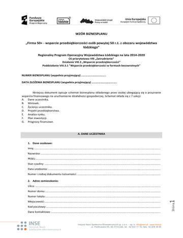 WZÓR BIZNESPLANU „Firma 50+ - wsparcie przedsiębiorczości osób powyżej 50 r.ż. z obszaru województwa łódzkiego” Regionalny Program Operacyjny Województwa Łódzkiego na lata 2014-2020 Oś priorytetowa VIII „Zatrudnienie” Działanie VIII.3 „Wsparcie przedsiębiorczości” Poddziałanie VIII.3.1 "Wsparcie przedsiębiorczości w formach bezzwrotnych" NUMER BIZNESPLANU (wypełnia przyjmujący) ……………………………. DATA ZŁOŻENIA BIZNESPLANU (wypełnia przyjmujący) ……………………………. Niniejszy dokument opisuje schemat biznesplanu składanego przez osobę ubiegającą się o przyznanie wsparcia finansowego na uruchomienie działalności gospodarczej. Schemat składa się z 7 sekcji: A. Dane uczestnika. B. Wniosek. C. Życiorys uczestnika. D. Projekt przedsiębiorstwa. E. Analiza rynku. F. Plan inwestycji. G. Prognozy finansowe. A. DANE UCZESTNIKA 1. Dane osobowe: Imię: .............................................................................................................................................................. Nazwisko: ...................................................................................................................................................... PESEL:............................................................................................................................................................ Stan cywilny: ................................................................................................................................................. Data urodzenia: ............................................................................................................................................. Numer i rodzaj dokumentu tożsamości: ........................................................................................................ 2. Adres zamieszkania: Ulica: ............................................................................................................................................................. Numer domu: ................................................................................................................................................ Kod pocztowy: ............................................................................................................................................... Dane kontaktowe: ......................................................................................................................................... Instytut Nauk Społeczno-Ekonomicznych sp. z o.o. – sp. k. [email protected] www.inse.pl ul. Piotrkowska 55, 90–413 Łódź, tel.: 42 633 17 19, faks: 42 209 36 85 Strona Miejscowość:................................................................................................................................................. 1 Numer lokalu:................................................................................................................................................ telefon: ......................................................................................................................................................... adres e-mail: ................................................................................................................................................. 3. Adres do korespondencji (jeżeli inny niż adres zamieszkania): Ulica: ............................................................................................................................................................. Numer domu: ................................................................................................................................................ Numer lokalu:................................................................................................................................................ Miejscowość:................................................................................................................................................. Kod pocztowy: ............................................................................................................................................... B. WNIOSEK Wniosek o udzielenie wsparcia finansowego na uruchomienie działalności gospodarczej w ramach projektu pod nazwą Firma 50+ - wsparcie przedsiębiorczości osób powyżej 50 r.ż. z obszaru województwa łódzkiego. Wnoszę o przyznanie: jednorazowej dotacji na uruchomienie działalności gospodarczej w kwocie ………………………. zł, finansowego wsparcia pomostowego w wysokości …………………… zł miesięcznie przez okres …………………. miesięcy wypłacanej od ……………………… do …………………….. . C. ŻYCIORYS UCZESTNIKA 1. Wykształcenie: Należy przedstawić przebieg wykształcenia podając nazwę, datę ukończenia szkoły i uzyskane wyksztalcenie. LP Nazwa szkoły Data ukończenia Uzyskane wykształcenie 2. Umiejętności: Należy wymienić przebyte szkolenia i kursy dokształcające. Dla każdego rodzaju szkoleń należy podać rok, uzyskane umiejętności i/lub zaświadczenie, nazwę instytucji organizatora. Należy przedstawić posiadane umiejętności potrzebne do wykonywania danej działalności gospodarczej. Należy wskazać poziom znajomości języków obcych lub obsługi komputera ze wskazaniem konkretnych programów jeżeli ma to znaczenie dla planowanej działalności gospodarczej. …………………………………………………………………………………………………………… …………………………………………………………………………………………………………… Instytut Nauk Społeczno-Ekonomicznych sp. z o.o. – sp. k. [email protected] www.inse.pl ul. Piotrkowska 55, 90–413 Łódź, tel.: 42 633 17 19, faks: 42 209 36 85 Strona ………………………………………………………………………