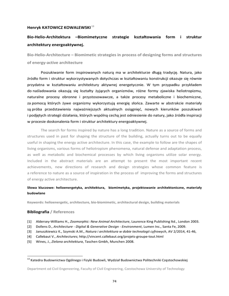 Henryk KATOWICZ KOWALEWSKI 13 Bio-Helio-Architektura –Biomimetyczne strategie kształtowania form i struktur architektury energoaktywnej. Bio-Helio-Architecture – Biomimetic strategies in process of designing forms and structures of energy-active architecture Poszukiwanie form inspirowanych naturą ma w architekturze długą tradycję. Natura, jako źródło form i struktur wykorzystywanych dotychczas w kształtowaniu konstrukcji okazuje się równie przydatna w kształtowaniu architektury aktywnej energetycznie. W tym przypadku przykładem do naśladowania okazują się kształty żyjących organizmów, różne formy zjawiska heliotropizmu, naturalne procesy obronne i przystosowawcze, a także procesy metaboliczne i biochemiczne, za pomocą których żywe organizmy wykorzystują energię słońca. Zawarte w abstrakcie materiały są próba przedstawienia najważniejszych aktualnych osiągnięć, nowych kierunków poszukiwań i podjętych strategii działania, których wspólną cechą jest odniesienie do natury, jako źródła inspiracji w procesie doskonalenia form i struktur architektury energoaktywnej. The search for forms inspired by nature has a long tradition. Nature as a source of forms and structures used in past for shaping the structure of the building, actually turns out to be equally useful in shaping the energy active architecture. In this case, the example to follow are the shapes of living organisms, various forms of heliotropism phenomena, natural defense and adaptation process, as well as metabolic and biochemical processes by which living organisms utilize solar energy. Included in the abstract materials are an attempt to present the most important recent achievements, new directions of research and design strategies whose common feature is a reference to nature as a source of inspiration in the process of improving the forms and structures of energy active architecture. Słowa kluczowe: helioenergetyka, architektura, biomimetyka, projektowanie architektoniczne, materiały budowlane Keywords: helioenergetic, architecture, bio-biomimetic, architectural design, building materials Bibliografia / References [1] [2] [3] [4] [5] 13 Aldersey-Williams H., Zoomorphic: New Animal Architecture, Laurence King Publishing ltd., London 2003. Dollens D., Architecture - Digital & Generative Design - Environment, Lumen Inc., Santa Fe, 2009. Januszkiewicz K., Szymski A.M., Natura i architektura w dobie technologii cyfrowych, AV 2/2014, 41-46, Callebaut V., Architectures; http://vincent.callebaut.org/projets-groupe-tout.html Wines, J., Zielona architektura, Taschen Gmbh, Munchen 2008. Katedra Budownictwa Ogólnego i Fizyki Budowli, Wydział Budownictwa Politechniki Częstochowskiej Department od Civil Engeneering, Faculty of Civil Engineering, Czestochowa University of Technology 74 Bio-Helio-Architektura (...) Bio-Helio-Architecture (...) ..) Henryk KATOWICZ-KOWALEWSKI KATOWICZ Vincent Mauger, „Super asymmetry”, La Marechalerie, Versailles 1 Vincent Mauger, „Super asymmetry”, La Marechalerie, Versailles Grontmij & Soeters Van Eldonk Architects, Centrum Badań, Universytet Wuhan, Chiny, 2013 2 Grontmij & Soeters Van Eldonk Architects, Research Center, Wuhan University, China, 2013 OGÓLNOPOLSKA KONFERENCJA CJA NAUKOWA I WYJAZD NAUKOWO - STUDIALNY - NIEMCY, HOLANDIA PT. "NATURA - TECHNOLOGIA - KULTURA ZRÓWNOWAŻONE ŚRODOWISKO ŻYCIA." THE CONFERENCE OF POLISH UNIVERSITIES AND RESEARCH TRIP – GERMANY, NETHERLANDS ‘NATURE – TECHNOLOGY – CULTURE – SUSTAINABLE LIVING ENVIRONMENT’ 75 Bio-Helio-Architektura (...) Bio-Helio-Architecture (...) Henryk KATOWICZ-KOWALEWSKI Wuhan University, konstrukcjapodtrzymująca system baterii fotowoltaicznych. 3 Wuhan University, construction of the solas cells system. Neville Mars, Parking „Słoneczny Las”, projekt 2014 4 Neville Mars, Solar Forest – car port, design 2014 OGÓLNOPOLSKA KONFERENCJA NAUKOWA I WYJAZD NAUKOWO - STUDIALNY - NIEMCY, HOLANDIA PT. "NATURA - TECHNOLOGIA - KULTURA ZRÓWNOWAŻONE ŚRODOWISKO ŻYCIA." THE CONFERENCE OF POLISH UNIVERSITIES AND RESEARCH TRIP – GERMANY, NETHERLANDS ‘NATURE – TECHNOLOGY – CULTURE – SUSTAINABLE LIVING ENVIRONMENT’ 76 Bio-Helio-Architektura (...) Bio-Helio-Architecture (...) Henryk KATOWICZ-KOWALEWSKI LAWA, Centrum miasta Masdar, ZEA, projekt 2008 5 LAWA, Masdar City Center, UAE, design 2008 Centrum Masdar, konstrukcja i funkcja „słonecznych parasoli” 6 Masdar Center, construction and function of the “sunshade” OGÓLNOPOLSKA KONFERENCJA NAUKOWA I WYJAZD NAUKOWO - STUDIALNY - NIEMCY, HOLANDIA PT. "NATURA - TECHNOLOGIA - KULTURA ZRÓWNOWAŻONE ŚRODOWISKO ŻYCIA." THE CONFERENCE OF POLISH UNIVERSITIES AND RESEARCH TRIP – GERMANY, NETHERLANDS ‘NATURE – TECHNOLOGY – CULTURE – SUSTAINABLE LIVING ENVIRONMENT’ 77 Bio-Helio-Architektura (...) Bio-Helio-Architecture (...) Henryk KATOWICZ-KOWALEWSKI Rolf Dish, Heliotrop, dom obracający się ku słońcu, Vauban, Fryburg, 1994 7 Rolf Dish, Heliotrop, The rotatable solar house, Vauban, Freiburg, 1994 Roland Mösl, Gemini House, Weiz, Austria, 2001 8 Roland Mösl, Gemini House, Weiz, Austria, 2001 OGÓLNOPOLSKA KONFERENCJA NAUKOWA I WYJAZD NAUKOWO - STUDIALNY - NIEMCY, HOLANDIA PT. "NATURA - TECHNOLOGIA - KULTURA ZRÓWNOWAŻONE ŚRODOWISKO ŻYCIA." THE CONFERENCE OF POLISH UNIVERSITIES AND RESEARCH TRIP – GERMANY, NETHERLANDS ‘NATURE – TECHNOLOGY – CULTURE – SUSTAINABLE LIVING ENVIRONMENT’ 78 Bio-Helio-Architektura (...) Bio-Helio-Architecture (...) Henryk KATOWICZ-KOWALEWSKI Dennis Dollens, Samocieniująca się wieża dla Los Angeles, projekt 2007 9 Dennis Dollens, Self-shading Tower for Los Angeles, design 2007 Dennis Dollens, BioTower: Generatywna sekwencja powłoki liści. 2009 10 Dennis Dollens, Bio Tower: Generative Leaf Sequence, 2009 OGÓLNOPOLSKA KONFERENCJA NAUKOWA I WYJAZD NAUKOWO - STUDIALNY - NIEMCY, HOLANDIA PT. "NATURA - TECHNOLOGIA - KULTURA ZRÓWNOWAŻONE ŚRODOWISKO ŻYCIA." THE CO