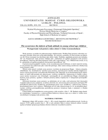 ANNALES UNIVERSITATIS MARIAE CURIE-SKŁODOWSKA LUBLIN - POLONIA VOL.LX, SUPPL. XVI, 539 SECTIO D 2005 Wydział Wychowania Fizycznego i Fizjoterapii Politechniki Opolskiej*, Wyższa Szkoła Medyczna w Legnicy** Faculty of Physical Education and Physiotherapy, Technical University of Opole*, High School of Medicine in Legnica** ALICJA SZEMRAJ-LOCHYŃSKA*, KRYSTYNA RUTKOWSKA**, MACIEJ KUKUŁKA** The occurrence the defects of body attitude in young school age children Występowanie wad postawy ciała u dzieci w wieku wczesnoszkolnym Wady postawy są trudne do jednoznacznego zdefiniowania. Według Degi postawę człowieka wyraża jego sylwetka, która jest cechą indywidualną. „Po sylwetce oceniamy czy ktoś trzyma się dobrze, czy źle. Proste trzymanie się określamy jako dobre, ładne. Niedbała, zapadnięta postawa jest nieładna, zła” [1]. Kasperczyk wady postawy traktuje jako „odchylenia od ogólnie przyjętych cech postawy prawidłowej, właściwej dla danej kategorii wieku, płci i typu budowy” [4], a Milanowska uważa, że są to „odchylenia od ogólnie przyjętych cech postawy prawidłowej” [6]. Z przytoczonych poglądów wynika, że nie ma jednoznacznych definicji, co może stanowić normę, co zaś powinno być traktowane jako wada lub patologia. Jakie zatem istnieją możliwości obiektywnej oceny postawy ciała? Wśród wielu metod i technik oceny postawy wyróżnia się propozycja Hoppe – lekarza ortopedy, rehabilitanta. Jej „bezdotykową” metodę oceny postawy, nazwaną przez autorkę metodą trójpłaszczyznowo-osiową pozytywnie zweryfikowała Wiernicka [10]. Opierając się na biomechanicznych założeniach, że bryła ciała posiada trzy płaszczyzny: czołową, strzałkową i poprzeczną (w każdej z płaszczyzn można wyznaczyć osie równoległe i prostopadłe do osi pośrodkowej) Hoppe sformułowała kryteria oceny postawy, zgodnie z którymi postawę należy rozpatrywać w kategoriach prostopadłościanu [2, 3]. Głównym kryterium oceny postawy są odchylenia od osi ciała, czyli pionowej linii (krawędzi) względem płaszczyzny podparcia, na której człowiek stoi, utworzonej przez przecięcie pod kątem 90° pośrodkowej płaszczyzny strzałkowej, przechodzącej przez szew strzałkowy, z płaszczyzną czołową, przechodzącą przez szew czołowy. Odchylenia od osi ciała (obserwowane m. in. na przedniej płaszczyźnie czołowej prostopadłościanu prawidłowej postawy) świadczyć będą o zmianach w obrębie całej postawy [8]. Celem badań jest kompleksowa ocena postawy ciała uczniów z klas I – III. Badania mają charakter wyjaśniający i poznawczy, a zatem problem badawczy dotyczy tego czy u dzieci w wieku wczesnoszkolnym występują wady postawy ciała. MATERIAŁ I METODA Badaniami objęto 409 uczniów z klas I – III z trzech legnickich szkół podstawowych. Liczba ta stanowi 37,0% ogółu uczniów klas I – III w tych szkołach. Były to dzieci, których rodzice wyrazili zgodę na badanie (propozycję badania złożono rodzicom wszystkich uczniów). 392 Tabela 1. Liczba badanych w poszczególnych szkołach i klasach Klasa Szkoła Klasa I Klasa II Klasa III Ogółem SP – 6 SP – 7 SP – 9 Razem 22 35 29 86 88 62 32 182 60 43 38 141 170 140 99 409 Badanie przeprowadzano zgodnie z biomechanicznymi kryteriami oceny postawy, które zawiera „karta badań” [9]. W trakcie somatoskopowej oceny postawy badani przyjmowali swobodną pozycję stojącą. Najpierw dokonywano obserwacji z przodu: zwracając uwagę na: ustawienie głowy, barków, tułowia, bioder, kończyn dolnych oraz stóp wzdłuż osi podłużnej i ocenę chodu. Następnie dokonywano wizualizacji sylwetki z tyłu, oceniając: ustawienie głowy, łopatek, tułowia, miednicy oraz kończyn dolnych i stóp. Swoistością badania była obserwacja kształtu pleców w skłonie tułowia w przód z równoległym ustawieniem stóp (wzdłuż listwy), stawy kolanowe wyprostowane, głowa i ramiona luźno zwisające, dłonie na tej samej wysokości. Pozwala to dostrzec asymetrię pleców nawet wówczas, kiedy nie ma jeszcze wyraźnego kostnego garbu żebrowego. WYNIKI I OMÓWIENIE Badania wykazały, że w postawie ciała dzieci w wieku wczesnoszkolnym występują znaczne odchylenia od stanu prawidłowego. Badanych podzielono na grupy według zakresu występujących wad. Zamierzano zastosować skalę cztero stopniową z grupą „bez wad” jako pierwszą, ale wśród badanych nie było dzieci, które można zaliczyć do tej kategorii. Przyjęto trzy stopniową skalę wad: „asymetria w wybranych elementach postawy”, „zagrożenie wadą postawy”, „wada postawy”. W grupie z „asymetrią” znalazły się dzieci, u których uwidaczniają się asymetrie w obrębie głowy, barków, tułowia, bioder i kończyn dolnych. W przedziale „zagrożonych wadą postawy” mieszczą się dzieci, u których poza asymetriami w poszczególnych elementach postawy (głowa, barki tułów, biodra, kończyny dolne) występuje asymetria kształtu pleców widoczna podczas skłonu tułowia. Do grupy z „wadą postawy” zaliczono dzieci z wyraźnym kostnym garbem żebrowym. Tabela 2. Wady postawy według podziału na szkoły Szkoła SP – 6 SP – 7 SP – 9 Łącznie Asymetria n % 18 20,9 51 28,0 30 21,3 99 24,2 Rodzaj wady Zagrożenie wadą n % 45 52,4 105 57,7 74 52,5 224 54,8 Wada postawy n % 23 26,7 26 14,3 37 26,2 86 21,0 Razem n 86 182 141 409 % 100 100 100 100 Z powyższego zestawienia wynika, że liczba dzieci zagrożonych wadami postawy we wszystkich szkołach jest zbliżona do średniej i wynosi ponad 50,0% spośród uczniów zbadanych w danej szkole. Tylko w Szkole Podstawowej nr 7 odsetek dzieci „z wadą postawy” jest mniejszy niż w dwóch pozostałych szkołach i wynosi 14,3% (przy średniej 21%). Jest to jedna z dwóch legnickich szkół, w której jest basen i wszyscy uczniowie od klasy I mają obowiązkowe zajęcia z pływania. Ponadto znaczna część dzieci uczestniczy w z