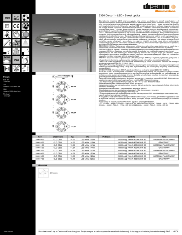 3330 Disco 1 - LED - Street optics Oświetlenie miejskie LED charakteryzuje się takimi wartościami, jakich oczekujemy od najnowocześniejszych technologii oświetleniowych: zwiększa bowiem jakość otoczenia w nocy, zużywając przy tym mniej energii oraz podkreśla walory estetyczne w ciągu dnia. Nowe kształty dla nowych technologii oświetleniowych. Optymalne wymiary LED umożliwiają uzyskanie większej elegancji, natomiast ich okrągły kształt zapewnia odpowiedni rozsył światła, a żeberka chłodzące gwarantują prawidłowe rozpraszanie ciepła. Kształt, który może być ciągle ulepszany poprzez wprowadzanie udogodnień, gwarantujących wysoki standard bezpieczeństwa dla oczu w każdym zastosowaniu. Poprzez zastosowanie DISCO, oświetlenie LED wpasowuje się w nowy projekt oświetlenia miejskiego, który uwidacznia proces innowacji. DISCO gwarantuje duże zainteresowanie i wysoki standard wykonania tego prestiżowego przedsięwzięcia oświetleniowego. Oprawa Disco została zaprojektowana właśnie w celu wykorzystania, w najlepszy możliwie sposób, korzyści uzyskiwanych w wyniku zastosowania LED w oświetleniu miejskim, takich jak oszczędność energetyczna i nowa jakość oświetlenia. Jej wygląd - tak odległy od tradycyjnych kształtów opraw ulicznych - powoduje, że osprzęt miejski uzyskuje nową jakość estetyczną, korespondującą z planami odnowienia krajobrazu miejskiego. Pozwala również w pełni zaspokoić potrzebę jednolitego rozsyłu światła oraz rozpraszania ciepła. OBUDOWA i RAMA: Wykonane z odlewanego ciśnieniowo aluminium, zaprojektowane o przekroju o bardzo małej powierzchni narażonej na działanie wiatru. Żeberka chłodzące wbudowane w pokrywę. TRZONEK SŁUPA: Wersja z trzonkiem słupa wbudowanym w obudowę oprawy umożliwia montaż boczny na słupach 60/62mm (Szybka w pozycji równoległej do podłoża, bez możliwości regulacji nachylenia). Wykorzystując Art. 290 możliwy jest montaż oprawy zarówno na szczycie słupa, jak i boczny. Dzięki zastosowaniu tego artykułu możliwa jest również regulacja nachylenia oprawy pod kątem 15°, zarówno w przypadku montażu bocznego, jak i na szczycie słupa. RASTRY: Soczewki wtórne wykonane ze szkła akrylowego (PMMA) o wysokiej wydajności, połączone z rekuperatorami strumienia, wytłaczanymi z metalizowanego poliwęglanu o wysokiej wydajności. DYFUZOR: szkło wyjątkowo przezroczyste (extra-clear) gr. 4mm, hartowane, odporne na wstrząsy termiczne i uderzenia (UNI EN 12150-1: 2001). POWŁOKA: Pierwszy etap poprzez zanurzenie w szarej kąpieli epoksydowej w celu uzyskania odporności na korozję i działanie mgły solnej. Drugi etap, wykończeniowy, na bazie żywicy akrylowej, stabilizowanej promieniami UV OKABLOWANIE: W zestawie 530mA, ze sterownikiem w podwójnej izolacji 220-240V 50/60Hz. WYPOSAŻENIE: Automatyczne urządzenie regulujące temperaturę. W przypadku nagłego wzrostu temperatury diody, spowodowanego przez szczególne warunki środowiskowe lub nieprawidłowe jej funkcjonowanie, system zmniejsza strumień światła, umożliwiając redukcję temperatury eksploatacji, gwarantując zawsze prawidłowe funkcjonowanie. Zabezpieczenie przed impulsowym wzrostem temperatury, zgodnie z normą EN 61547. Elektroniczne urządzenie odpowiedzialne za bezpieczeństwo modułu LED. Wylacznik nozowy. LED: Najnowszej generacji technologia LED, Ta-30 +40 ° C Czas 80.000h L70B20 Klasa bezpieczeństwa fotobiologicznego: Wolna od ryzyka. Na życzenie możliwe jest zainstalowanie w oprawie różnych systemów zapewniających funkcję ściemniania strumienia świetlnego: -Regulacja podwójnej mocy z zastosowaniem wirtualnej północy. -Regulacja z pomocą sterownika ściemniającego 1-10V sterowanego z zewnątrz. -system telesterowania wykorzystujący transmisję fal. Oprawa produkowana jest w zestawie z łącznikiem hermetycznym IP67, umożliwiającym połączenie z linią. Łącznik ułatwia i przyspiesza instalację. W przypadku, kiedy zamierza się przeprowadzić nadzwyczajną konserwację, produkt ten wyposażony jest w wyłącznik sekcyjny z podwójną izolacją, który przerywa dopływ zasilania elektrycznego po otwarciu obudowy. Klasa izolacji II, stopień protekcji IP66-IK08 - zgodnie z normą EN 60598-1. LED 14250lm - 4000K - 700mA - 110W - CRI 80 LED 18300lm - 4000K - 700mA - 141W - CRI 80 LED 22400lm - 4000K - 700mA - 173W - CRI 80 LED 28500lm - 4000K - 700mA - 220W - CRI 80 Pobierz DXF 2D - 3330.dxf 3DS - disano_3330_disco.3ds 3DM - disano_3330_disco.3dm Montaggi - disco.pdf Kod Okablowanie Kg Wat Źarówka Kolor 330010-00 CLD CELL 14,00 LED white 110W 14250lm @ 700mA-4000K-CRI 80 SREBRNY PIASKOWANY 330014-00 CLD CELL 14,00 LED white 110W 14250lm @ 700mA-4000K-CRI 80 GRAFITOWY 330011-00 CLD CELL 13,56 LED white 141W 18300lm @ 700mA-4000K-CRI 80 SREBRNY PIASKOWANY 330015-00 CLD CELL 14,21 LED white 141W 18300lm @ 700mA-4000K-CRI 80 GRAFITOWY 330012-00 CLD CELL 14,76 LED white 173W 22400lm @ 700mA-4000K-CRI 80 SREBRNY PIASKOWANY 330016-00 CLD CELL 14,76 LED white 173W 22400lm @ 700mA-4000K-CRI 80 GRAFITOWY 330013-00 CLD CELL 15,06 LED white 220W 28500lm @ 700mA-4000K-CRI 80 SREBRNY PIASKOWANY 330017-00 CLD CELL 15,14 LED white 220W 28500lm @ 700mA-4000K-CRI 80 GRAFITOWY Podstawa Akcesoria - 290 łącznik 02/03/2017 Skontaktować się z Centrum Konsultacyjno- Projektowym w celu uzyskania wszelkich informacji dotyczących instalacji oświetleniowej. PAG 1 - POL