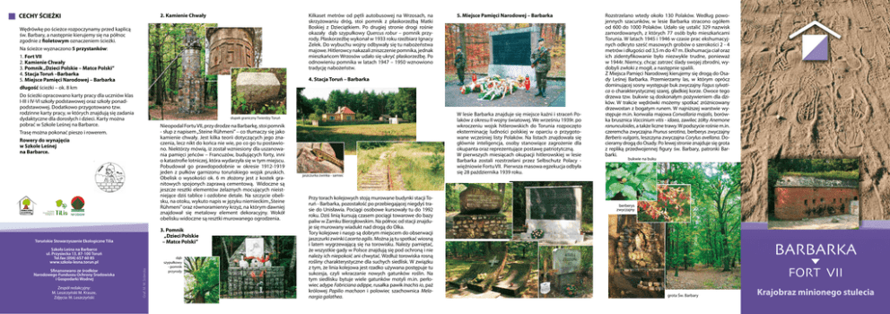 CECHY ŚCIEŻKI 2. Kamienie Chwały Wędrówkę po ścieżce rozpoczynamy przed kaplicą św. Barbary, a następnie kierujemy się na północ zgodnie z fioletowym oznaczeniem ścieżki. Na ścieżce wyznaczono 5 przystanków: 1. Fort VII 2. Kamienie Chwały 3. Pomnik „Dzieci Polskie – Matce Polski” 4. Stacja Toruń –Barbarka 5. Miejsce Pamięci Narodowej – Barbarka długość ścieżki – ok. 8 km Do ścieżki opracowano karty pracy dla uczniów klas I-III i IV-VI szkoły podstawowej oraz szkoły ponadpodstawowej. Dodatkowo przygotowano tzw. rodzinne karty pracy, w których znajdują się zadania dydaktyczne dla dorosłych i dzieci. Karty można pobrać w Szkole Leśnej na Barbarce. Trasę można pokonać pieszo i rowerem. Rowery do wynajęcia w Szkole Leśnej na Barbarce. słupek graniczny Twierdzy Toruń Nieopodal Fortu VII, przy drodze na Barbarkę, stoi pomnik - słup z napisem „Steine Rühmeni” – co tłumaczy się jako kamienie chwały. Jest kilka teorii dotyczących jego znaczenia, lecz nikt do końca nie wie, po co go tu postawiono. Niektórzy mówią, iż został wzniesiony dla uszanowania pamięci jeńców – Francuzów, budujących forty, inni o katastrofie lotniczej, która wydarzyła się w tym miejscu. Pobudował go prawdopodobnie w okresie 1912-1919 jeden z pułków garnizonu toruńskiego wojsk pruskich. Obelisk o wysokości ok. 6 m złożony jest z kostek granitowych spojonych zaprawą cementową. Widoczne są jeszcze resztki elementów żelaznych mocujących nieistniejące dziś tablice i ozdobne detale. Na szczycie obelisku, na otoku, wykuto napis w języku niemieckim „Steine Rühmeni” oraz równoramienny krzyż, na którym dawniej znajdował się metalowy element dekoracyjny. Wokół obelisku widoczne są resztki murowanego ogrodzenia. 3. Pomnik „Dzieci Polskie – Matce Polski” Graf. M. W. Sobecka Szkoła Leśna na Barbarce ul. Przysiecka 13, 87-100 Toruń Tel.fax (056) 657 60 85 www.szkola-lesna.torun.pl Zespół redakcyjny: M. Leszczyński M. Krauze, Zdjęcia: M. Leszczyński 5. Miejsce Pamięci Narodowej – Barbarka 4. Stacja Toruń – Barbarka Toruńskie Stowarzyszenie Ekologiczne Tilia Sfinansowano ze środków Narodowego Funduszu Ochrony Środowiska i Gospodarki Wodnej Kilkaset metrów od pętli autobusowej na Wrzosach, na skrzyżowaniu dróg, stoi pomnik z płaskorzeźbą Matki Boskiej z Dzieciątkiem. Po drugiej stronie drogi rośnie okazały dąb szypułkowy Quercus robur – pomnik przyrody. Płaskorzeźbę wykonał w 1933 roku rzeźbiarz Ignacy Zelek. Do wybuchu wojny odbywały się tu nabożeństwa majowe. Hitlerowcy nakazali zniszczenie pomnika, jednak mieszkańcom Wrzosów udało się ukryć płaskorzeźbę. Po odnowieniu pomnika w latach 1947 – 1950 wznowiono tradycję nabożeństw. dąb szypułkowy - pomnik przyrody jaszczurka zwinka - samiec Przy torach kolejowych stoją murowane budynki stacji Toruń - Barbarka, pozostałość po przebiegającej niegdyś trasie do Unisławia. Pociągi osobowe kursowały tu do 1992 roku. Dziś linią kursują czasem pociągi towarowe do bazy paliw w Zamku Bierzgłowskim. Na północ od stacji znajduje się murowany wiadukt nad drogą do Olka. Tory kolejowe i nasyp są dobrym miejscem do obserwacji jaszczurki zwinki Lacerta agilis. Można ją tu spotkać wiosną i latem wygrzewającą się na torowisku. Należy pamiętać, że wszystkie gady w Polsce znajdują się pod ochroną i nie należy ich niepokoić ani chwytać. Wzdłuż torowiska rosną rośliny charakterystyczne dla suchych siedlisk. W związku z tym, że linia kolejowa jest rzadko używana postępuje tu sukcesja, czyli wkraczanie nowych gatunków roślin. Na tym siedlisku bytuje wiele gatunków motyli m.in. perłowiec adype Fabriciana adippe, rusałka pawik Inachis io, paź królowej Papilio machaon i polowiec szachownica Melanargia galathea. W lesie Barbarka znajduje się miejsce kaźni i straceń Polaków z okresu II wojny światowej. We wrześniu 1939r. po wkroczeniu wojsk hitlerowskich do Torunia rozpoczęto eksterminację ludności polskiej w oparciu o przygotowane wcześniej listy Polaków. Na listach znajdowała się głównie inteligencja, osoby stanowiące zagrożenie dla okupanta oraz reprezentujące postawę patriotytczną. W pierwszych miesiącach okupacji hitlerowskiej w lesie Barbarka zostali rozstrzelani przez Selbschutz Polacy więźniowie Fortu VII. Pierwsza masowa egzekucja odbyła się 28 października 1939 roku. Rozstrzelano wtedy około 130 Polaków. Według powojennych szacunków, w lesie Barbarka stracono ogółem od 600 do 1000 Polaków. Udało się ustalić 329 nazwisk zamordowanych, z których 77 osób było mieszkańcami Torunia. W latach 1945 i 1946 w czasie prac ekshumacyjnych odkryto sześć masowych grobów o szerokości 2 - 4 metrów i długości od 3,5 m do 47 m. Ekshumacja ciał oraz ich zidentyfikowanie było niezwykle trudne, ponieważ w 1944r. Niemcy, chcąc zatrzeć ślady swojej zbrodni, wydobyli zwłoki z mogił, a następnie spalili. Z Miejsca Pamięci Narodowej kierujemy się drogą do Osady Leśnej Barbarka. Przemierzamy las, w którym oprócz dominującej sosny występuje buk zwyczajny Fagus sylvatica o charakterystycznej szarej, gładkiej korze. Owoce tego drzewa tzw. bukwie są doskonałym pożywieniem dla dzików. W trakcie wędrówki możemy spotkać zróżnicowany drzewostan z bogatym runem. W najniższej warstwie występuje m.in. konwalia majowa Convallaria majalis, borówka brusznica Vaccinium vitis - idaea, zawilec żółty Anemone ranunculoides, a także liczne trawy. W podszycie rośnie m.in. czeremcha zwyczajna Prunus serotina, berberys zwyczajny Berberis vulgaris, leszczyna zwyczajna Corylus avellana. Docieramy drogą do Osady. Po lewej stronie znajduje się grota z repliką przedwojennej figury św. Barbary, patronki Barbarki. bukwie na buku berberys zwyczajny BARBARKA FORT VII grota Św. Barbary Krajobraz minionego stulecia SKALA 500 m 5 4 WRZOSY BARBARKA 3 Y WRZOSY Las L