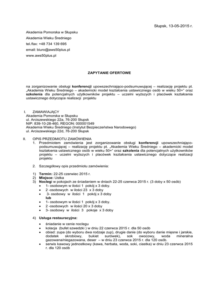 Słupsk, 13-05-2015 r. Akademia Pomorska w Słupsku Akademia Wieku Średniego tel./fax: +48 734 139 695 email: [email protected] www.aws50plus.pl ZAPYTANIE OFERTOWE na zorganizowanie obsługi konferencji upowszechniająco-podsumuwującej – realizację projektu pt. „Akademia Wieku Średniego – akademicki model kształcenia ustawicznego osób w wieku 50+” oraz szkolenia dla potencjalnych użytkowników projektu – uczelni wyższych i placówek kształcenia ustawicznego dotyczące realizacji projektu I. ZAMAWIAJĄCY Akademia Pomorska w Słupsku ul. Arciszewskiego 22a, 76-200 Słupsk NIP: 839-10-28-460, REGON: 000001549 Akademia Wieku Średniego (Instytut Bezpieczeństwa Narodowego) ul. Arciszewskiego 22d, 76-200 Słupsk II. OPIS PRZEDMIOTU ZAMÓWIENIA 1. Przedmiotem zamówienia jest zorganizowanie obsługi konferencji upowszechniającopodsumuwującej – realizację projektu pt. „Akademia Wieku Średniego – akademicki model kształcenia ustawicznego osób w wieku 50+” oraz szkolenia dla potencjalnych użytkowników projektu – uczelni wyższych i placówek kształcenia ustawicznego dotyczące realizacji projektu 2. Szczegółowy opis przedmiotu zamówienia: 1) Termin: 22-25 czerwiec 2015 r. 2) Miejsce: Ustka 3) Noclegi w pokojach ze śniadaniem w dniach 22-25 czerwca 2015 r. (3 doby x 50 osób) 1- osobowym w ilości 1 pokój x 3 doby. 2 -osobowych w ilości 23 x 3 doby 3- osobowy w ilości 1 pokój x 3 doby lub 1- osobowym w ilości 1 pokój x 3 doby. 2 -osobowych w ilości 20 x 3 doby 3- osobowy w ilości 3 pokoje x 3 doby 4) Usługa restauracyjna: śniadanie w cenie noclegu kolacja (bufet szwedzki ) w dniu 22 czerwca 2015 r. dla 50 osób obiad: zupa (do wyboru dwa rodzaje zup), drugie danie (do wyboru danie mięsne i jarskie, dodatek skrobiowy, bukiet surówek), sok owocowy, woda mineralna gazowana/niegazowana, deser – w dniu 23 czerwca 2015 r. dla 120 osób. serwis kawowy jednostkowy (kawa, herbata, woda, soki, ciastka) w dniu 23 czerwca 2015 r. dla 120 osób kolacja grillowa z szantami: (kiełbaska, kaszanka, udko, karkówka, soki, zimne napoje, kawa, herbata, surówki, smalec, ogórki, pieczywo) – w dniu 23 czerwca 2015 r. dla 120 osób obiad: zupa (do wyboru dwa rodzaje zup), drugie danie (do wyboru danie mięsne i jarskie, dodatek skrobiowy, bukiet surówek), sok owocowy, woda mineralna gazowana/niegazowana, deser – w dniu 24 i 25 czerwca 2015 r. dla 85 osób. dwa serwisy kawowe jednostkowe (kawa, herbata, woda, soki, ciastka) w dniu 24 czerwca 2015 r. dla 85 osób kolacja bankietowa: przystawka, zupa, drugie danie mięsne, bukiet surówek, zimne przekąski, sok owocowy, napoje, woda mineralna gazowana/niegazowana, kawa, herbata do wyboru, mleko do kawy, cukier, cytryna, ciasto, oprawa muzyczna i DJ – w dniu 24 czerwca 2015 r. dla 85 osób. 5) Wynajem sal: 23 czerwca 2015 r. – sala na 120 osób wyposażona w projektor multimedialny, ekran i nagłośnienie. 24 czerwca 2015 r. – sala na 85 osób wyposażona w projektor multimedialny, ekran i nagłośnienie. 24 czerwca 2015 r. – 4 sale na 25 osób każda, wyposażone w projektor multimedialny, ekran i nagłośnienie, flipchart. 3. Wymagana gwarancja: nie wymagana 4. W celu realizacji zamówienia Zamawiający, przekaże Wykonawcy materiały w postaci: nie dotyczy 5. Zamawiający nie dopuszcza możliwości składania ofert częściowych. 6. Zamawiający nie dopuszcza możliwości powierzenia części lub całości zamówienia podwykonawcom. 7. udzielenie zamówienia mogą ubiegać się Wykonawcy spełniający następujące wymagania: Hotel o standardzie co najmniej trzygwiazdkowym położony w mieście Ustka. III. TERMIN WYKONANIA ZAMÓWIENIA 1. Termin wykonania przedmiotu zamówienia: Od 22 czerwca 2015 r. do 25 czerwca 2015 r. Ostateczne potwierdzenie terminów wynajmu pokoju nastąpi najpóźniej na 20 dni przed terminem rozpoczęcia konferencji i szkolenia przy czym Zamawiający w porozumieniu z Wykonawcą może zmienić terminy wykonywania usługi hotelowej. Ostateczna liczba osób korzystających z usługi hotelowej zostanie potwierdzona przez Zamawiającego najpóźniej na 7 dni przed terminem przyjazdu uczestników do hotelu. Ostateczny potwierdzenie rzeczywistej liczby osób, które skorzystają z usług restauracyjnych, zostaną uzgodnione najpóźniej na 7 dni przed terminem rozpoczęcia konferencji. IV. V. OPIS SPOSOBU PRZYGOTOWANIA OFERTY Wykonawca powinien złożyć ofertę na formularzu załączonym do niniejszego zapytania. MIEJSCE ORAZ TERMIN SKŁADANIA OFERT 1. Oferta powinna być przesłana za pośrednictwem poczty, kuriera lub też dostarczona osobiście na adres: Akademia Pomorska w Słupsku ul. Arciszewskiego 22a, 76-200 Słupsk – Kancelaria Ogólna, pokój nr 35 do dnia 29 maja 2015 r. 2. Wybór najkorzystniejszej oferty zostanie ogłoszony na stronie internetowej pod adresem www.apsl.edu.pl 3. Oferty złożone po terminie nie będą rozpatrywane 4. Wykonawca może przed upływem terminu składania ofert zmienić lub wycofać swoją ofertę. 5. W toku badania i oceny ofert Zamawiający może żądać od Wykonawców wyjaśnień dotyczących treści złożonych ofert. 6. Zapytanie ofertowe zamieszczono na stronie: www.apsl.edu.pl oraz www.aws50plus.pl VI. OCENA OFERT Zamawiający dokona oceny ważnych ofert na podstawie następujących kryteriów: cena – 100% VII. DODATKOWE INFORMACJE Dodatkowych informacji udziela Tomasz Pączek pod numerem telefonu +48 728-888-133 oraz adresem email: [email protected] VIII. ZAŁĄCZNIKI wzór Formularza Oferty projekt umowy. …………………………………. (dane Wykonawcy) Formularz Oferty My, niżej podpisani……………………………………………………………………………………………...... działając w imieniu i na rzecz…………………………………………………………………………………..... …………………………………………………………………………………