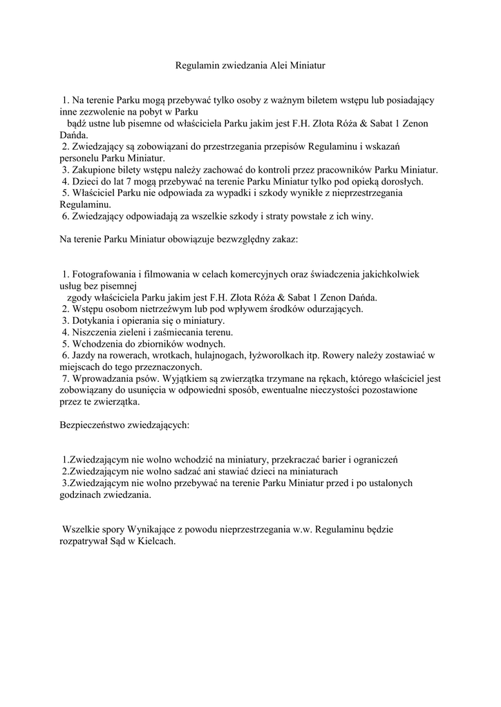 Regulamin zwiedzania Alei Miniatur 1. Na terenie Parku mogą przebywać tylko osoby z ważnym biletem wstępu lub posiadający inne zezwolenie na pobyt w Parku bądź ustne lub pisemne od właściciela Parku jakim jest F.H. Złota Róża & Sabat 1 Zenon Dańda. 2. Zwiedzający są zobowiązani do przestrzegania przepisów Regulaminu i wskazań personelu Parku Miniatur. 3. Zakupione bilety wstępu należy zachować do kontroli przez pracowników Parku Miniatur. 4. Dzieci do lat 7 mogą przebywać na terenie Parku Miniatur tylko pod opieką dorosłych. 5. Właściciel Parku nie odpowiada za wypadki i szkody wynikłe z nieprzestrzegania Regulaminu. 6. Zwiedzający odpowiadają za wszelkie szkody i straty powstałe z ich winy. Na terenie Parku Miniatur obowiązuje bezwzględny zakaz: 1. Fotografowania i filmowania w celach komercyjnych oraz świadczenia jakichkolwiek usług bez pisemnej zgody właściciela Parku jakim jest F.H. Złota Róża & Sabat 1 Zenon Dańda. 2. Wstępu osobom nietrzeźwym lub pod wpływem środków odurzających. 3. Dotykania i opierania się o miniatury. 4. Niszczenia zieleni i zaśmiecania terenu. 5. Wchodzenia do zbiorników wodnych. 6. Jazdy na rowerach, wrotkach, hulajnogach, łyżworolkach itp. Rowery należy zostawiać w miejscach do tego przeznaczonych. 7. Wprowadzania psów. Wyjątkiem są zwierzątka trzymane na rękach, którego właściciel jest zobowiązany do usunięcia w odpowiedni sposób, ewentualne nieczystości pozostawione przez te zwierzątka. Bezpieczeństwo zwiedzających: 1.Zwiedzającym nie wolno wchodzić na miniatury, przekraczać barier i ograniczeń 2.Zwiedzającym nie wolno sadzać ani stawiać dzieci na miniaturach 3.Zwiedzającym nie wolno przebywać na terenie Parku Miniatur przed i po ustalonych godzinach zwiedzania. Wszelkie spory Wynikające z powodu nieprzestrzegania w.w. Regulaminu będzie rozpatrywał Sąd w Kielcach.