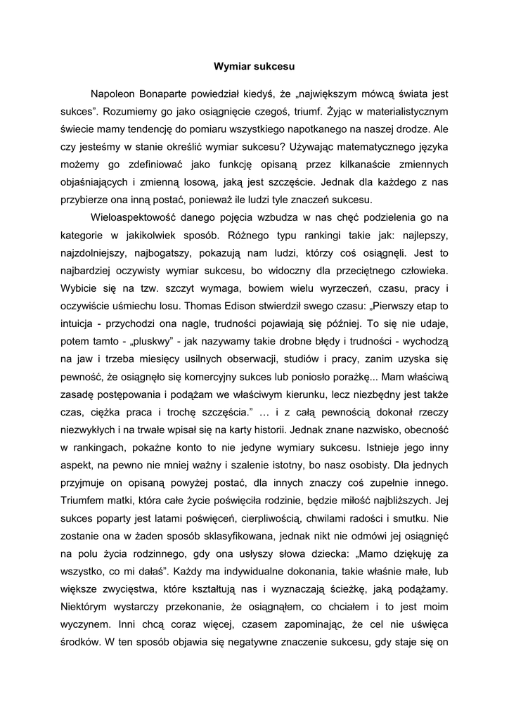 Wymiar sukcesu Napoleon Bonaparte powiedział kiedyś, Ŝe „największym mówcą świata jest sukces”. Rozumiemy go jako osiągnięcie czegoś, triumf. śyjąc w materialistycznym świecie mamy tendencję do pomiaru wszystkiego napotkanego na naszej drodze. Ale czy jesteśmy w stanie określić wymiar sukcesu? UŜywając matematycznego języka moŜemy go zdefiniować jako funkcję opisaną przez kilkanaście zmiennych objaśniających i zmienną losową, jaką jest szczęście. Jednak dla kaŜdego z nas przybierze ona inną postać, poniewaŜ ile ludzi tyle znaczeń sukcesu. Wieloaspektowość danego pojęcia wzbudza w nas chęć podzielenia go na kategorie w jakikolwiek sposób. RóŜnego typu rankingi takie jak: najlepszy, najzdolniejszy, najbogatszy, pokazują nam ludzi, którzy coś osiągnęli. Jest to najbardziej oczywisty wymiar sukcesu, bo widoczny dla przeciętnego człowieka. Wybicie się na tzw. szczyt wymaga, bowiem wielu wyrzeczeń, czasu, pracy i oczywiście uśmiechu losu. Thomas Edison stwierdził swego czasu: „Pierwszy etap to intuicja - przychodzi ona nagle, trudności pojawiają się później. To się nie udaje, potem tamto - „pluskwy” - jak nazywamy takie drobne błędy i trudności - wychodzą na jaw i trzeba miesięcy usilnych obserwacji, studiów i pracy, zanim uzyska się pewność, Ŝe osiągnęło się komercyjny sukces lub poniosło poraŜkę... Mam właściwą zasadę postępowania i podąŜam we właściwym kierunku, lecz niezbędny jest takŜe czas, cięŜka praca i trochę szczęścia.” … i z całą pewnością dokonał rzeczy niezwykłych i na trwałe wpisał się na karty historii. Jednak znane nazwisko, obecność w rankingach, pokaźne konto to nie jedyne wymiary sukcesu. Istnieje jego inny aspekt, na pewno nie mniej waŜny i szalenie istotny, bo nasz osobisty. Dla jednych przyjmuje on opisaną powyŜej postać, dla innych znaczy coś zupełnie innego. Triumfem matki, która całe Ŝycie poświęciła rodzinie, będzie miłość najbliŜszych. Jej sukces poparty jest latami poświęceń, cierpliwością, chwilami radości i smutku. Nie zostanie ona w Ŝaden sposób sklasyfikowana, jednak nikt nie odmówi jej osiągnięć na polu Ŝycia rodzinnego, gdy ona usłyszy słowa dziecka: „Mamo dziękuję za wszystko, co mi dałaś”. KaŜdy ma indywidualne dokonania, takie właśnie małe, lub większe zwycięstwa, które kształtują nas i wyznaczają ścieŜkę, jaką podąŜamy. Niektórym wystarczy przekonanie, Ŝe osiągnąłem, co chciałem i to jest moim wyczynem. Inni chcą coraz więcej, czasem zapominając, Ŝe cel nie uświęca środków. W ten sposób objawia się negatywne znaczenie sukcesu, gdy staje się on najistotniejszy i usprawiedliwia się tym wszelkie złe występki na drodze do niego. Musimy w porę uświadomić sobie wagę słów Einsteina, iŜ „nie naleŜy starać się zostać człowiekiem sukcesu, lecz człowiekiem wartościowym”. GdyŜ po dostaniu się na szczyt moŜe być za późno na przypomnienie sobie, kim byliśmy i dokąd zmierzaliśmy. Jest teŜ odmienny wymiar sukcesu. Całkowicie od nas niezaleŜny, niewymagający wysiłku i poświęconego czasu. Taki niby nie nasz, a jednak dotykający nas wszystkich. Śmiało moŜemy go określić mianem narodowego. WszakŜe mówimy my wygraliśmy, zdobyliśmy, wywalczyliśmy. Dokonania Polaków na arenie światowej to triumf nas wszystkich. UtoŜsamiamy się z medalistami imprez sportowych, laureatami międzynarodowych nagród, ludźmi liczącymi się w świecie. Cieszymy się z ich zwycięstw, płaczemy, gdy im się nie udaje. Ich osiągnięcia, choć bez naszego udziału, traktujemy jak własne. Ten wymiar jest najbardziej zadziwiającym. Sukces ma wiele znaczeń, moŜna mu przypisać wiele epitetów, określić na róŜne sposoby. Jednak był, jest i będzie jakimś wyznacznikiem naszego Ŝycia. Wcale nie musi przybierać tego najbardziej widocznego wymiaru, waŜne, byśmy osiągając go czuli się spełnieni i usatysfakcjonowani pozostając wiernymi sobie i własnym wartościom. Istotne równieŜ jest, aby na drodze do niego mieć w pamięci inne słowa Edisona: „Wielu Ŝyciowych rozbitków to ludzie, którzy nie zdawali sobie sprawy, jak bliscy są sukcesu, kiedy się poddali.”