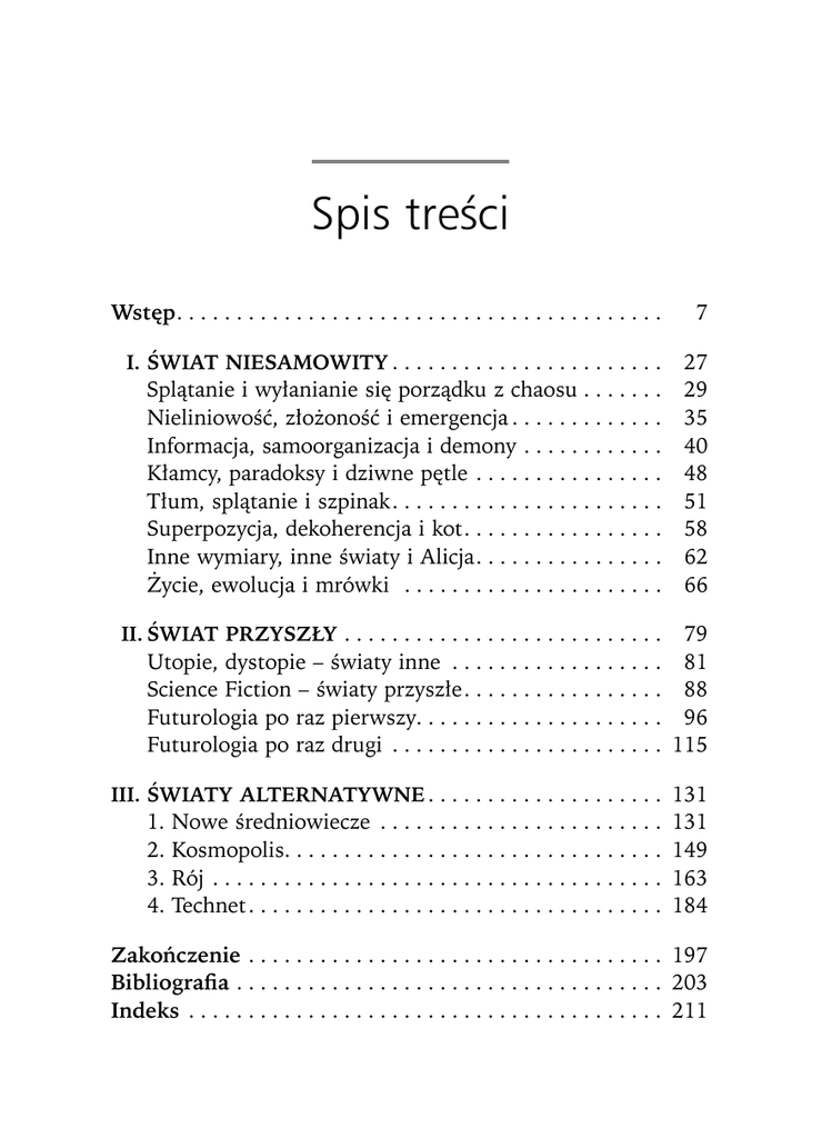 Spis treści Wstęp . . . . . . . . . . . . . . . . . . . . . . . . . . . . . . . . . . . . . . . . 7 I.ŚWIAT NIESAMOWITY . . . . . . . . . . . . . . . . . . . . . . Splątanie i wyłanianie się porządku z chaosu . . . . . . . Nieliniowość, złożoność i emergencja . . . . . . . . . . . . Informacja, samoorganizacja i demony . . . . . . . . . . . . Kłamcy, paradoksy i dziwne pętle . . . . . . . . . . . . . . . . Tłum, splątanie i szpinak . . . . . . . . . . . . . . . . . . . . . . Superpozycja, dekoherencja i kot . . . . . . . . . . . . . . . . Inne wymiary, inne światy i Alicja . . . . . . . . . . . . . . . Życie, ewolucja i mrówki . . . . . . . . . . . . . . . . . . . . . . 27 29 35 40 48 51 58 62 66 II.ŚWIAT PRZYSZŁY . . . . . . . . . . . . . . . . . . . . . . . . . . . Utopie, dystopie – światy inne . . . . . . . . . . . . . . . . . . Science Fiction – światy przyszłe . . . . . . . . . . . . . . . . Futurologia po raz pierwszy . . . . . . . . . . . . . . . . . . . . Futurologia po raz drugi . . . . . . . . . . . . . . . . . . . . . . . 79 81 88 96 115 III.ŚWIATY ALTERNATYWNE . . . . . . . . . . . . . . . . . . . 1. Nowe średniowiecze . . . . . . . . . . . . . . . . . . . . . . . . 2. Kosmopolis . . . . . . . . . . . . . . . . . . . . . . . . . . . . . . . 3. Rój . . . . . . . . . . . . . . . . . . . . . . . . . . . . . . . . . . . . . . 4. Technet . . . . . . . . . . . . . . . . . . . . . . . . . . . . . . . . . . 131 131 149 163 184 Zakończenie . . . . . . . . . . . . . . . . . . . . . . . . . . . . . . . . . . . 197 Bibliografia . . . . . . . . . . . . . . . . . . . . . . . . . . . . . . . . . . . . 203 Indeks . . . . . . . . . . . . . . . . . . . . . . . . . . . . . . . . . . . . . . . . 211 Wstęp Świat się zmienia. Świat stał się coraz bardziej skomplikowany. Świat się skurczył. Wszystko płynie. Wszystko się łączy. Globalne problemy. Globalne wyzwania. Transgraniczność. Transnarodowość. Postsuwerenność. Ponowoczesność. Postludzki(?) Długo by można wymieniać przymiotniki, pojęcia, koncepcje związane ze zmianami jakie zachodzą w globalnym porządku polityczno-społeczno-ekonomicznym. To co je łączy, to dostrzeżenie zmiany, próba jej określenia, znalezienia wspólnego mianownika. To co uderza, to trudność w znalezieniu adekwatnych podejść do wyjaśnienia zachodzących zjawisk. Tradycyjne koncepcje i sposoby analizy wydają się być niewystarczające, a jednak istnieje opór i obawy przed otworzeniem się na nowe/ inne drogi analizowania. Dwa pytania w tym kontekście są kluczowe. Po pierwsze, co chcemy badać? – wydaje się, że wspólnym mianownikiem mogłoby być postrzeganie zmieniającej się rzeczywistości w kategoriach złożonego systemu adaptującego się1. A skoro tak, to w jaki sposób zbadać przestrzeń polityczno-społeczno-ekonomiczną przypominającą ruchome piaski? 1 Ten problem i temat poruszyłam już w kilku książkach (m.in. Emergencja rządzenia sieciowego i Dezagregacja polityki) oraz licznych artykułach naukowych. 8 Wstęp 1. Nieliniowość, dynamika, otwartość Zmiany zachodzące w naszym świecie mają charakter nieliniowy, dynamiczny, piętrzący się i destabilizujący. Wobec tego należy zastosować takie narzędzia badawcze, które analizują tego rodzaju systemy. Analiza adaptujących się systemów złożonych – systemów otwartych będących w stanie „pomiędzy” pozwala nam na inne spojrzenie na takie zjawiska, jak chociażby globalizacja, terroryzm, rozprzestrzenianie się wirusów i innych zjawisk. Banałem być może jest stwierdzenie, że są one złożone, ale tak właśnie jest. Składają się z gromad różnorodnych aktorów, dynamicznie wchodzących ze sobą w interakcje, wywołując przy tym pętlę za pętlą sprzężenia zwrotnego. Zrozumienie wymaga trochę wyobraźni i pewnego wysiłku2. Istotą teorii złożoności jest złożony system adaptujący się – system a nie zbiór niepowiązanych ze sobą działań – układ dynamiczny i skomplikowany. Cechuje go porządek połączonych ze sobą części, które potencjalnie mogą być samodzielnymi podmiotami/aktorami/agentami. Autonomiczna aktywność jednostkowa nie pozostaje bez wpływu na działania innych jednostek, a wszyscy razem wykazują pewien model zachowań, mający charakter bądź to rutyny, albo też zerwania z nią, gdy trzeba sprostać nowym wymaganiom i wytworzyć nowe zachowania. Zdolność podmiotów/aktorów/agentów do zmiany zachowań, a co za tym idzie do wywoływania pętli pozytywnego sprzężenia zwrotnego – czegoś co jest inne, nowe, nieznane czyni system złożonym. Stanowi to przeciwieństwo systemów prostych, gdzie wszyscy zachowują się w sposób przewidywalny. Adaptacja systemu oznacza umiejętność zbiorowego radzenia 2 J.H. Miller, S.E. Page, Complex Adaptive Systems. An Introduction to Computa tional Models of Social Life, Princeton University Press, Princeton, Oxford 2007, s. 8. Wstęp 9 sobie z nowymi wyzwaniami. Takimi systemami, bez wątpienia, są systemy polityczne, takie jak państwo, czy system międzynarodowy, charakteryzujące się pewnym układem strukturalnym, który może ulegać transformacji, czy to pod wpływem bodźców zewnętrznych lub też wewnętrznych. Oczywiście nie oznacza to stanu ciągłej zmiany, mogą istnieć długie okresy stagnacji, trwałości, stabilności, ale nadchodzą też momenty burzy, głębokich wstrząsów i przemian mające wszelkie znamiona złożonych systemów adaptujących się3. Na ten temat napisano już wiele, więc pokrótce. Zmienia się przestrzeń analizy. Procesy globalizacji spowodowały zamazywanie się granic czasowo-przestrzennych. Procesy globalizacji implikują zwiększenie i zagęszczenie przekraczających granice interakcji, które wciągają prawie wszystkie społeczeństwa, państwa, organizacje, grupy podmiotów i jednostki – oczywiście w różnym stopniu zaangażowania – w złożony system wzajemnyc