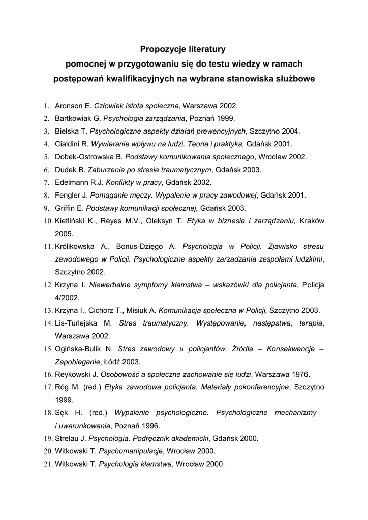 Propozycje literatury pomocnej w przygotowaniu się do testu wiedzy w ramach postępowań kwalifikacyjnych na wybrane stanowiska służbowe 1. Aronson E. Człowiek istota społeczna, Warszawa 2002. 2. Bartkowiak G. Psychologia zarządzania, Poznań 1999. 3. Bielska T. Psychologiczne aspekty działań prewencyjnych, Szczytno 2004. 4. Cialdini R. Wywieranie wpływu na ludzi. Teoria i praktyka, Gdańsk 2001. 5. Dobek-Ostrowska B. Podstawy komunikowania społecznego, Wrocław 2002. 6. Dudek B. Zaburzenie po stresie traumatycznym, Gdańsk 2003. 7. Edelmann R.J. Konflikty w pracy, Gdańsk 2002. 8. Fengler J. Pomaganie męczy. Wypalenie w pracy zawodowej, Gdańsk 2001. 9. Griffin E. Podstawy komunikacji społecznej, Gdańsk 2003. 10. Kietliński K., Reyes M.V., Oleksyn T. Etyka w biznesie i zarządzaniu, Kraków 2005. 11. Królikowska A., Bonus-Dzięgo A. Psychologia w Policji. Zjawisko stresu zawodowego w Policji. Psychologiczne aspekty zarządzania zespołami ludzkimi, Szczytno 2002. 12. Krzyna I. Niewerbalne symptomy kłamstwa – wskazówki dla policjanta, Policja 4/2002. 13. Krzyna I., Cichorz T., Misiuk A. Komunikacja społeczna w Policji, Szczytno 2003. 14. Lis-Turlejska M. Stres traumatyczny. Występowanie, następstwa, terapia, Warszawa 2002. 15. Ogińska-Bulik N. Stres zawodowy u policjantów. Źródła – Konsekwencje – Zapobieganie, Łódź 2003. 16. Reykowski J. Osobowość a społeczne zachowanie się ludzi, Warszawa 1976. 17. Róg M. (red.) Etyka zawodowa policjanta. Materiały pokonferencyjne, Szczytno 1999. 18. Sęk H. (red.) Wypalenie psychologiczne. Psychologiczne mechanizmy i uwarunkowania, Poznań 1996. 19. Strelau J. Psychologia. Podręcznik akademicki, Gdańsk 2000. 20. Witkowski T. Psychomanipulacje, Wrocław 2000. 21. Witkowski T. Psychologia kłamstwa, Wrocław 2000. 22. Doliński J. Wybrane problemy uzależnień w pracy policji, Szczytno 1999. 23. Sztander W. Interwencja wobec osoby uzależnionej, Warszawa 1995. 24. Robbins S.P., DeCenzo D.A. Podstawy zarządzania, Warszawa 2002. 25. Misiuk A., Rajchel K. (red.) Podstawy organizacji i kierowania, Szczytno 2007. 26. Tyszka T. Psychologiczne pułapki oceniania i podejmowania decyzji, Gdańsk 1999. 27. Trzcińska W. Kierowanie zespołami w organizacji, Szczytno 2003. 28. Letkiewicz A. Efektywność decyzji kierowniczych, Szczytno 2001. 29. A. Letkiewicz (red.) Podstawy kierowania organizacjami, Szczytno 2005. 30. A. Letkiewicz Zarządzanie zmianami w organizacji publicznej. Szczytno 2006 31. Misiuk A. (red.) Psychologia kierowania. Komunikacja społeczna w zarządzaniu. Interdyscyplinarny Skrypt dla słuchaczy Studium Zarządzania. Zeszyt nr 2, Szczytno 2001. 32. Listwa T. (red.) Zarządzanie kadrami, Warszawa 2004. 33. Pietkiewicz E. Etykieta menedżera. Warszawa 1993. 34. Żurawik B., Żurawik W. Zarządzanie marketingowe w przedsiębiorstwie, Warszawa 1996. 35. R.McGary, R.K. Wysocki Efektywne zarządzanie projektami. Wyd. 3. Kraków 2003. 36. Lichtarski J. (red.) Podstawy nauki o przedsiębiorstwie, Wrocław 1999. 37. Antoszkiewicz J. A., Pawlak Z. Techniki menedżerskie, Warszawa 2000. 38. Łańcucki J., Rau Z. (red.) Zarządzanie jakością w Policji Wielkopolskiej, Poznań 2003. 39. Steward D. M. (red.) Praktyka kierowania, Warszawa 2002. 40. Żukowski P. Podstawy organizacji i kierowania, Szczecin 1998. 41. Cielecki T. Prewencja kryminalna, Opole 2004. 42. Fiebig J., Bukowski S. Zasady tworzenia strategii komendanta jednostki Policji, Policja 1/2001. 43. Czarnecki B., Siemiński W. Kształtowanie bezpiecznej przestrzeni publicznej, Warszawa 2004, 44. Głowacki R., Łojek K., Urban A. Rewitalizacja przestrzeni fizycznej jako narzędzie zapobiegania przestępczości, Szczytno 2005. 45. Czapska J., Wójcikiewicz J. Policja w społeczeństwie obywatelskim, Zakamycze 1999. 46. Głowacki R. Community policing. Uspołecznienie pracy Policji, Policja 1-2/2000. 47. Salomonowicz Z. Wstęp do prawoznawstwa, Szczytno 2000. 48. Adamiak B., Borkowski J. Kodeks postępowania administracyjnego. Komentarz. Warszawa 2000. 49. Janowicz Z. Kodeks postępowania administracyjnego, Warszawa-Poznań 1999. 50. Barzycka - Banaszczyk M. Prawo pracy, wyd. C.H.BECK Warszawa 2005.