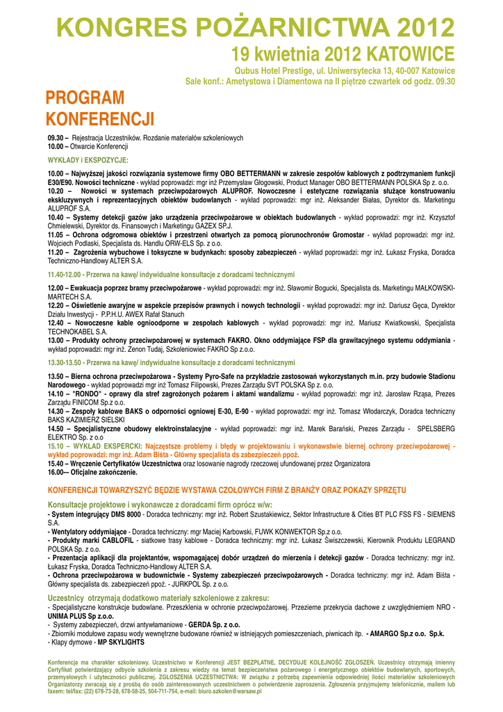 KONGRES POŻARNICTWA 2012 19 kwietnia 2012 KATOWICE Qubus Hotel Prestige, ul. Uniwersytecka 13, 40-007 Katowice Sale konf.: Ametystowa i Diamentowa na II piętrze czwartek od godz. 09.30 PROGRAM KONFERENCJI 09.30 – Rejestracja Uczestników. Rozdanie materiałów szkoleniowych 10.00 – Otwarcie Konferencji WYKŁADY i EKSPOZYCJE: 10.00 – Najwyższej jakości rozwiązania systemowe firmy OBO BETTERMANN w zakresie zespołów kablowych z podtrzymaniem funkcji E30/E90. Nowości techniczne - wykład poprowadzi: mgr inż Przemysław Głogowski, Product Manager OBO BETTERMANN POLSKA Sp z. o.o. 10.20 – Nowości w systemach przeciwpożarowych ALUPROF. Nowoczesne i estetyczne rozwiązania służące konstruowaniu ekskluzywnych i reprezentacyjnych obiektów budowlanych - wykład poprowadzi: mgr inż. Aleksander Białas, Dyrektor ds. Marketingu ALUPROF S.A. 10.40 – Systemy detekcji gazów jako urządzenia przeciwpożarowe w obiektach budowlanych - wykład poprowadzi: mgr inż. Krzysztof Chmielewski, Dyrektor ds. Finansowych i Marketingu GAZEX SP.J. 11.05 – Ochrona odgromowa obiektów i przestrzeni otwartych za pomocą piorunochronów Gromostar - wykład poprowadzi: mgr inż. Wojciech Podlaski, Specjalista ds. Handlu ORW-ELS Sp. z o.o. 11.20 – Zagrożenia wybuchowe i toksyczne w budynkach: sposoby zabezpieczeń - wykład poprowadzi: mgr inż. Łukasz Fryska, Doradca Techniczno-Handlowy ALTER S.A. 11.40-12.00 - Przerwa na kawę/ indywidualne konsultacje z doradcami technicznymi 12.00 – Ewakuacja poprzez bramy przeciwpożarowe - wykład poprowadzi: mgr inż. Sławomir Bogucki, Specjalista ds. Marketingu MAŁKOWSKIMARTECH S.A. 12.20 – Oświetlenie awaryjne w aspekcie przepisów prawnych i nowych technologii - wykład poprowadzi: mgr inż. Dariusz Gęca, Dyrektor Działu Inwestycji - P.P.H.U. AWEX Rafał Stanuch 12.40 – Nowoczesne kable ognioodporne w zespołach kablowych - wykład poprowadzi: mgr inż. Mariusz Kwiatkowski, Specjalista TECHNOKABEL S.A. 13.00 – Produkty ochrony przeciwpożarowej w systemach FAKRO. Okno oddymiające FSP dla grawitacyjnego systemu oddymiania wykład poprowadzi: mgr inż. Zenon Tudaj, Szkoleniowiec FAKRO Sp z.o.o. 13.30-13.50 - Przerwa na kawę/ indywidualne konsultacje z doradcami technicznymi 13.50 – Bierna ochrona przeciwpożarowa - Systemy Pyro-Safe na przykładzie zastosowań wykorzystanych m.in. przy budowie Stadionu Narodowego - wykład poprowadzi mgr inż Tomasz Filipowski, Prezes Zarządu SVT POLSKA Sp z. o.o. 14.10 – "RONDO" - oprawy dla stref zagrożonych pożarem i aktami wandalizmu - wykład poprowadzi: mgr inż. Jarosław Rząsa, Prezes Zarządu FINICOM Sp.z o.o. 14.30 – Zespoły kablowe BAKS o odporności ogniowej E-30, E-90 - wykład poprowadzi: mgr inż. Tomasz Włodarczyk, Doradca techniczny BAKS KAZIMIERZ SIELSKI 14.50 – Specjalistyczne obudowy elektroinstalacyjne - wykład poprowadzi: mgr inż. Marek Barański, Prezes Zarządu - SPELSBERG ELEKTRO Sp. z o.o 15.10 – WYKŁAD EKSPERCKI: Najczęstsze problemy i błędy w projektowaniu i wykonawstwie biernej ochrony przeciwpożarowej wykład poprowadzi: mgr inż. Adam Biśta - Główny specjalista ds zabezpieczeń ppoż. 15.40 – Wręczenie Certyfikatów Uczestnictwa oraz losowanie nagrody rzeczowej ufundowanej przez Organizatora 16.00-– Oficjalne zakończenie. KONFERENCJI TOWARZYSZYĆ BĘDZIE WYSTAWA CZOŁOWYCH FIRM Z BRANŻY ORAZ POKAZY SPRZĘTU Konsultacje projektowe i wykonawcze z doradcami firm oprócz w/w: - System integrujący DMS 8000 - Doradca techniczny: mgr inż. Robert Szustakiewicz, Sektor Infrastructure & Cities BT PLC FSS FS - SIEMENS S.A. - Wentylatory oddymiające - Doradca techniczny: mgr Maciej Karbowski, FUWK KONWEKTOR Sp.z o.o. - Produkty marki CABLOFIL - siatkowe trasy kablowe - Doradca techniczny: mgr inż. Łukasz Świszczewski, Kierownik Produktu LEGRAND POLSKA Sp. z o.o. - Prezentacja aplikacji dla projektantów, wspomagającej dobór urządzeń do mierzenia i detekcji gazów - Doradca techniczny: mgr inż. Łukasz Fryska, Doradca Techniczno-Handlowy ALTER S.A. - Ochrona przeciwpożarowa w budownictwie - Systemy zabezpieczeń przeciwpożarowych - Doradca techniczny: mgr inż. Adam Biśta Główny specjalista ds. zabezpieczeń ppoż. - JURKPOL Sp. z o.o. Uczestnicy otrzymają dodatkowo materiały szkoleniowe z zakresu: - Specjalistyczne konstrukcje budowlane. Przeszklenia w ochronie przeciwpożarowej. Przezierne przekrycia dachowe z uwzględniemiem NRO UNIMA PLUS Sp z.o.o. - Systemy zabezpieczeń, drzwi antywłamaniowe - GERDA Sp. z o.o. - Zbiorniki modułowe zapasu wody wewnętrzne budowane również w istniejących pomieszczeniach, piwnicach itp. - AMARGO Sp.z o.o. Sp.k. - Klapy dymowe - MP SKYLIGHTS Konferencja ma charakter szkoleniowy. Uczestnictwo w Konferencji JEST BEZPŁATNE, DECYDUJE KOLEJNOŚĆ ZGŁOSZEŃ. Uczestnicy otrzymają imienny Certyfikat potwierdzający odbycie szkolenia z zakresu wiedzy na temat bezpieczeństwa pożarowego i energetycznego obiektów budowlanych, sportowych, przemysłowych i użyteczności publicznej. ZGŁOSZENIA UCZESTNICTWA: W związku z potrzebą zapewnienia odpowiedniej ilości materiałów szkoleniowych Organizatorzy zwracają się z prośbą do osób zainteresowanych uczestnictwem o potwierdzenie zaproszenia. Zgłoszenia przyjmujemy telefonicznie, mailem lub faxem: tel/fax: (22) 678-73-28, 678-58-25, 504-711-754, e-mail: [email protected]