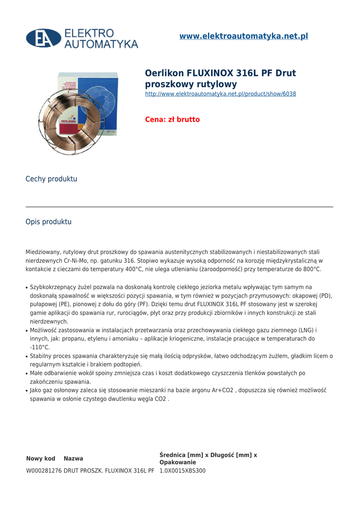 Oerlikon FLUXINOX 316L PF Drut proszkowy rutylowy