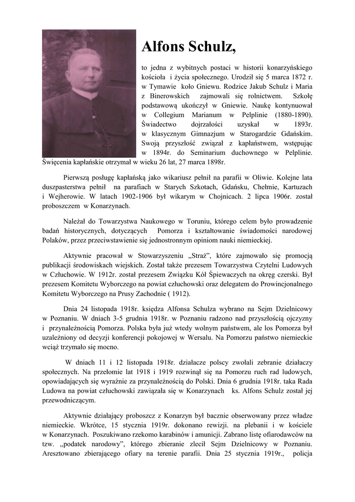 Alfons Schulz, to jedna z wybitnych postaci w historii konarzyńskiego kościoła i życia społecznego. Urodził się 5 marca 1872 r. w Tymawie koło Gniewu. Rodzice Jakub Schulz i Maria z Binerowskich zajmowali się rolnictwem. Szkołę podstawową ukończył w Gniewie. Naukę kontynuował w Collegium Marianum w Pelplinie (1880-1890). Świadectwo dojrzałości uzyskał w 1893r. w klasycznym Gimnazjum w Starogardzie Gdańskim. Swoją przyszłość związał z kapłaństwem, wstępując w 1894r. do Seminarium duchownego w Pelplinie. Święcenia kapłańskie otrzymał w wieku 26 lat, 27 marca 1898r. Pierwszą posługę kapłańską jako wikariusz pełnił na parafii w Oliwie. Kolejne lata duszpasterstwa pełnił na parafiach w Starych Szkotach, Gdańsku, Chełmie, Kartuzach i Wejherowie. W latach 1902-1906 był wikarym w Chojnicach. 2 lipca 1906r. został proboszczem w Konarzynach. Należał do Towarzystwa Naukowego w Toruniu, którego celem było prowadzenie badań historycznych, dotyczących Pomorza i kształtowanie świadomości narodowej Polaków, przez przeciwstawienie się jednostronnym opiniom nauki niemieckiej. Aktywnie pracował w Stowarzyszeniu „Straż”, które zajmowało się promocją publikacji środowiskach wiejskich. Został także prezesem Towarzystwa Czytelni Ludowych w Człuchowie. W 1912r. został prezesem Związku Kół Śpiewaczych na okręg czerski. Był prezesem Komitetu Wyborczego na powiat człuchowski oraz delegatem do Prowincjonalnego Komitetu Wyborczego na Prusy Zachodnie ( 1912). Dnia 24 listopada 1918r. księdza Alfonsa Schulza wybrano na Sejm Dzielnicowy w Poznaniu. W dniach 3-5 grudnia 1918r. w Poznaniu radzono nad przyszłością ojczyzny i przynależnością Pomorza. Polska była już wtedy wolnym państwem, ale los Pomorza był uzależniony od decyzji konferencji pokojowej w Wersalu. Na Pomorzu państwo niemieckie wciąż trzymało się mocno. W dniach 11 i 12 listopada 1918r. działacze polscy zwołali zebranie działaczy społecznych. Na przełomie lat 1918 i 1919 rozwinął się na Pomorzu ruch rad ludowych, opowiadających się wyraźnie za przynależnością do Polski. Dnia 6 grudnia 1918r. taka Rada Ludowa na powiat człuchowski zawiązała się w Konarzynach ks. Alfons Schulz został jej przewodniczącym. Aktywnie działający proboszcz z Konarzyn był bacznie obserwowany przez władze niemieckie. Wkrótce, 15 stycznia 1919r. dokonano rewizji. na plebanii i w kościele w Konarzynach. Poszukiwano rzekomo karabinów i amunicji. Zabrano listę ofiarodawców na tzw. ,,podatek narodowy”, którego zbieranie zlecił Sejm Dzielnicowy w Poznaniu. Aresztowano zbierającego ofiary na terenie parafii. Dnia 25 stycznia 1919r., policja niemiecka aresztowała księdza Alfonsa Schulza i więziła go do 24 marca 1919r. w areszcie sądu w Człuchowie. W sprawie jego uwolnienia skutecznie interweniowały liczne organizacje polskie, w tym Rada Żołnierzy Polaków w Gdańsku. Na wiadomość o zwolnieniu cenionego i lubianego proboszcza, parafianie konarzyńscy, specjalną sztafetą powozów przywieźli do domu. Do dzisiaj starsi Konarzynianie wspominają to wydarzenie, przekazane im przez przodków. Uwolniony ks. Alfons Schulz zaangażował się w prace Komisji Granicznej. Pierwotnie wytyczanie granicy było bardzo niekorzystne dla ludności polskiej. Niepokój oraz wzburzenie Kaszubów wywołały protesty. Dzięki jego oraz ks. Józefa Gończy z Borowego Młyna postawie Międzynarodowa Komisja Graniczna dokonała korekty linii granicznej. Od połowy lutego 1920 r. rozpoczęło się wytyczanie granicy polsko-niemieckiej na ziemi chojnickiej. Dzięki osobistemu zaangażowaniu księdza proboszcza z Konarzyn i argumentom przytoczonym na posiedzeniu Komisji Granicznej w Chojnicach 15 maja 1920 r. przy Polsce pozostawiono dodatkowe 3 wioski, tj. Ciecholewy, Konarzyny i Żychce, jak również szosę wiodącą do Chojnic. Konarzyny, jako miejscowość rolnicza wiele zawdzięczała ówczesnemu proboszczowi. Żywo interesował się sprawami swoich mieszkańców. W 1909 r. założył Kółko Rolnicze, któremu przewodniczył. Jako członek Sejmiku Powiatowego w Chojnicach został wybrany do Pomorskiej Izby Rolniczej, gdzie w latach 1924-1929 zasiadał w Komisji Szkolnej. Należał także do zarządu powiatowego Pomorskiego Towarzystwa Rolniczego W Konarzynach w 1926 r. założył Towarzystwo Robotników oraz Towarzystwo Gimnastyczne „Sokół˝. Do dzisiaj funkcjonuje boisko gminne, które powstało z inicjatywy księdza Schulza. Zasiadał też w Sejmiku Powiatowym w Chojnicach. W latach 1924- 1929 ks. Schulz udzielał się aktywnie w Komisji Szkolnej Pomorskiej Izby Rolniczej. Zaangażowanie zarówno duszpasterskie jak i społeczne zostało docenione przez kurię biskupią. Dnia 24 września 1924 r. został nominowany na dziekana dekanatu chojnickiego. Został również wizytatorem nauki religii w szkołach powszechnych na okręg dekanatu. W 1928r. brał udział w synodzie diecezjalnym w Pelplinie. Zapewne wielkie zaangażowanie księdza przyczyniło się do pielęgnowania wartości patriotycznych w Konarzynach. W latach międzywojennych w samych Konarzynach jak i okolicznych miejscowościach bardzo uroczyście obchodzono Święto Niepodległości oraz kultywowano postać Marszałka Józefa Piłsudskiego. Najwyraźniej to widać w ulotce wyborczej do senatu. Być może to przyczyniło się do inicjatywy budowy pomnika Józefa Piłsudskiego w Konarzynach. W 1930 r. został wybrany z listy Bezpartyjnego Bloku Współpracy z Rządem Senatorem Rzeczypospolitej. Z tego powodu krytykowany był przez prasę Stronnictwa Narodowego. Endecki „Dziennik Pomorski” tak relacjonował spotkanie BBWR w Starogardzie Gdańskim – ks. dziekan A. Schulz mówił do wyborców „ Za Niemiec byliśmy prześladowani, a przeciw temu jest Marszałek Piłsudski i jemu zawdzięczamy, że jesteśmy wolni (…); rządzący, a Piłsudski szczególnie, a prawie że jedynie, starają się o utrzym