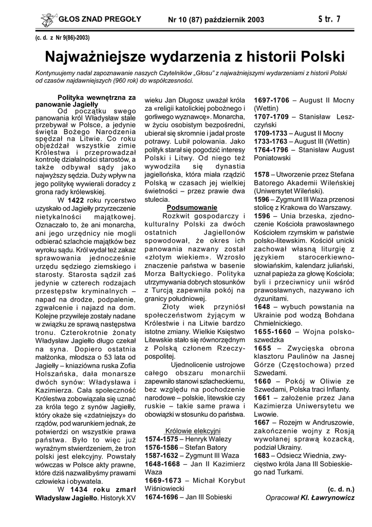 GŁOS ZNAD PREGOŁY Nr 10 (87) październik 2003 Str. 7 (c. d. z Nr 9(86)-2003) Najważniejsze wydarzenia z historii Polski Kontynuujemy nadal zapoznawanie naszych Czytelników „Głosu” z najważniejszymi wydarzeniami z historii Polski od czasów najdawniejszych (960 rok) do współczesności. Polityka wewnętrzna za panowanie Jagiełły Od początku swego panowania król Władysław stale przebywał w Polsce, a jedynie święta Bożego Narodzenia spędzał na Litwie. Co roku objeżdżał wszystkie zimie Królestwa i przeprowadzał kontrolę działalności starostów, a także odbywał sądy jako najwyższy sędzia. Duży wpływ na jego politykę wywierali doradcy z grona rady królewskiej. W 1422 roku rycerstwo uzyskało od Jagiełły przyrzeczenie nietykalności majątkowej. Oznaczało to, że ani monarcha, ani jego urzędnicy nie mogli odbierać szlachcie majątków bez wyroku sądu. Król wydał też zakaz sprawowania jednocześnie urzędu sędziego ziemskiego i starosty. Starosta sądził zaś jedynie w czterech rodzajach przestępstw kryminalnych – napad na drodze, podpalenie, zgwałcenie i najazd na dom. Kolejne przywileje zostały nadane w związku ze sprawą następstwa tronu. Czterokrotnie żonaty Władysław Jagiełło długo czekał na syna. Dopiero ostatnia małżonka, młodsza o 53 lata od Jagiełły – kniaziówna ruska Zofia Holszańska, dała monarsze dwóch synów: W ładysława i Kazimierza. Cała społeczność Królestwa zobowiązała się uznać za króla tego z synów Jagiełły, który okaże się «zdatniejszy» do rządów, pod warunkiem jednak, że potwierdzi on wszystkie prawa państwa. Było to więc już wyraźnym stwierdzeniem, że tron polski jest elekcyjny. Powstały wówczas w Polsce akty prawne, które dziś nazwalibyśmy prawami człowieka i obywatela. W 1434 roku zmarł Władysław Jagiełło. Historyk XV wieku Jan Długosz uważał króla za «religii katolickiej pobożnego i gorliwego wyznawcę». Monarcha, w życiu osobistym bezpośredni, ubierał się skromnie i jadał proste potrawy. Lubił polowania. Jako polityk starał się pogodzić interesy Polski i Litwy. Od niego też wywodziła się dynastia jagiellońska, która miała rządzić Polską w czasach jej wielkiej świetności – przez prawie dwa stulecia. Podsumowanie Rozkwit gospodarczy i kulturalny Polski za dwóch ostatnich Jagiellonów spowodował, że okres ich panowania nazwany został «złotym wiekiem». W zrosło znaczenie państwa w basenie Morza Bałtyckiego. Polityka utrzymywania dobrych stosunków z Turcją zapewniła pokój na granicy południowej. Złoty wiek przyniósł społeczeństwom żyjącym w Królestwie i na Litwie bardzo istotne zmiany. Wielkie Księstwo Litewskie stało się równorzędnym z Polską członem Rzeczypospolitej. Ujednolicenie ustrojowe całego obszaru monarchii zapewniło stanowi szlacheckiemu, bez względu na pochodzenie narodowe – polskie, litewskie czy ruskie – takie same prawa i obowiązki w stosunku do państwa. Królowie elekcyjni 1574-1575 – Henryk Walezy 1576-1586 – Stefan Batory 1587-1632 – Zygmunt III Waza 1648-1668 – Jan II Kazimierz Waza 1669-1673 – Michał Korybut Wiśniowiecki 1674-1696 – Jan III Sobieski 1697-1706 – August II Mocny (Wettin) 1707-1709 – Stanisław Leszczyński 1709-1733 – August II Mocny 1733-1763 – August III (Wettin) 1764-1796 – Stanisław August Poniatowski 1578 – Utworzenie przez Stefana Batorego Akademii Wileńskiej (Uniwersytet Wileński). 1596 – Zygmunt III Waza przenosi stolicę z Krakowa do Warszawy. 1596 – Unia brzeska, zjednoczenie Kościoła prawosławnego Kościołem rzymskim w państwie polsko-litewskim. Kościół unicki zachował własną liturgię z językiem starocerkiewnosłowiańskim, kalendarz juliański, uznał papieża za głowę Kościoła; byli i przeciwnicy unii wśród prawosławnych, nazywano ich dyzunitami. 1648 – wybuch powstania na Ukrainie pod wodzą Bohdana Chmielnickiego. 1655-1660 – Wojna polskoszwedzka 1655 – Zwycięska obrona klasztoru Paulinów na Jasnej Górze (Częstochowa) przed Szwedami. 1660 – Pokój w Oliwie ze Szwedami, Polska traci Inflanty. 1661 – założenie przez Jana Kazimierza Uniwersytetu we Lwowie. 1667 – Rozejm w Andruszowie, zakończenie wojny z Rosją wywołanej sprawą kozacką, podział Ukrainy. 1683 – Odsiecz Wiednia, zwycięstwo króla Jana III Sobieskiego nad Turkami. (c. d. n.) Opracował Kl. Ławrynowicz