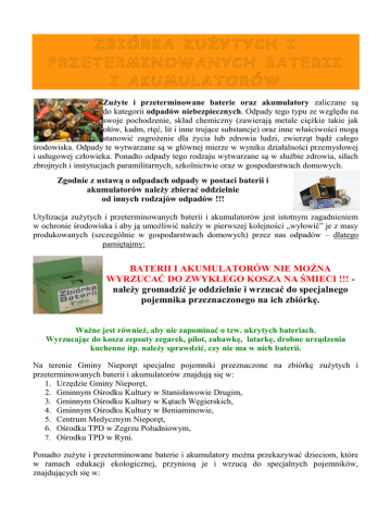 Zużyte i przeterminowane baterie oraz akumulatory zaliczane są do kategorii odpadów niebezpiecznych. Odpady tego typu ze względu na swoje pochodzenie, skład chemiczny (zawierają metale ciężkie takie jak ołów, kadm, rtęć, lit i inne trujące substancje) oraz inne właściwości mogą stanowić zagrożenie dla życia lub zdrowia ludzi, zwierząt bądź całego środowiska. Odpady te wytwarzane są w głównej mierze w wyniku działalności przemysłowej i usługowej człowieka. Ponadto odpady tego rodzaju wytwarzane są w służbie zdrowia, siłach zbrojnych i instytucjach paramilitarnych, szkolnictwie oraz w gospodarstwach domowych. Zgodnie z ustawą o odpadach odpady w postaci baterii i akumulatorów należy zbierać oddzielnie od innych rodzajów odpadów !!! Utylizacja zużytych i przeterminowanych baterii i akumulatorów jest istotnym zagadnieniem w ochronie środowiska i aby ją umożliwić należy w pierwszej kolejności „wyłowić” je z masy produkowanych (szczególnie w gospodarstwach domowych) przez nas odpadów – dlatego pamiętajmy: BATERII I AKUMULATORÓW NIE MOŻNA WYRZUCAĆ DO ZWYKŁEGO KOSZA NA ŚMIECI !!! należy gromadzić je oddzielnie i wrzucać do specjalnego pojemnika przeznaczonego na ich zbiórkę. Ważne jest również, aby nie zapominać o tzw. ukrytych bateriach. Wyrzucając do kosza zepsuty zegarek, pilot, zabawkę, latarkę, drobne urządzenia kuchenne itp. należy sprawdzić, czy nie ma w nich baterii. Na terenie Gminy Nieporęt specjalne pojemniki przeznaczone na zbiórkę zużytych i przeterminowanych baterii i akumulatorów znajdują się w: 1. Urzędzie Gminy Nieporęt, 2. Gminnym Ośrodku Kultury w Stanisławowie Drugim, 3. Gminnym Ośrodku Kultury w Kątach Węgierskich, 4. Gminnym Ośrodku Kultury w Beniaminowie, 5. Centrum Medycznym Nieporęt, 6. Ośrodku TPD w Zegrzu Południowym, 7. Ośrodku TPD w Ryni. Ponadto zużyte i przeterminowane baterie i akumulatory można przekazywać dzieciom, które w ramach edukacji ekologicznej, przyniosą je i wrzucą do specjalnych pojemników, znajdujących się w: 1. 2. 3. 4. 5. 6. Szkole Podstawowej w Nieporęcie, Szkole Podstawowej w Białobrzegach, Szkole Podstawowej w Wólce Radzymińskiej Szkole Podstawowej w Józefowie, Szkole Podstawowej w Izabelinie Gimnazjum w Stanisławowie Pierwszym. WYKAZ PUNKTÓW ZBIÓRKI BATERII – miejsc, w których zostały ustawione specjalne pojemniki służące do zbiórki zużytych i przeterminowanych baterii i akumulatorów - pozyskanych w ramach programu „Baterio Wróć” - Nieporęt (przedstawiony poniżej). Lp. 1 2 3 4 5 Punkt Sklep Wielobranżowy Zalewska - Makiewicz S.C. Sklep SpożywczoPrzemysłowy Bogusława Woźniakowska Mini Delikatesy S.C. ART.-EL S.C.. (Sklep elektrotechniczny) Sklep SpożywczoPrzemysłowy Adres Sołectwo Ilość pojemników Os. Wojskowe paw 108 Białobrzegi 1 ul. Przyszłość 38 A Stanisławów Pierwszy 1 ul. Strużańska 2 ul. J. Kazimierza 328 Stanisławów Pierwszy Stanisławów Pierwszy 1 1 ul. Małołęcka 36 C Nieporęt 1 ul. Zegrzyńska 16 A Nieporęt 1 ul. Stegna 5 Rynia 1 6 Delikatesy Zegrzyńskie S.C. 7 Sklep Spoż, Krysia 8 Wisienka 2 ul. Główna 14 Rynia 1 9 Sklep Ogólno Spożywczy ul. Fortowa 43 Beniaminów 1 10 P.W. EWAREM S.C. ul. Cicha 2 B 11 Sklep Spoż. Przem. ul. Szkolna 71 12 Sklep Wielobranżowy ul. Topolowa 4 A 13 “Delikatesy na górce” ul. Kwiatowa 53 14 "U Marty" Sklep Spoż.Przem. Marta Bałdyga ul. Kościelna 1 Kąty Węgierskie 1 15 Duet Adrianna Brynda ul. Strużańska 133 A Rembelszczyzna 1 16 "U Kopra" Sklep SpożywczoPrzemysłowy Krzysztof Leszek Koperski ul. Graniczna 1 Stanisławów Pierwszy 1 Wólka Radzymińska Wólka Radzymińska Wólka Radzymińska MichałówGrabina 1 1 1 1