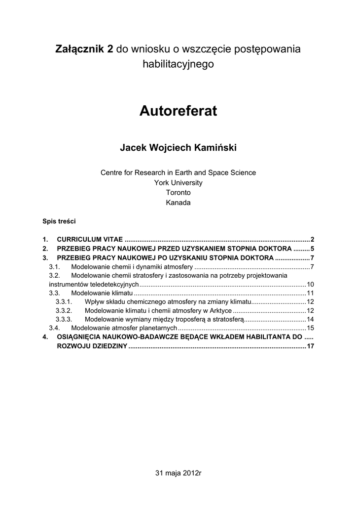 Załącznik 2 do wniosku o wszczęcie postępowania habilitacyjnego Autoreferat Jacek Wojciech Kamiński Centre for Research in Earth and Space Science York University Toronto Kanada Spis treści 1. 2. 3. CURRICULUM VITAE .....................................................................................................2 PRZEBIEG PRACY NAUKOWEJ PRZED UZYSKANIEM STOPNIA DOKTORA .........5 PRZEBIEG PRACY NAUKOWEJ PO UZYSKANIU STOPNIA DOKTORA ...................7 3.1. Modelowanie chemii i dynamiki atmosfery ...............................................................7 3.2. Modelowanie chemii stratosfery i zastosowania na potrzeby projektowania instrumentów teledetekcyjnych...........................................................................................10 3.3. Modelowanie klimatu ..............................................................................................11 3.3.1. Wpływ składu chemicznego atmosfery na zmiany klimatu..............................12 3.3.2. Modelowanie klimatu i chemii atmosfery w Arktyce ........................................12 3.3.3. Modelowanie wymiany między troposferą a stratosferą..................................14 3.4. Modelowanie atmosfer planetarnych ......................................................................15 4. OSIĄGNIĘCIA NAUKOWO-BADAWCZE BĘDĄCE WKŁADEM HABILITANTA DO ..... ROZWOJU DZIEDZINY .................................................................................................17 31 maja 2012r 1. CURRICULUM VITAE WYKSZTAŁCENIE 1994 1980 Ph. D. Centre for Research in Earth and Space Science, York University, Toronto, Kanada tytuł rozprawy: A Study of Stratospheric Chemistry Using a 3D Global Chemical Transport Model. promotor: Prof. John C. McConnell, FRSC nostryfikacja: Doktor nauk technicznych, Politechnika Warszawska, 2010 Mgr. inż. Systemy ochrony atmosfery i meteorologia techniczna Wydział Inżynierii Sanitarnej i Wodnej Politechnika Warszawska tytuł pracy: Weryfikacja modelu rozprzestrzeniania się zanieczyszczeń atmosferycznych pochodzących z niskich źródeł emisji promotor: dr hab. inż. Stanisław Chruściel NADANE TYTUŁY AKADEMICKIE 2006 - Adjunct Professor Faculty of Graduate Studies, York University, Toronto 2004 - Adjunct Professor Centre for Research in Earth and Space Science, York University, Toronto NAGRODY I WYRÓŻNIENIA 1988 i 1989 Laureat konkursu na stypendium doktoranckie Environment Canada 1978 i 1979 Nagroda Dziekana ISiW PW po III i IV roku studiów magisterskich DZIAŁALNOŚĆ ORGANIZACYJNA 2012 2011 Chair of Local Organizing Committee - Quadrennial Ozone Symposium Toronto, August 2012, http://www.cmos.ca/QOS2012 Fundator i Prezes, Fundacja EkoPrognoza, Warszawa, www.EkoPrognoza.pl CZŁONKOWSTWO • • American Geophysical Union European Geophysical Union Jacek Wojciech Kamiński Załącznik 2, strona 2 DOŚWIADCZENIE ZAWODOWE 2002 - Director, Atmospheric Modelling and Data Assimilation Laboratory Centre for Research in Earth and Space Science York University, Toronto 2010 - 2011 Visiting Research Scientist, Environment Canada, Toronto 2002 - President, WxPrime Corporation, Toronto 2002 - 2007 Executive Director, Multiscale Air Quality Network, York University, Toronto 2002 Vice President, EarthGuard Environmental Group Inc. Toronto 1987 - 2002 President, Atmospheric Research and Modelling Consultants, Toronto 1981 - 1987 Atmospheric Scientist, Meteorological Environmental Planning Ltd, Toronto PROJEKTY NAUKOWE 2012 - Global and regional air quality climate simulations using GEM-AQ in the context of IPCC AR5 Grant - Canadian Foundation for Climate and Atmospheric Sciences, $100 tys, Główny wykonawca. 2010 - Development of the GEM-Mars model - MATMOS instrument design Kontrakt - Canadian Space Agency, $180 tys, Główny wykonawca. 2009 - Exploration of UTLS processes using OSIRIS and ACE data with extended GEM-AQ Grant - Canadian Space Agency, $191 tys, Kierownik projektu. 2009 - 2011 PREMIER Study - IMPACT - Quantification of atmospheric pollution and climate aspects. Core candidate for Earth Explorer mission Kontrakt - European Space Agency, wartość projektu 500 tys €, Główny wykonawca. 2009 - 2012 PREMIER Study - CORSA - Consolidation of requirements and synergistic retrieval algorithm. Core candidate for Earth Explorer mission Kontrakt - European Space Agency, 500 tys €, Główny wykonawca. 2007 - 2011 North American Air Quality Grant - Canadian Foundation for Climate and Atmospheric Sciences, $200 tys, Główny wykonawca. 2007 - 2011 Air Quality in Future Climate Grant - Ontario Ministry of Environment, $150 tys, Główny wykonawca 2006 - 2007 Potential impact of aviation emissions on the upper troposphere and lower stratosphere Kontrakt -Transport Canada, $100 tys, Kierownik projektu. 2006 - 2010 Chemical – Dynamical Studies of the Troposphere and Stratosphere with a Jacek Wojciech Kamiński Załącznik 2, strona 3 High Resolution Model GEM-strato, Grant - Canadian Foundation for Climate and Atmospheric Sciences, $300 tys, Kierownik projektu. PROJEKTY W LATACH 1981 DO 2002 W tym okresie brałem udział w licznych projektach badawczych związanych z rozwojem i zastosowaniem modeli chemii atmosfery. Wyniki prac udokumentowane zostały w szeregu publikacji w czasopismach naukowych. Poniższe projekty były finansowane m.in. ze środków Natural Sciences and Engineering Research Council of Canada, Environment Canada, Transport Canada, Health Canada, Canadian Foundation for Climate and Atmospheric Sciences, Canadian Space Agency, Ontario Ministry of the Environment, European Space Agency, US Federal Aviation Administration: • Study of stratospheric chemistry and the development of a global chemical tracer model to investigate formation of the Antarctic ozone hole. • Regional air quality study using the Acid Deposition and Oxidants Model (ADOM). • Development of on-line chemistry in the MC2 mesoscale model, MC2-AQ. • Stratospheric and troposph