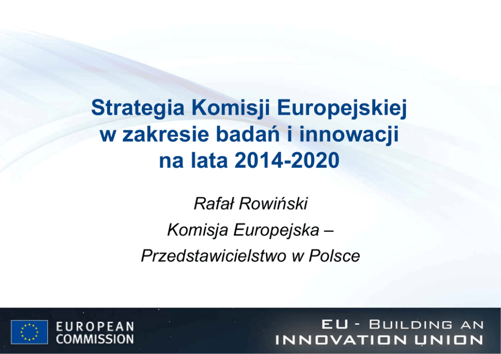 Strategia Komisji Europejskiej w zakresie badań i innowacji na lata 2014-2020 Rafał Rowiński Komisja Europejska – Przedstawicielstwo w Polsce Plan prezentacji • Nowa strategia wzrostu dla Europy jako podstawa polityki innowacji • Po co nam „Unia Innowacji”? • Bariery dla innowacji oraz kluczowe działania przewidziane w ramach Unii Innowacji Strategia Europa 2020 • Zaprezentowana przez Komisję Europejską w marcu 2010 • Wizja wyzwań i rozwoju Europy do 2020 roku • Proponuje nowy model wzrostu gospodarczego dla UE: - inteligentnego (opartego na wiedzy, innowacji, edukacji i społeczeństwie cyfrowym) - zrównoważonego (efektywnie wykorzystującego zasoby przy jednoczesnej poprawie konkurencyjności) - „wrażliwego” społecznie (zwiększającego zatrudnienie, opartego na podwyższaniu umiejętności i eliminującego ubóstwo) Strategia Europa 2020: cele • ¾ • • • • ¾ Konkretne i mierzalne cele w pięciu obszarach polityki UE wytyczają kierunki rozwoju i umożliwiają sprawny monitoring Badania i rozwój oraz innowacje: na inwestycje w badania i rozwój oraz w innowacje powinniśmy przeznaczać 3 proc. PKB Unii – łącznie ze środków publicznych i prywatnych Cele narodowe: POLSKA: 0.6% PKB 2011 – 1.7% PKB 2020 Zatrudnienie: 75 proc. osób w wieku 20-64 lat powinno mieć pracę Zmiany klimatu i energia: należy ograniczyć emisje gazów cieplarnianych o 20 proc. w stosunku do poziomu z 1990 r. (lub nawet o 30 proc., jeśli warunki będą sprzyjające) 20 proc. energii powinno pochodzić ze źródeł odnawialnych, efektywność energetyczna powinna wzrosnąć o 20 proc. Edukacja: odsetek młodych ludzi przedwcześnie porzucających naukę nie powinien przekraczać 10 proc., co najmniej 40 proc. osób w wieku 30-34 powinno mieć wykształcenie wyższe Ubóstwo i wykluczenie społeczne: zmniejszenie liczby osób zagrożonych ubóstwem i wykluczeniem społecznym o co najmniej 20 mln. Monitoring i koordynacja poprzez Narodowe Programy Reform zakotwiczone w „semestrze europejskim” Semestr europejski Grudzień Komisja Europejska Rada Ministrów Parlament Europejski Rada Europejska Państwa Członkowskie St. - luty Marzec Kwiecień Maj Czerwiec Sprawozdanie roczne Lipiec Projekt zaleceń politycznych Debata i pierwsze orientacje Przyjęcie zaleceń Jesień: wzajemny monitoring Debata i pierwsze orientacje Szczyt gospodarczy Orientacje polityczne Przyjęcie Krajowych Planów Reform oraz Planów Stabilności i Konwergencji Jesień: wdrażanie planów narodowych Strategia Europa 2020: Inicjatywy Przewodnie Inicjatywy Przewodnie określają szczegółowe strategie działania w kluczowych obszarach oraz definiują partnerstwo pomiędzy Komisją Europejską i państwami członkowskimi Inteligentny wzrost gospodarczy • Europejska agenda cyfrowa • Unia Innowacji (06.10.2010) • Mobilna młodzież Trwały wzrost gospodarczy • Europa efektywnie korzystająca z zasobów • Polityka przemysłowa w erze globalizacji Wzrost gospodarczy sprzyjający włączeniu społecznemu • Program na rzecz nowych umiejętności i zatrudnienia • Europejski program walki z ubóstwem Unia Innowacji - argumenty • Co będzie podstawą dla przyszłej konkurencyjności Europy? • Jak będziemy tworzyć wzrost gospodarczy i nowe miejsca pracy? • Jak zajmiemy się rosnącymi problemami społecznymi takimi jak zmiany klimatu, dostawy energii, niedobór zasobów i zmiany demograficzne? Æ Odpowiedzią jest INNOWACJA czyli nowe rozwiązania i usprawnienia w zakresie produktów, usług, procesów, modeli biznesowych i społecznych Æ Europie potrzebne strategiczne podejście do B+I oraz dalsze inwestowanie mimo kryzysu Mierniki m.in..: liczba absolwentów szkół wyższych oraz uzyskanych doktoratów, wydatki na BRI, liczba publikacji naukowych i patentów, dochody z patentów i licencji, eksport produktów zaawansowanych technologicznie, itp.. Unia Innowacji • Liderzy innowacji: Dania, Finlandia, Niemcy, Szwecja (więcej niż 20% powyżej średniej UE) • „Goniący” innowatorzy: Austria, Belgia, Cypr, Estonia, Francja, Irlandia, Luxemburg, Holandia, Słowenia (od 20% powyżej do 10% poniżej średniej UE) • Innowatorzy „umiarkowani”: Czechy, Grecja, Węgry, Włochy, Malta, Polska, Portugalia, Słowacja, Hiszpania (10-50% poniżej średniej UE) • Innowatorzy „skromni”: Litwa, Łotwa, Bułgaria, oraz Rumunia (ponad 50% poniżej średniej UE) Bariery dla badań i innowacji • Niedoinwestowanie w podstawy innowacji (niskie nakłady na badania i rozwój, bariery dla karier naukowców, braki w infrastrukturze badawczej) • Niezadowalające warunki ramowe (utrudniony dostęp do finansowania i wysokich kosztów praw własności intelektualnej, powolny proces standaryzacji i normalizacji produktów, nieefektywne wykorzystanie zamówień publicznych) • Fragmentacja i kosztowna duplikacja wysiłków badawczorowojowch Unia Innowacji – kluczowe elementy • Europejska Przestrzeń Badawcza • Jednolity Rynek otwarty na innowacje • Uproszczony dostęp do finansowania B+I • Europejskie Partnerstwa Innowacji Europejska Przestrzeń Badawcza - ERA • Przestrzeń gdzie naukowcy, technologie i wiedza przepływają swobodnie ponad granicami narodowymi • Skuteczna koordynacja i lepsza integracja działań badawczych na poziomie krajowym i europejskim • Inicjatywy badawcze realizowane i finansowane na szczeblu europejskim • Komisja ma ustanowić ramy ERA do końca 2014 r. Æ Pozwala unikać fragmentacji, obniża koszty wiedzy, tworzy masę krytyczną… Pięć inicjatyw dla europejskiej przestrzeni badawczej 1. Zasoby ludzkie – „Europejskie partnerstwo na rzecz naukowców” 2. Europejska infrastruktura badawcza 3. Wspólne programowanie 4. Dzielenie się wiedzą (open access) 5. Współpraca międzynarodowa Jednolity Rynek otwarty na innowacje • Patent Europejski • Stworzenie europejskiego rynku praw własności intelektualnej • Przegląd regulacji 