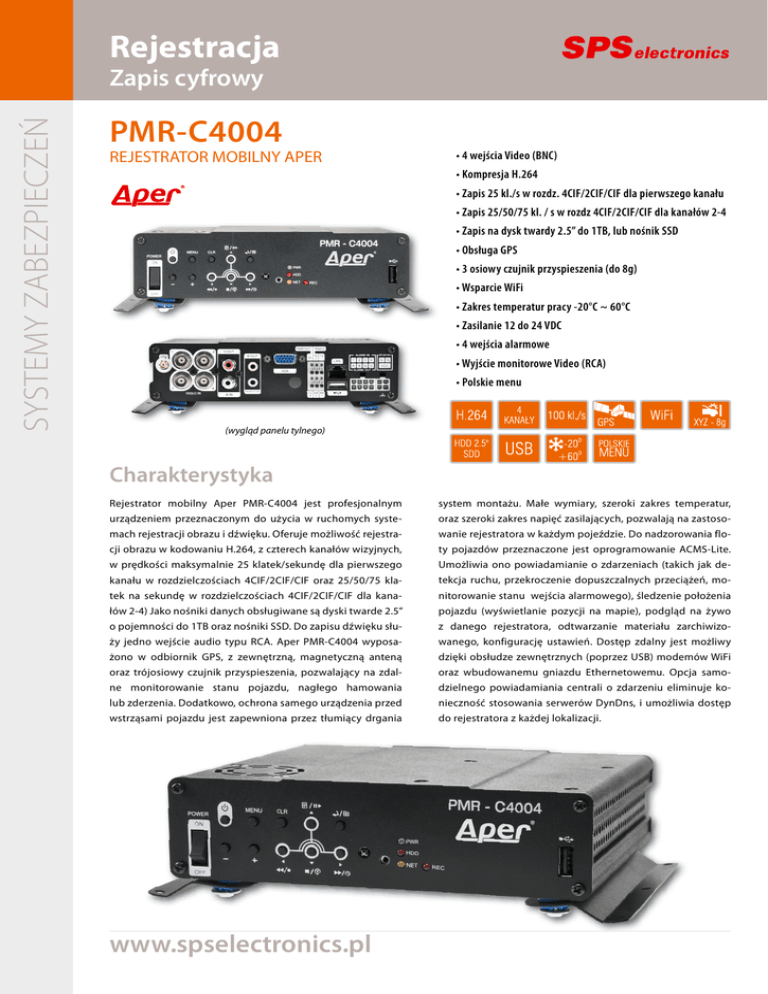 Rejestracja SYSTEMY ZABEZPIECZEŃ Zapis cyfrowy PMR-C4004 REJESTRATOR MOBILNY APER • 4 wejścia Video (BNC) • Kompresja H.264 • Zapis 25 kl./s w rozdz. 4CIF/2CIF/CIF dla pierwszego kanału • Zapis 25/50/75 kl. / s w rozdz 4CIF/2CIF/CIF dla kanałów 2-4 • Zapis na dysk twardy 2.5” do 1TB, lub nośnik SSD • Obsługa GPS • 3 osiowy czujnik przyspieszenia (do 8g) • Wsparcie WiFi • Zakres temperatur pracy -20°C ~ 60°C • Zasilanie 12 do 24 VDC • 4 wejścia alarmowe • Wyjście monitorowe Video (RCA) • Polskie menu (wygląd panelu tylnego) Charakterystyka Rejestrator mobilny Aper PMR-C4004 jest profesjonalnym system montażu. Małe wymiary, szeroki zakres temperatur, urządzeniem przeznaczonym do użycia w ruchomych syste- oraz szeroki zakres napięć zasilających, pozwalają na zastoso- mach rejestracji obrazu i dźwięku. Oferuje możliwość rejestra- wanie rejestratora w każdym pojeździe. Do nadzorowania flo- cji obrazu w kodowaniu H.264, z czterech kanałów wizyjnych, ty pojazdów przeznaczone jest oprogramowanie ACMS-Lite. w prędkości maksymalnie 25 klatek/sekundę dla pierwszego Umożliwia ono powiadamianie o zdarzeniach (takich jak de- kanału w rozdzielczościach 4CIF/2CIF/CIF oraz 25/50/75 kla- tekcja ruchu, przekroczenie dopuszczalnych przeciążeń, mo- tek na sekundę w rozdzielczościach 4CIF/2CIF/CIF dla kana- nitorowanie stanu wejścia alarmowego), śledzenie położenia łów 2-4) Jako nośniki danych obsługiwane są dyski twarde 2.5” pojazdu (wyświetlanie pozycji na mapie), podgląd na żywo o pojemności do 1TB oraz nośniki SSD. Do zapisu dźwięku słu- z danego rejestratora, odtwarzanie materiału zarchiwizo- ży jedno wejście audio typu RCA. Aper PMR-C4004 wyposa- wanego, konfigurację ustawień. Dostęp zdalny jest możliwy żono w odbiornik GPS, z zewnętrzną, magnetyczną anteną dzięki obsłudze zewnętrznych (poprzez USB) modemów WiFi oraz trójosiowy czujnik przyspieszenia, pozwalający na zdal- oraz wbudowanemu gniazdu Ethernetowemu. Opcja samo- ne monitorowanie stanu pojazdu, nagłego hamowania dzielnego powiadamiania centrali o zdarzeniu eliminuje ko- lub zderzenia. Dodatkowo, ochrona samego urządzenia przed nieczność stosowania serwerów DynDns, i umożliwia dostęp wstrząsami pojazdu jest zapewniona przez tłumiący drgania do rejestratora z każdej lokalizacji. www.spselectronics.pl Dane techniczne MODEL PMR-C4004 Wejścia wizyjne Maksymalne prędkości rejestracji i rozdzielczości obrazu zapisywanego / odtwarzanego 4 x Video (BNC) Pierwszy kanał: 25 kl./s, 4CIF/2CIF/CIF Kanały 2 - 4: 25/50/75 kl./s, 4CIF/2CIF/CIF Metoda kompresji H.264 Wyjścia wizyjne główne Video (RCA)/VGA (D-SUB) Rozdzielczość obrazu wyśw. poj. w czasie rzeczyw. 720 x 576 px Wejścia foniczne 1 x audio (RCA) Wyjścia alarmowe 1 x zaciskowe Wejścia alarmowe 4 x wejście beznapięciowe, NC/NO (zaciskowe) System operacyjny Embedded Linux Sterowanie Panel przedni, pilot IR, mysz, oprogramowanie sieciowe Obsługa poprzez sieć IP Interfejsy ACMS-Lite 2 x USB 2.0 (wsparcie WiFi), Ethernet, GPS (antena) Obsługiwane sieci LAN/WAN/Internet/WiFi Protokoły sieciowe TCP/IP, DHCP, DDNS, SMTP Rejestracja Tryby rejestracji Dyski twarde 2.5” do 1TB, dyski SSD Ciągły z detekcją ruchu (z zapisem przed i po detekcji), alarmowy (z zapisem przed- i poalarmowym). Wyszukiwanie nagrań Kalendarz, zdarzenia Archiwizacja Inne USB Wbudowany GPS, antena GPS przedłużona kablem o długości 3 m. Trójosiowy czujnik przyspieszeń, maksymalne przyspieszenie 8g. Sygnalizacja alarmu, powiadamianie centrali pojazdów o zdarzeniu, prędkości i kierunku. Wyjście RS-422(PTZ). Wyjście alarmowe, wyjście zasilające Zasilanie 12 - 24 VDC Pobór mocy Do 20 W Zakres temperatury -20°C - +60°C Wymiary (szer. x wys. x gł.) Montaż 177 x 146 x 46 mm Metalowy uchwyt przeciwstrząsowy Waga 1 kg (z dyskiem 2.5”) Centrala - ul. Wał Miedzeszyński 630, 03-994 Warszawa; tel. 022 518 31 50, fax 022 518 31 70, e-mail: [email protected] BH Gdańsk - ul. Drożyny 6, 80-302 Gdańsk; tel. 058 624 83 04, fax 058 668 59 20, e-mail: [email protected] BH Katowice - ul. Kościuszki 227, 40-600 Katowice; tel. 032 255 64 27, fax 032 255 64 52, e-mail: [email protected] BH Poznań - ul. Polska 60, 60-595 Poznań; tel. 061 852 19 02, fax 061 825 09 03, e-mail: [email protected] BH Toruń - ul. Grudziądzka 176, 87-100 Toruń; tel. 056 653 99 43, fax 056 653 90 81, e-mail: [email protected] BH Wrocław - pl. Gen. Wróblewskiego 3a, 50-413 Wrocław; tel. 071 348 44 64, fax 071 348 36 35, e-mail: [email protected] Dystrybutor (oprogramowanie ACMS-Lite)