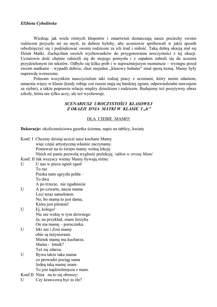Elżbieta Cybulińska Wiedząc jak wiele różnych kłopotów i zmartwień dostarczają nasze pociechy swoim rodzicom przyszło mi na myśl, że dobrze byłoby, aby uczniowie spróbowali w jakiś sposób odwdzięczyć się i podziękować swoim rodzicom za ich trud i miłość. Taką dobrą okazją stał się Dzień Matki. Zachęciłam swoich wychowanków do przygotowania uroczystości z tej okazji. Uczniowie dość chętnie odnieśli się do mojego pomysłu i z zapałem zabrali się do uczenia przydzielonym im tekstów. Odbyło się kilka prób i w najważniejszym momencie – występu przed swoim matkami – wypadli dobrze, choć niejeden ,,klasowy bohater” miał sporą tremę. Mamy były naprawdę wzruszone. Polecam wszystkim nauczycielom taki rodzaj pracy z uczniami, który moim zdaniem, umacnia więzy w klasie (kiedy robiąc coś razem stają się bardziej zgrani, odpowiedzialni nawzajem za siebie), a także poprawia relacje między dzieckiem i rodzicem. Budujemy też pozytywny obraz szkoły, która nie tylko uczy, ale też wychowuje. SCENARIUSZ UROCZYSTOŚCI KLASOWEJ Z OKAZJI DNIA MATKI W KLASIE I ,,h’’ DLA CIEBIE MAMO! Dekoracje: okolicznościowa gazetka ścienna, napis na tablicy, kwiaty Konf. I Chcemy dzisiaj uczcić nasz kochane Mamy więc część artystyczną właśnie zaczynamy. Ponieważ na to święto mamy wolną lekcję Niech mi panie pozwolą wygłosić prelekcję. /ukłon w stronę Mam/ Konf. II Jak wszyscy wiemy Mamy bywają różne: U U nas w piecu ogień zgasł To raz Pieska nam ugryzła pchła – To dwa A po trzecie, nie zgadniecie U A po czwarte, nasza mama Leci teraz samolotem No, bo mama to jest dama, Która jest pilotem! U Ej, kolego! Nic nie widzę w tym dziwnego Ja, na przykład, znam Jerzyka On ma mamę – porucznika. U Irki zaś i Zosi mamy obie są inżynierami. Mietek mamę ma kucharza. Mama - lotnik? Też się zdarza. U Bywa także taka mama co prowadzi pociąg sama Jedną taką mamę znam To jest najdzielniejsza z mam. Konf.II Nina na to się obruszy: U Czy krawcową być to źle? Kto by spodnie dzieciom uszył? Mama – pilot? - chyba nie! Konf.II Pilot lata samolotem, kucharz darzy nas kompotem, nauczyciel uczy w szkole, aktor gra w teatrze role, murarz domy nam buduje. Każdy pilnie się zajmuje własną pracą , a nie inną – I tak właśnie być powinno. Razem Wiele różnych mamy mam, Wszystkie są potrzebne nam. Konf.I A kogóż my tu mamy... U W różnych krajach żyjemy na świecie wiele lądów nas dzieli, mórz wiele gór fiolety i dolin zieleń. I choć każdy mówi swą mową, ale przecież jest jedno słowo, które wszystkie połączy dzieci. U Każdy pojmie to słowo sam I domyśli się, co ono znaczy, choć w każdym kraju zabrzmi inaczej. U Gdy ktoś powie w Warszawie: mama w Moskwie mu odpowiedzą: mamasza a w Paryżu szepną: maman. U I czy madre Włoch mały powie czy też Niemiec odezwie się Mutti zabrzmią słowa jak bliskie nuty. U W Afryce, Azji, Europie każda dziewczyna i chłopiec swoją mamę ujrzy w tym słowie. U W różnych krajach żyjemy na świecie ale tak jak to słowo znajome, nasza przyjaźń połączy nam dłonie. Każdy mówi swą własną mową, ale każdy rozumie to słowo – pierwsze słowo u wszystkich dzieci. /Wszyscy powiewają chorągiewkami z napisem mama w różnych językach/ Piosenka M.Jeżowskiej pt. „Gdyby moja mama pochodziła z wysp Bahama”. Konf.I Za co kocham swoją mamę? U Kto to jest? Od rana do późnej nocy o nas się kłopocze. Dba o ciepło, w ogień dmucha, czapki szyje nam z kożucha. Ciepły kołnierz, ciepły szalik, byśmy zimna nie zaznali. Z nami troski wszystkie dzieli, pragnie, byśmy byli weseli. Konf.I Chyba wszyscy się zgadzamy, że to nasze ... Razem Mamy U Chciałbym w tym dniu powiedzieć jakieś ciepłe słowo Jakąś wyrazić myśl wspaniałą Ale pragnienie owo, tak jakoś trudno ubrać w odpowiednie słowo, Więc powiem prosto i szczerze: Kocham Cię, Mamo! Konf.I A teraz naradę otwieramy, za co kochamy nasze mamy! U Moja pachnie bajkami, Zawsze gdy deszcz pada, Siedzimy sobie razem, ona opowiada... U Moja ciężko pracuje, gotuje i sprząta. Pierwsza wstaje raniutko, cały dzień się krząta. U Moja pokrzyczy czasem, przyznaję, niestety, ale wprost fenomenalnie robi mi omlety. U A moja kochana mama jest ciągle taka młoda. Chodzimy na wycieczki czy deszcz czy pogoda. U Moja mama, w mroźne dni zimowe Wiąże mi ciepły szalik i czapkę wkłada na głowę. KonfII A jaka jest twoja mama? U Moja mama jest jak złote słońce i jak rosa srebrzysta na łące. Choć potrafi też jak groźna burza krzyknąć, gdy coś ją oburza. KonfII A twoja? U Moja mama jest jak piękny kwiat i tak cicha, delikatna jak stokrotka. Czuła, dobra jak polna tymotka i dlatego ją kocham tak. Konf.I Najbardziej kocham moją mamę za to, że jest pracowita i dba o mnie. I że jest ładna i elegancka, ma ładne oczy i włosy, jest wesoła i często się śmieje. Cieszę się też, że kupuje mi ładne ubrania i zawsze znajdzie grosik na gumę czy czekoladę, nawet kiedy ma mało pieniędzy. Ale najbardziej kocham moją mamę za to, że mnie rozumie, że jest sprawiedliwa. Nigdy nie gniewa się o takie rzeczy, które zdarzają się przypadkiem, kiedy niechcący coś stłukę czy zniszczę... Raz nawet zgubiłem sporo pieniędzy i wróciłem z płaczem, powiedziała: „Trudno synku, nie płacz już. Na drugi raz staraj się bardziej uważać.” Lubię ja też za to, że nie kłóci się z tatą. KonfII Mamy są rozmaite, jak tu powiedziano Lecz właściwie czują zupełnie tak samo To samo je cieszy, to samo raduje np. pocałunek, uśmiech i słówko dziękuję. Konf I Jeśli nasze mamy tak bardzo kochamy, to co im dzisiaj w darze damy? Konf II Myślę, że słowo kocham! U Ile ryb żyje w morzu, ile ptaków jest w przestworzu U Ile gwiazd na niebie lśni, tyle, Mamo, tu na świecie Dni radosnych - twoje dziecię, dzisiaj z serca życzy Ci. /rozwija laurkę/ Droga Mamo, niech pog