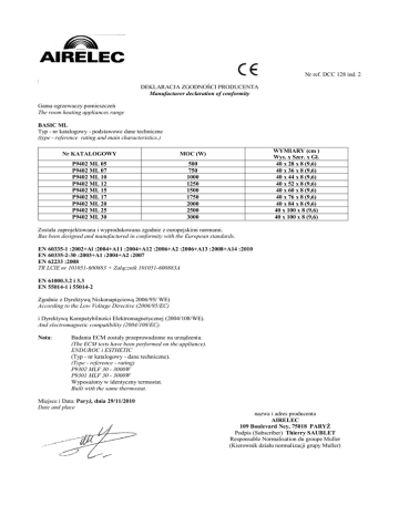Nr ref. DCC 128 ind. 2 : DEKLARACJA ZGODNOŚCI PRODUCENTA Manufacturer declaration of conformity Gama ogrzewaczy pomieszczeń The room heating appliances range BASIC ML Typ - nr katalogowy - podstawowe dane techniczne (type - reference rating and main characteristics.) Nr KATALOGOWY MOC (W) P9402 ML 05 P9402 ML 07 P9402 ML 10 P9402 ML 12 P9402 ML 15 P9402 ML 17 P9402 ML 20 P9402 ML 25 P9402 ML 30 500 750 1000 1250 1500 1750 2000 2500 3000 WYMIARY (cm ) Wys. x Szer. x Gł. 40 x 28 x 8 (9,6) 40 x 36 x 8 (9,6) 40 x 44 x 8 (9,6) 40 x 52 x 8 (9,6) 40 x 60 x 8 (9,6) 40 x 76 x 8 (9,6) 40 x 84 x 8 (9,6) 40 x 100 x 8 (9,6) 40 x 100 x 8 (9,6) Została zaprojektowana i wyprodukowana zgodnie z europejskimi normami. Bas been designed and manufactured in conformity with the European standards. EN 60335-1 :2002+Al :2004+A11 :2004+A12 :2006+A2 :2006+A13 :2008+A14 :2010 EN 60335-2-30 :2003+A1 :2004+A2 :2007 EN 62233 :2008 TR LCIE nr 101051-600883 + Załącznik 101051-600883A EN 61000.3.2 i 3.3 EN 55014-1 i 55014-2 Zgodnie z Dyrektywą Niskonapięciową 2006/95/ WE) According to the Low Voltage Directive (2006/95/EC) i Dyrektywą Kompatybilności Elektromagnetycznej (2004/108/WE). And electromagnetic compatibility (2004/108/EC). Nota: Badania ECM zostały przeprowadzone na urządzeniu. (The ECM tests have been performed on the appliance). ENDUROC i ESTHETIC (Typ - nr katalogowy - dane techniczne). (Type - reference - rating) P9302 MLF 30 - 3000W P9301 MLF 30 - 3000W Wyposażony w identyczny termostat. Built with the same thermostat. Miejsce i Data: Paryż, dnia 29/11/2010 Date and place nazwa i adres producenta AIRELEC 109 Boulevard Ney, 75018 PARYŻ Podpis (Subscriber) Thierry SAUBLET Responsable Normalisation du groupe Muller (Kierownik działu normalizacji grupy Muller)