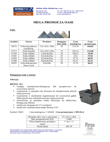 ASTRAL POOL POLSKA Sp. z o.o. Borowska 264 50-558 Wrocław NIP 899-24-66-785 tel. 071 360 49 30, fax. 360 49 40 e-mail: [email protected] www.astralpool.pl MEGA PROMOCJA OASE Folie: Symbol Nazwa Wymiary 36272 Folia kauczukowa OASEFOL Folia Eurofol Folia Alfalol Folia Alfalol Folia Alfalol Folia Alfalol Folia dekoracyjna Stone Liner 37171 37169 51281 51282 51286 36291 1,0 x 8,0 x 20m Dostępna ilość [mb] 20 Cena katalogowa 212,18 Cena promocyjna 166,02 1,0 x 6,0 x 25m 1,0x6,0x25m 0,5x4,0x25m 0,5x6,0x25m 0,8x6,0x25m 0,6x20m 15 16 25 25 25 20 223,14 100,21 34,5 51,75 83,37 51,78 174,58 78,40 27,04 40,55 65,22 40,52 Pielęgnacja wody w stawie: Filtracja: BIOTEC 10.1 wydajny mechaniczno-biologiczny filtr przepływowy do czyszczenia stawów wyposażony w specjalne sito Screenex do odseparowania dużych zanieczyszczeń wyposażony w mechanizm regeneracyjny do czyszczenia gąbek filtracyjnych oraz wskaźnik poziomu zanieczyszczeń zastosowane są specjalne media filtracyjne do efektywnej, biologicznej filtracji możliwość wkopania do 2/3 wysokości możliwość zainstalowania lampy Biotron UVC Symbol: 56641 Cena katalogowa: 1 649,00 Cena promocyjna: 1 055,36 zł Wymiary (dł x wys x szer) [cm] Max przepustowość [l/h] Wlot (stopniowane przyłącze węża) Wylot [mm] 77 x 55,5 x 40,5 8 000 1” do 1 ½” SĄD REJONOWY DLA WROCŁAWIA-FABRYCZNEJ WE WROCŁAWIU, VI WYDZIAŁ GOSPODARCZY KRAJOWEGO REJESTRU SĄDOWEGO KRS nr 0000158890 Wysokość kapitału zakładowego: 400 000 PLN DN 70 ASTRAL POOL POLSKA Sp. z o.o. Borowska 264 50-558 Wrocław NIP 899-24-66-785 tel. 071 360 49 30, fax. 360 49 40 e-mail: [email protected] www.astralpool.pl Ilość niebieskich gąbek filtracyjnych Ilość czerwonych gąbek filtracyjnych Ilość zielonych gąbek filtracyjnych Max objętość stawu bez zarybienia [m3] Max objętość stawu z zarybieniem [m3] 4 4 1 20 45 BIOTEC SCREENMATIC 36 automatyczne oczyszczanie łatwiejsze i efektywniejsze usuwanie zanieczyszczeń ze stawu gromadzenie zanieczyszczeń, dzięki przegrodzie taśmowej, w zbiorniku wychwytującym – łatwym do wyciągnięcia i oczyszczenia gwarancja ciągłego oczyszczania sita i stałego przepływu Symbol: 57129 Cena katalogowa: 6 499,00 Wymiary (dł x wys x szer) [mm] Max przepustowość [l/h] Wlot (stopniowane przyłącze węża) Wylot [mm] Ilość niebieskich gąbek filtracyjnych Ilość czerwonych gąbek filtracyjnych Granulat filtracyjny [kg] Separator zanieczyszczeń [μm] Max objętość stawu bez zarybienia [m3] Max objętość stawu z zarybieniem [m3] Cena promocyjna: 4 159,36 zł 1200 x 800 x 760 23 000 2 x 1” do 1 ½” SĄD REJONOWY DLA WROCŁAWIA-FABRYCZNEJ WE WROCŁAWIU, VI WYDZIAŁ GOSPODARCZY KRAJOWEGO REJESTRU SĄDOWEGO KRS nr 0000158890 Wysokość kapitału zakładowego: 400 000 PLN 100 18 18 18 300 70 140 ASTRAL POOL POLSKA Sp. z o.o. Borowska 264 50-558 Wrocław NIP 899-24-66-785 tel. 071 360 49 30, fax. 360 49 40 e-mail: [email protected] www.astralpool.pl BIOsys skimmer z filtrem innowacyjny filtr do czyszczenia powierzchni stawu do umiejscowienia pod powierzchnią ziemi dzięki osłonie w kolorze skały wtapia się w otoczenie stawu służy do odsysania liści, igliwia, kurzu oraz innych zanieczyszczeń z powierzchni stawu pojemność zbiornika 15l sugerowana wydajność pompy: do 250 l/min Symbol: 57137 Cena katalogowa: 649,00 Cena promocyjna: 415,36 zł Wymiary (dł x wys x szer) [mm] Max różnica poziomu lustra wody [mm] Szerokość wlotu skimmera [mm] Wielkość kosza na zanieczyszczenia (dł x wys x szer) [mm] Objętość kosza na zanieczyszczenia [l] Powierzchnia filtracyjna [cm2] Stopniowane przyłącze węża 580 x 400 x 450 100 220 410 x 285 x 175 15 2 930 ¾” do 1 ½ ” FILTROSKIM – skimmer filtracyjny woda zasysana do jednostki filtracyjnej przez klapę wlotową mechaniczne i biologiczne oczyszczanie wody dzięki zróżnicowanym mediom filtracyjnym woda tłoczona jest spowrotem do stawu pod powierzchnią lustra wody przez zintegrowaną pompę Symbol: 57135 Cena katalogowa: 2 599,00 Cena promocyjna: 1 663,36 zł Wymiary (dł x wys x szer) [mm] Skimmer: szerokość wlotu [mm] Pojemność kosza [l] Wejście Max wydajność [l/h] Moc UVC [W] Wydajność pompy [l/h] Pobór mocy pompy [W] Pojemność gąbek filtracyjnych [l] Różnica w poziomie wody [cm] 585 x 385 x 580 220 5 Klapa wlotowa 4 000 11 4 000 35 30 SĄD REJONOWY DLA WROCŁAWIA-FABRYCZNEJ WE WROCŁAWIU, VI WYDZIAŁ GOSPODARCZY KRAJOWEGO REJESTRU SĄDOWEGO KRS nr 0000158890 Wysokość kapitału zakładowego: 400 000 PLN 10 ASTRAL POOL POLSKA Sp. z o.o. Borowska 264 50-558 Wrocław NIP 899-24-66-785 tel. 071 360 49 30, fax. 360 49 40 e-mail: [email protected] www.astralpool.pl BIOKICK 1 Biologiczny starter filtracyjny do systemów filtracyjnych Dane/ Symbol Pojemność opakowania [ml] Pojemność stawu [l] Symbol: 54279 Symbol: 53997 54279 500 25 000 Cena katalogowa: 179,00 Cena katalogowa: 49,90 53997 500 5 000 Cena promocyjna: 114,56 zł Cena promocyjna: 31,94 zł Chemia: Reduktor glonów nitkowatych Redukuje glony nitkowate, które po obumarciu ulegają rozkładowi biologicznemu – środek służy do utrzymania właściwej równowagi biologicznej. (Uwaga: Należy zadbać o odpowiednią ilość tlenu). Dozowanie: 500 ml na 10 000 l Symbol: 36815 Cena katalogowa: 99,00 Cena promocyjna: 63,37 zł Starter Bakterien Środek wspierający proces biologicznego samooczyszczenia oraz wzbogacania wody w niezbędne do życia w stawie mikroorganizmy. Nieszkodliwy dla organizmów żywych. Bakterie występujące w naturze neutralizują niebezpieczne gazy gnilne powstające w procesie rozkładu. (Uwaga: Należy zapewnić odpowiednią cyrkulację wody. Optymalne uzupełnienie – stabilizator tlenu). Dozowanie: 500 ml na 10 000 l Symbol: 36816 Cena katalogowa: 74,90 Cena promocyjna: 47,93 zł Schlamm Minus Zapobiega mętnieniu wody i osadzaniu się szlamu i glonów na dnie. Wyselekcjowane, aktywne bakterie redukują cząstki organiczne powodujące mętnienie wody. 