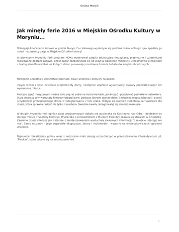 Gmina Moryń Jak minęły ferie 2016 w Miejskim Ośrodku Kultury w Moryniu... Dobiegają końca ferie zimowe w gminie Moryń. Co ciekawego wydarzyło się podczas czasu wolnego i jak spędziły go dzieci - uczestnicy zajęć w Miejskim Ośrodku Kultury? W pierwszym tygodniu ferii program MOKu obejmował zajęcia edukacyjne (muzyczne, plastyczne i czytelnicze) realizowane poprzez zabawę. Część zadań rozpoczynała się od wizyt w bibliotece miejskiej i uczestnictwa w zajęciach z teatrzykiem Kamishibai, na których dzieci poznawały przedziwne historie bohaterów książek obrazkowych. Następnie uczestnicy warsztatów przenosili swoje wrażenia i pomysły na papier. Innym razem z kolei dzieciaki projektowały domy, następnie wspólnie wykonywały plakaty przedstawiające ich wymarzone miasta. Podczas zajęć muzycznych można było pograć sobie na instrumentach, potańczyć i pośpiewać pod okiem instruktora. Dużą atrakcją były warsztaty filmowo-fotograficzne, podczas których starsze dzieci i młodzież mogła zobaczyć i ocenić przydatność profesjonalnego drona w fotografowaniu z lotu ptaka. Odbyła się również dyskoteka karnawałowa dla dzieci, która sprawiła radość nie tylko maluchom. Świetnie bawiły (integrowały) się również mamusie. W drugim tygodniu ferii oprócz zajęć programowych odbyła się wycieczka do Kostrzyna nad Odrą - dokładnie do starego miasta i Twierdzy Kostrzyn. Wycieczka z przewodnikiem z Muzeum Twierdzy okazała się strzałem w dziesiątkę. Zarówno dzieci młodsze jak i starsze z zainteresowaniem wysłuchały ciekawych informacji "o mieście, którego nie ma". Samo muzeum - jego wspaniałe ekspozycje, zbiory i multimedia - wywarło na wycieczkowiczach ogromne wrażenie. Najmłodsi mieszkańcy gminy wraz z rodzicami mieli okazję uczestniczyć w przedstawianiu interaktywnym pt. "Pinokio", które odbyło się na zakończenie ferii. 1
