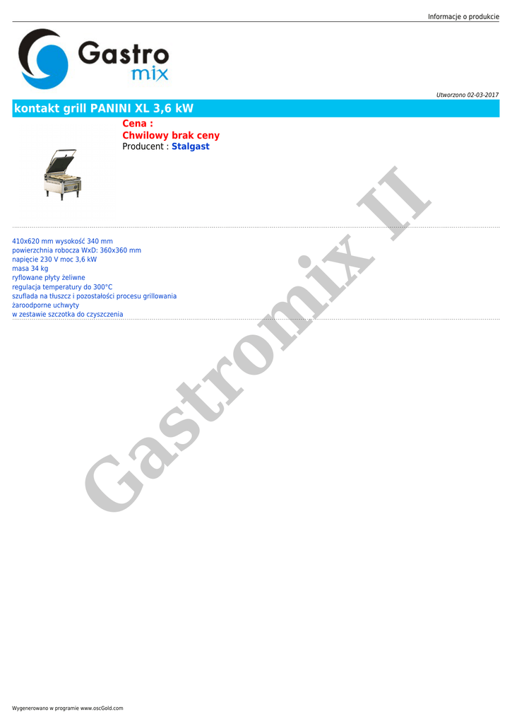 Informacje o produkcie Utworzono 02-03-2017 kontakt grill PANINI XL 3,6 kW Cena : Chwilowy brak ceny G as ix m tr o 410x620 mm wysokość 340 mm powierzchnia robocza WxD: 360x360 mm napięcie 230 V moc 3,6 kW masa 34 kg ryflowane płyty żeliwne regulacja temperatury do 300°C szuflada na tłuszcz i pozostałości procesu grillowania żaroodporne uchwyty w zestawie szczotka do czyszczenia II Producent : Stalgast Wygenerowano w programie www.oscGold.com