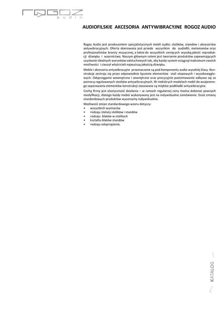 AUDIOFILSKIE AKCESORIA ANTYWIBRACYJNE ROGOZ AUDIO Rogoz Audio jest producentem specjalistycznych mebli audio: stolików, standów i akcesoriów antywibracyjnych. Oferta skierowana jest przede wszystkim do audiofili, melomanów oraz profesjonalistów branży muzycznej, a także do wszystkich ceniących wysoką jakość reprodukcji dźwięku i wzornictwo. Naszym głównym celem jest tworzenie produktów zapewniających uzyskanie idealnych warunków odsłuchowych tak, aby każdy system osiągnął maksimum swoich możliwości i cieszył właścicieli najwyższą jakością dźwięku. Meble i akcesoria antywibracyjne przeznaczone są pod komponenty audio wysokiej klasy. Konstrukcje zestraja się przez odpowiednie łączenie elementów stali stopowych i wysokowęglowych. Odsprzęganie wewnętrzne i zewnętrzne oraz precyzyjnie poziomowanie odbywa się za pomocą regulowanych stożków antywibracyjnych. W niektórych modelach mebli do wzajemnego separowania elementów konstrukcji stosowane są miękkie podkładki antywibracyjne. Cechą firmy jest elastyczność działania – w ramach regularnej ceny można dokonać pewnych modyfikacji, dlatego każdy mebel wykonywany jest na indywidualne zamówienie. Duże zmiany standardowych produktów wyceniamy indywidualnie. KATALOG Możliwość zmian standardowego wzoru dotyczy: • wszystkich wymiarów • rodzaju stelaży stolików i standów • rodzaju blatów w stolikach • kształtu blatów standów • rodzaju odsprzężenia. CPPB16 STOLIK ROGOZ-AUDIO 4SB4 PLATFORMA ANTYWIBRACYJNA ROGOZ AUDIO OPIS TECHNICZNY Stalowy stelaż trójpoziomowy z blatami • waga: 22 kg; • wysokość całkowita - 43 mm; • grubość blatu – 16 mm; INSTRUKCJA RZUT Z GÓRY • szerokość całkowita - 550 mm (użytkowa 450); blat wierzchni • głębokość całkowita - 450 mm (użytkowa 350); • obciążenie platformy - do 150 kg W ZESTAWIE: • • • • • BLAT Stalowa platforma antywibracyjna i ekranująca z podłączeniem do uziemienia. Kolor - czarny (wysoki poysk). 1 blat (stal stopowa); 4 stożki do regulowania poziomu; 4 talerzyki separujące; 1 przewód uziemiający z konektorami; 1 śruba dociskająca przewód uziemienia KL EJ RZUT Z GÓRY blat wewnętrzny ZASTOSOWANIE • • • • • • wzmacniacze mocy; wzmacniacze zintegrowane; przedwzmacniacze; odtwarzacze CD; gramofony analogowe; PODKŁADKI kolumny głośnikowe ANTYWIBRACYJNE FRONT WYKOŃCZENIE LAKIERNICZE STELAŻU: technologia: lakierowanie proszkowe kolor standardowy: czrny matt inne kolory i struktury na indywidualne zamówienie W ZESTAWIE: 1 stelaż stalowy 4 blaty 16 podkładek absorbujących wibracje 4 kwadratowe podkładki separujące i chroniące podłogę Tel.: (0048) 504 080 690, Fax: (032) 205 34 12 pn-pt. w godz.: 10.00 - 17.00, sob. w godz.: 10.00 - 15.00 E-mail: [email protected] www.rogoz-audio.com Sklep: sprzedaż internetowa Rogoz Audio 3SG40 STOLIK ROGOZ-AUDIO 4SB4 PLATFORMA ANTYWIBRACYJNA ROGOZ AUDIO OPIS TECHNICZNY Stalowy stelaż trójpoziomowy z blatami • wysokość całkowita - 170 mm; • szerokość całkowita - 550 mm; • głębokość całkowita - 450 mm; INSTRUKCJA • profile nóg - rury stalowe Ø 80 mm; • blat wierzchni - 550 x 450 x 40; • obciążenie - do 150 kg; • balast- piasek kwarcowy RZUT Z GÓRY blat wierzchni W ZESTAWIE: • • • • • BLAT Platforma trójnożna. Blat oparty na regulowanych stożkach antywibracyjnych redukujących przenoszenie drgań pomiędzy półką a stalową ramą konstrukcyjną. Nogi stelaża balastowane piaskiem kwarcowym (zakręcane otwory umożliwiają zmianę ilości oraz rodzaju balastu). Kolor stelaża - czarny (mat,drobna struktura). Blat wykonany z drewna (MDF) o grubości 40 mm. Okleina – fornir naturalny (orzech amerykański). Platforma wykonywana jest na zamówienie. RZUT Z GÓRY 1 stelaż stalowy; 1 blat (MDF/fornir); 6 stożków do regulowania poziomu; 3 talerzyki separujące; 3 masywne podkładki chroniące podłogę KL EJ blat wewnętrzny Platformy antywibracyjne przeznaczone są pod komponenty audio wysokiej klasy. Konstrukcje zostały zestrojone przez odpowiednie połączenie stali stopowych i wysokowęglowych. Rama składa się z grubościennych nóg wykonanych ze stali węglowej S235JR (stosowanej do konstrukcji nośnych poddawanych dużym obciążeniom dynamicznym - np. w dźwigach) oraz łączących je poprzeczek ze stali stopowej o podwyższonej wytrzymałości S355. Precyzyjnie poziomowane odbywa się za pomocą regulowanych stożków antywibracyjnych. ZASTOSOWANIE • • • • • • odtwarzacze CD; gramofony analogowe; STOLIKmocy; końcówki ROGOZ-AUDIO 4SB4 wzmacniacze zintegrowane; Stalowy stelaż trójpoziomowy z blatami przedwzmacniacze; PODKŁADKI ANTYWIBRACYJNE kolumny głośnikowe INSTRUKCJA RZUT Z GÓRY blat wierzchni 80 450 mm FRONT BLAT KL EJ RZUT Z GÓRY blat wewnętrzny 550 mm 20 40 550 mm PODKŁADKI ANTYWIBRACYJNE 40 65 40 WYKOŃCZENIE LAKIERNICZE STELAŻU: technologia: lakierowanie proszkowe kolor standardowy: czrny matt inne kolory i struktury na indywidualne zamówienie 170 mm FRONT W ZESTAWIE: 1 stelaż stalowy regulowane stożki 4 blaty 16 podkładek absorbujących wibracje antywibracyjne balast- piasek kwarcowy 4 kwadratowe podkładki separujące i chroniące podłogę Tel.: (0048) 504 080 690, Fax: (032) 205 34 12 pn-pt. w godz.: 10.00 - 17.00, sob. w godz.: 10.00 - 15.00 E-mail: [email protected] www.rogoz-audio.com Sklep: sprzedaż internetowa 105 Rogoz Audio SMO40 STOLIK ROGOZ-AUDIO 4SB4 PLATFORMA ANTYWIBRACYJNA ROGOZ AUDIO OPIS TECHNICZNY Stalowy stelaż trójpoziomowy z blatami • waga: 5,8 kg; • wysokość całkowita - 60 mm; • grubość blatu – 40 mm; INSTRUKCJA • szerokość całkowita - 492 mm; • głębokość całkowita - 420 mm; • obciążenie platformy - do 100 kg RZUT Z GÓRY blat wierzchni W ZESTAWIE: • • • BLAT Platforma antywibracyjna. Konstrukcja typu sandwicz - sklejka, MDF, fornir naturalny (mahoń sapeli). 1 blat ( sklejka/MDF/