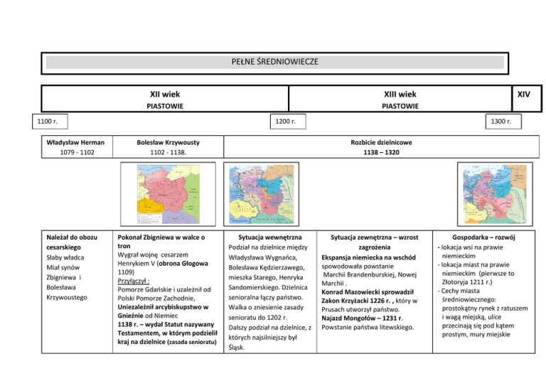 PEŁNE ŚREDNIOWIECZE XII wiek XIII wiek PIASTOWIE PIASTOWIE 1100 r. Władysław Herman 1079 - 1102 Należał do obozu cesarskiego Słaby władca Miał synów Zbigniewa i Bolesława Krzywoustego 1200 r. Bolesław Krzywousty 1102 - 1138. Pokonał Zbigniewa w walce o tron Wygrał wojnę cesarzem Henrykiem V (obrona Głogowa 1109) Przyłączył : Pomorze Gdaoskie i uzależnił od Polski Pomorze Zachodnie, Uniezależnił arcybiskupstwo w Gnieźnie od Niemiec 1138 r. – wydał Statut nazywany Testamentem, w którym podzielił kraj na dzielnice (zasada senioratu) XIV 1300 r. Rozbicie dzielnicowe 1138 – 1320 Sytuacja wewnętrzna Podział na dzielnice między Władysława Wygnaoca, Bolesława Kędzierzawego, mieszka Starego, Henryka Sandomierskiego. Dzielnica senioralna łączy paostwo. Walka o zniesienie zasady senioratu do 1202 r. Dalszy podział na dzielnice, z których najsilniejszy był Śląsk. Sytuacja zewnętrzna – wzrost zagrożenia Ekspansja niemiecka na wschód spowodowała powstanie Marchii Brandenburskiej, Nowej Marchii . Konrad Mazowiecki sprowadził Zakon Krzyżacki 1226 r. , który w Prusach utworzył paostwo. Najazd Mongołów – 1231 r. Powstanie paostwa litewskiego. Gospodarka – rozwój - lokacja wsi na prawie niemieckim - lokacja miast na prawie niemieckim (pierwsze to Złotoryja 1211 r.) - Cechy miasta średniowiecznego: prostokątny rynek z ratuszem i wagą miejską, ulice przecinają się pod kątem prostym, mury miejskie