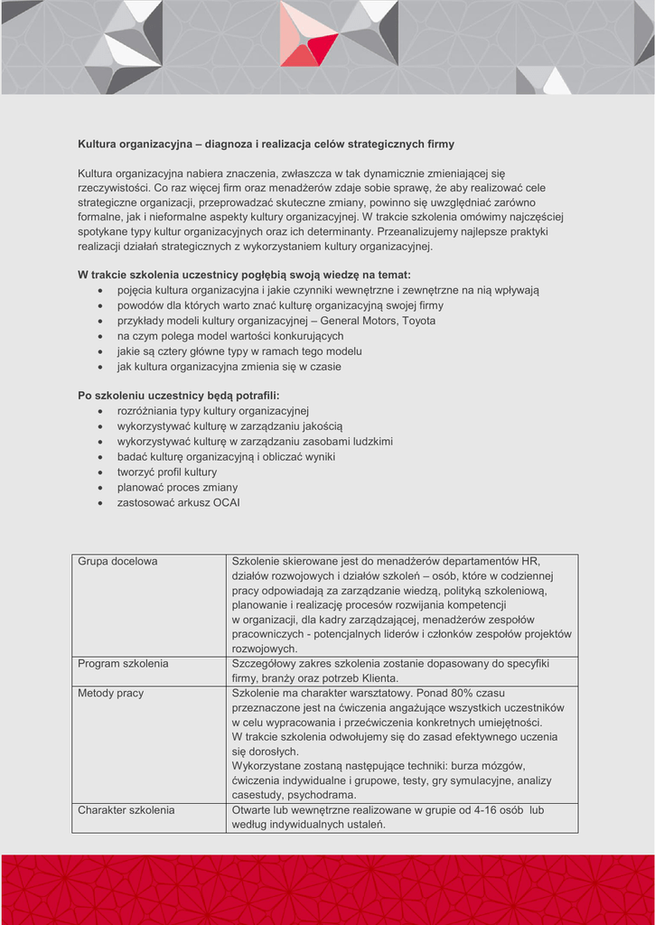 Kultura organizacyjna – diagnoza i realizacja celów strategicznych firmy Kultura organizacyjna nabiera znaczenia, zwłaszcza w tak dynamicznie zmieniającej się rzeczywistości. Co raz więcej firm oraz menadżerów zdaje sobie sprawę, że aby realizować cele strategiczne organizacji, przeprowadzać skuteczne zmiany, powinno się uwzględniać zarówno formalne, jak i nieformalne aspekty kultury organizacyjnej. W trakcie szkolenia omówimy najczęściej spotykane typy kultur organizacyjnych oraz ich determinanty. Przeanalizujemy najlepsze praktyki realizacji działań strategicznych z wykorzystaniem kultury organizacyjnej. W trakcie szkolenia uczestnicy pogłębią swoją wiedzę na temat:  pojęcia kultura organizacyjna i jakie czynniki wewnętrzne i zewnętrzne na nią wpływają  powodów dla których warto znać kulturę organizacyjną swojej firmy  przykłady modeli kultury organizacyjnej – General Motors, Toyota  na czym polega model wartości konkurujących  jakie są cztery główne typy w ramach tego modelu  jak kultura organizacyjna zmienia się w czasie Po szkoleniu uczestnicy będą potrafili:  rozróżniania typy kultury organizacyjnej  wykorzystywać kulturę w zarządzaniu jakością  wykorzystywać kulturę w zarządzaniu zasobami ludzkimi  badać kulturę organizacyjną i obliczać wyniki  tworzyć profil kultury  planować proces zmiany  zastosować arkusz OCAI Grupa docelowa Program szkolenia Metody pracy Charakter szkolenia Szkolenie skierowane jest do menadżerów departamentów HR, działów rozwojowych i działów szkoleń – osób, które w codziennej pracy odpowiadają za zarządzanie wiedzą, polityką szkoleniową, planowanie i realizację procesów rozwijania kompetencji w organizacji, dla kadry zarządzającej, menadżerów zespołów pracowniczych - potencjalnych liderów i członków zespołów projektów rozwojowych. Szczegółowy zakres szkolenia zostanie dopasowany do specyfiki firmy, branży oraz potrzeb Klienta. Szkolenie ma charakter warsztatowy. Ponad 80% czasu przeznaczone jest na ćwiczenia angażujące wszystkich uczestników w celu wypracowania i przećwiczenia konkretnych umiejętności. W trakcie szkolenia odwołujemy się do zasad efektywnego uczenia się dorosłych. Wykorzystane zostaną następujące techniki: burza mózgów, ćwiczenia indywidualne i grupowe, testy, gry symulacyjne, analizy casestudy, psychodrama. Otwarte lub wewnętrzne realizowane w grupie od 4-16 osób lub według indywidualnych ustaleń. Czas trwania Materiały szkoleniowe Miejsce realizacji szkolenia Raport poszkoleniowy Wsparcie szkoleniowe Od 2 do 6 dni. Każdy z modułów szkoleniowych trwa 45 minut. Szkolenie odbywa się w godzinach 9-17 lub w uzgodnionych indywidualnie z Klientem. Materiały szkoleniowe są uzupełnieniem do materiału omawianego w trakcie szkolenia. Uczestnicy otrzymują je w formie drukowanej. W siedzibie Klienta lub w miejscu przez niego wskazanym. Po realizacji szkolenia przygotowywany jest raport zawierający podsumowanie szkolenia, najważniejsze wnioski, rekomendacje dotyczące działań na przyszłość. W ciągi jednego miesiąca po szkoleniu służymy wsparciem. Zapraszamy do kontaktu, zadawania pytania odnośnie zagadnień realizowanych na szkoleniu. Wyślij zapytanie, a przedstawimy Ci szkolenie dostosowane do specyfiki i potrzeb Twojej firmy! Zapraszamy do kontaktu, tel. 22/ 839 55 99 wew. 225 MCS sp. z o.o. sp. k., ul. Czerska 14, 00-732 Warszawa [email protected], www.mcs.edu.pl