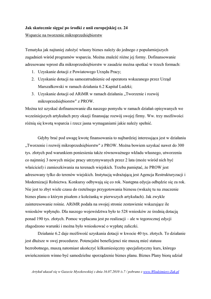 Jak skutecznie sięgać po środki z unii europejskiej cz. 24 Wsparcie na tworzenie mikroprzedsiębiorstw Tematyka jak najtaniej założyć własny biznes należy do jednego z popularniejszych zagadnień wśród programów wsparcia. Można znaleźć różne jej formy. Dofinansowanie adresowane wprost dla mikroprzedsiębiorstw w zasadzie można spotkać w trzech formach: 1. Uzyskanie dotacji z Powiatowego Urzędu Pracy; 2. Uzyskanie dotacji na samozatrudnienie od operatora wskazanego przez Urząd Marszałkowski w ramach działania 6.2 Kapitał Ludzki; 3. Uzyskanie dotacji od ARiMR w ramach działania „Tworzenie i rozwój mikroprzedsiębiorstw" z PROW. Można też uzyskać dofinansowanie dla naszego pomysłu w ramach działań opisywanych we wcześniejszych artykułach przy okazji finansując rozwój swojej firmy. Ww. trzy możliwości różnią się kwotą wsparcia i rzecz jasna wymaganiami jakie należy spełnić. Gdyby brać pod uwagę kwotę finansowania to najbardziej interesująca jest w działaniu „Tworzenie i rozwój mikroprzedsiębiorstw" z PROW. Można bowiem uzyskać nawet do 300 tys. złotych pod warunkiem poniesienia także równoważnego wkładu własnego, utworzenia co najmniej 3 nowych miejsc pracy utrzymywanych przez 2 lata (może wśród nich być właściciel) i zamieszkiwania na terenach wiejskich. Trzeba pamiętać, że PROW jest adresowany tylko do terenów wiejskich. Instytucją wdrażającą jest Agencja Restrukturyzacji i Modernizacji Rolnictwa. Konkursy odbywają się co rok. Następna edycja odbędzie się za rok. Nie jest to zbyt wiele czasu do rzetelnego przygotowania biznesu (wskażę tu na znaczenie biznes planu o którym pisałem z koleżanką w pierwszych artykułach). Jak zwykle zainteresowanie rośnie. ARiMR podała na swojej stronie zestawienie wskazujące ile wniosków wpłynęło. Dla naszego województwa było to 528 wniosków ze średnią dotacją ponad 190 tys. złotych. Pomoc wypłacana jest po realizacji – ale w tegorocznej edycji złagodzono warunki i można było wnioskować o wypłatę zaliczki. Działanie 6.2 daje możliwość uzyskania dotacji w kwocie 40 tys. złotych. To działanie jest dłuższe w swej procedurze. Potencjalni beneficjenci nie muszą mieć statusu bezrobotnego, muszą natomiast ukończyć kilkumiesięczny specjalistyczny kurs, którego uwieńczeniem winno być samodzielne sporządzenie biznes planu. Biznes Plany biorą udział Artykuł ukazał się w Gazecie Myszkowskiej z dnia 16.07.2010 /s.7 / pobrano z www.Wlodzimierz-Zak.pl w konkursie - dotację otrzymują najlepsze z nich. Dla osób starających się podpowiedź – warto zapoznać się ile dotacji przewiduje się przyznać w stosunku do ilości uczestników kursu oraz czy kurs nie preferuje określonych grup np. kobiet. Instytucją wdrażającą jest Urząd Marszałkowski. Wskazuje on tzw. operatorów którymi mogą być: Agencje Regionalne, Izby Gospodarcze, Powiatowe Urzędy Pracy, Samorządy – w zależności którą instytucję składającą projekt wybierze Urząd Marszałkowski. Dotacja z Powiatowego Urzędu Pracy na rozpoczęcie działalności wynosi 18 tys. zł. O ile Urząd dysponuje środkami rozpatrzenie wniosku jest znacznie krótsze trwa około miesiąca. Osoba starająca się o dotacje musi posiadać status bezrobotnego i nie może za ostatni rok odmówić pracy zarobkowej. Niektóre PUP mogą oprócz wniosku wraz z biznes planem wymagać udziału w szkoleniach. Dotacji nie trzeba zwracać jeśli firma utrzyma się przez rok. Przed wyborem, z jakiej formy korzystać, należy zapoznać się szczegółowo z wymogami formalnymi, gdyż warunki ulegają zmianie - np. w dniu 13 lipca Rząd RP przyjął nowelizację ustawy o promocji zatrudnienia i instytucjach rynku pracy. Należy rozpoznać, która z form jest dla nas możliwa i co ewentualnie musimy zrobić by zwiększyć szanse na uzyskanie wsparcia. Przy okazji zwracam uwagę Państwa, że od 7 czerwca do 9 sierpnia 2010 r. można składać wnioski w ramach działania 3.2. Infrastruktura okołoturystyczna”, Poddziałanie 3.2.1 „Infrastruktura okołoturystyczna/przedsiębiorstwa” – szczegóły na http://www.scp-slask.pl Włodzimierz Żak [email protected] Artykuł ukazał się w Gazecie Myszkowskiej z dnia 16.07.2010 /s.7 / pobrano z www.Wlodzimierz-Zak.pl