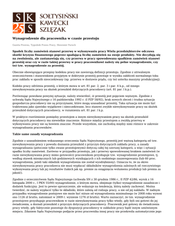 Wynagrodzenie dla pracownika w czasie przestoju Gazeta Prawna, Tygodnik Prawa Pracy, Sławomir Paruch Spadek liczby zamówień stanowi przerwę w wykonywaniu pracy Wielu przedsiębiorców odczuwa skutki kryzysu finansowego poprzez spadającą liczbę zamówień na swoje produkty. Nie decydują się na zwolnienia, ale zastanawiają się, czy przerwa w pracy spowodowana spadkiem zamówień stanowi przestój oraz czy w razie takiej przerwy w pracy pracownikowi należy się pełne wynagrodzenie, czy też tzw. wynagrodzenie za przestój. Obecnie obowiązujące przepisy kodeksu pracy nie zawierają definicji przestoju. Zgodnie z utrwalonym orzecznictwem i stanowiskiem przyjętym w doktrynie przestój powstaje w wyniku zakłóceń normalnego toku prac zakładu w sposób nieoczekiwany (np. przerwa w dostawie prądu, czy też usterka maszyny produkcyjnej). Kodeks pracy odróżnia przestój, o którym mowa w art. 81 par. 2, par. 3 i par. 4 k.p., od innego niewykonywania pracy na skutek przeszkód dotyczących pracodawcy (art. 81 par. l k.p.). Porównując powołane powyżej sytuacje, należy stwierdzić, iż przestój jest pojęciem węższym. Zgodnie z uchwałą Sądu Najwyższego z 16 października 1992 r. (I PZP 58/92), brak nowych zleceń i trudna sytuacja gospodarcza pracodawcy nie są przyczynami, które mogą uzasadniać przestój. Taka sytuacja nie może być traktowana jako zjawisko wyjątkowe i nieoczekiwane, lecz stanowi zwykłe niewykonywanie pracy na skutek przeszkód dotyczących pracodawcy, w rozumieniu art. 81 par. l k.p. W praktyce rozróżnienie pomiędzy przestojem a innym niewykonywaniem pracy na skutek przeszkód dotyczących pracodawcy ma niewielkie znaczenie. Różnice między przestojem a zwykłą przerwą w wykonywaniu pracy nie są bowiem znaczne. Przede wszystkim, nie zachodzą między nimi różnice w zakresie wynagradzania pracowników. Takie same zasady wynagradzania Zgodnie z uzasadnieniem wskazanego orzeczenia Sądu Najwyższego, przestój jest węższą kategorią od tzw. niewykonywania pracy z powodu doznania przeszkód z przyczyn dotyczących zakładu pracy, a zasady wynagradzania (potocznie tylko zwane przestojowymi) dotyczą całej tej szerszej kategorii, a więc i sytuacji spadku liczby zamówień. Zarówno w przypadku przestoju, jak i przerwy spowodowanej brakiem zamówień (w razie niewykonywania pracy mimo gotowości) pracownikom przysługuje tzw. wynagrodzenie przestojowe, tj. według stawek miesięcznych lub godzinowych wynikających z ich osobistego zaszeregowania (lub 60 proc. wynagrodzenia, jeżeli taki składnik wynagrodzenia nie został wyodrębniony). Oznacza to, że za okres niewykonywania pracy pracodawca nie musi wypłacać składników wynagrodzenia zależnych od rzeczywistego wykonywania pracy lub jej rezultatów (takich jak np. premie za osiągnięcia wolumenu produkcji lub premia za jakość). Zgodnie z orzecznictwem Sądu Najwyższego (uchwała SN z 30 grudnia 1986 r., II PZP 42/86, wyrok z 16 listopada 2000 r., I PKN 55/00) wynagrodzenie, o którym mowa, obejmuje (tylko) wynagrodzenie zasadnicze i dodatek funkcyjny. Jest to pewne uproszczenie, ale wskazuje na tendencję, którą należy zachować. Można twierdzić, że należy wypłacić tylko te składniki, które zależą od rodzaju pracy, a nie od jej nakładu. W żadnym przypadku wynagrodzenie postojowe nie może być niższe od wynagrodzenia minimalnego (w 2008 roku wynosi ono 1126 zł brutto, natomiast w 2009 r. wyniesie 1276 zł brutto). Warto zaznaczyć, że tzn. wynagrodzenie przestojowe przysługuje pracownikom w razie niewykonywania pracy tylko wtedy, gdy byli oni gotowi do jej świadczenia, a doznali przeszkód z przyczyn dotyczących pracodawcy. Pracownik jest gotowy do świadczenia pracy wtedy, gdy faktycznie pozostaje do dyspozycji pracodawcy w zakładzie pracy bądź innym umówionym miejscu. Zdaniem Sądu Najwyższego podjęcie przez pracownika innej pracy nie przekreśla automatycznie jego gotowości do pracy, jeżeli taka praca nie wyłącza dyspozycyjności pracownika (por. wyrok z 2 września 2003 r., I PK 345/02). Zatem pracownik w czasie przestoju lub innej przerwy w wykonywaniu pracy może przyjąć zlecenie od innego podmiotu i zachować prawo do wynagrodzenia przestojowego u dotychczasowego pracodawcy, jeżeli może na każde wezwanie pracodawcy niezwłocznie podjąć pracę. Dodatkowe uprawnienia pracodawcy W przypadku przestoju, pracodawca zyskuje jednak kilka dodatkowych uprawnień wobec pracowników, które nie przysługują w przypadku zwykłej przerwy w wykonywaniu pracy. Mianowicie, jeżeli przestój nastąpił z winy pracownika, wskutek czego pracownik nie wykonuje pracy, nie przysługuje mu wynagrodzenie. Szczególne są też zasady wynagradzania pracowników w razie przestoju spowodowanego warunkami atmosferycznymi. Inną odrębność między dwiema kategoriami dla pracodawców borykających się z okresowym spadkiem zamówień dotyczy możliwości powierzenia pracownikowi innej pracy. Taki przywilej ustawodawca przyznaje w art. 81 par. 3 k.p. tylko w przypadku przestoju (opierając się na założeniu, że mogą go uzasadniać tylko sytuacje nieprzewidziane). Pracodawca ma prawo powierzenia pracownikom innej odpowiedniej pracy za wynagrodzeniem przewidzianym za tę pracę, lecz nie niższym niż tzw. wynagrodzenie postojowe. Jednak pracodawcy wprowadzający przerwę w pracy z powodu spadającej liczby zamówień mogą na podstawie art. 42 par. 4 k.p. powierzyć pracownikowi inną pracę niż określoną w umowie na okres nieprzekraczający trzech miesięcy w roku kalendarzowym, jeżeli praca ta odpowiada kwalifikacjom pracownika. Należy jednak pamiętać, że powierzając pracownikowi inną pracę na podstawie art. 42 par. 4 k.p., należy mu się dotychczasowe wynagrodzenie, a nie tzw. wynagrodzenie przestojowe. Powierzenie pracownikowi innej pracy z powodu spadającej liczby zamówień nie może nastąpić na dłużej niż trzy miesiące, podczas gdy 