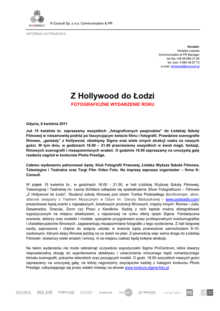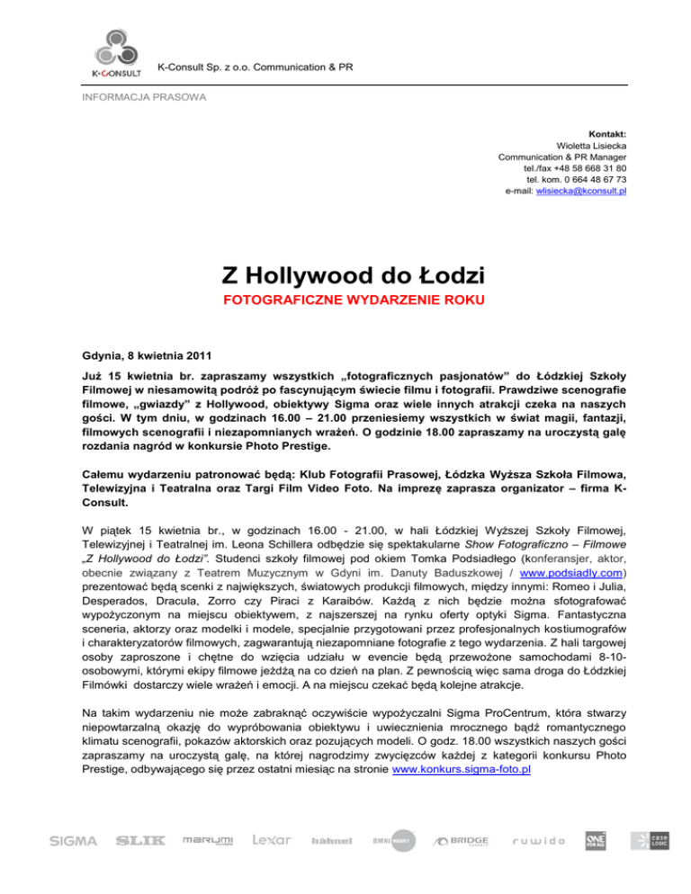 K-Consult Sp. z o.o. Communication & PR INFORMACJA PRASOWA Kontakt: Wioletta Lisiecka Communication & PR Manager tel./fax +48 58 668 31 80 tel. kom. 0 664 48 67 73 e-mail: [email protected] Z Hollywood do Łodzi FOTOGRAFICZNE WYDARZENIE ROKU Gdynia, 8 kwietnia 2011 Już 15 kwietnia br. zapraszamy wszystkich „fotograficznych pasjonatów” do Łódzkiej Szkoły Filmowej w niesamowitą podróż po fascynującym świecie filmu i fotografii. Prawdziwe scenografie filmowe, „gwiazdy” z Hollywood, obiektywy Sigma oraz wiele innych atrakcji czeka na naszych gości. W tym dniu, w godzinach 16.00 – 21.00 przeniesiemy wszystkich w świat magii, fantazji, filmowych scenografii i niezapomnianych wrażeń. O godzinie 18.00 zapraszamy na uroczystą galę rozdania nagród w konkursie Photo Prestige. Całemu wydarzeniu patronować będą: Klub Fotografii Prasowej, Łódzka Wyższa Szkoła Filmowa, Telewizyjna i Teatralna oraz Targi Film Video Foto. Na imprezę zaprasza organizator – firma KConsult. W piątek 15 kwietnia br., w godzinach 16.00 - 21.00, w hali Łódzkiej Wyższej Szkoły Filmowej, Telewizyjnej i Teatralnej im. Leona Schillera odbędzie się spektakularne Show Fotograficzno – Filmowe „Z Hollywood do Łodzi”. Studenci szkoły filmowej pod okiem Tomka Podsiadłego (konferansjer, aktor, obecnie związany z Teatrem Muzycznym w Gdyni im. Danuty Baduszkowej / www.podsiadly.com) prezentować będą scenki z największych, światowych produkcji filmowych, między innymi: Romeo i Julia, Desperados, Dracula, Zorro czy Piraci z Karaibów. Każdą z nich będzie można sfotografować wypożyczonym na miejscu obiektywem, z najszerszej na rynku oferty optyki Sigma. Fantastyczna sceneria, aktorzy oraz modelki i modele, specjalnie przygotowani przez profesjonalnych kostiumografów i charakteryzatorów filmowych, zagwarantują niezapomniane fotografie z tego wydarzenia. Z hali targowej osoby zaproszone i chętne do wzięcia udziału w evencie będą przewożone samochodami 8-10osobowymi, którymi ekipy filmowe jeżdżą na co dzień na plan. Z pewnością więc sama droga do Łódzkiej Filmówki dostarczy wiele wrażeń i emocji. A na miejscu czekać będą kolejne atrakcje. Na takim wydarzeniu nie może zabraknąć oczywiście wypożyczalni Sigma ProCentrum, która stwarzy niepowtarzalną okazję do wypróbowania obiektywu i uwiecznienia mrocznego bądź romantycznego klimatu scenografii, pokazów aktorskich oraz pozujących modeli. O godz. 18.00 wszystkich naszych gości zapraszamy na uroczystą galę, na której nagrodzimy zwycięzców każdej z kategorii konkursu Photo Prestige, odbywającego się przez ostatni miesiąc na stronie www.konkurs.sigma-foto.pl K-Consult Sp. z o.o. Communication & PR Serdecznie zapraszamy! To impreza, na której musi znaleźć się każdy miłośnik fotografii !!!