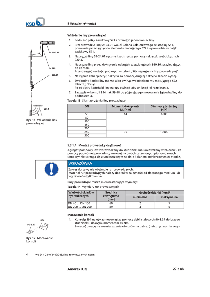 5 Ustawienie/monta Wk adanie liny prowadz cej 1. Podnie 2. Przeprowadzi lin 59-24.01 wokó kolana ko nierzowego ze stopk 72-1, ponownie przeci gn do elementu mocuj cego 572 i wprowadzi w pa k zaciskowy 571. pa k zaciskowy 571 i prze o y jeden koniec liny. 3. Napr y lin 59-24.01 r cznie i zacisn 920.37. 4. Napr y lin przez dokr cenie nakr tek sze ciok tnych 920.36, przylegaj cych do konsoli. Przestrzega warto ci podanych w tabeli Si a napr enia liny prowadz cej. 5. Nast pnie zabezpieczy nakr tki za pomoc drugiej nakr tki sze ciok tnej. 6. Swobodny koniec liny mo na albo zwin wokó elementu mocuj cego 572 albo te obci . Po obci ciu ko cówki liny nale y owin , aby unikn jej rozplatania. 7. Zaczepi w konsoli 894 hak 59-18 do pó niejszego mocowania a cucha/liny do podnoszenia. Tabela 13: Si a napr Rys. 11: Wk adanie liny prowadz cej za pomoc nakr tek sze ciok tnych enia liny prowadz cej DN Moment dokr cania M A[Nm] Si a napr enia liny P [N] 50 80 100 150 200 250 300 14 6000 30 10000 5.3.1.4 Monta prowadnicy dr kowej Agregat pompowy jest wprowadzany do studzienki lub umieszczany w zbiorniku za pomoc podwójnej prowadnicy rurowej na dwóch ustawionych pionowo rurach i samoczynnie sprz ga si z umieszczonym na dnie kolanem ko nierzowym ze stopk . Zakres dostawy nie obejmuje rur prowadz cych. Materia rur prowadz cych nale y dobra w zale no ci od t oczonego medium lub wg zalece u ytkownika. Rury prowadz ce musz mie nast puj ce wymiary: Tabela 14: Wymiary rur prowadz cych Wielko ci uk adów hydraulicznych DN 40 ... DN 150 DN 200 ... DN 700 rednica zewn trzna [mm] 60 89 Grubo cianki [mm]6) minimalna maksymalna 2 3 5 6 Mocowanie konsoli 894 90-3.37 1. Konsol 894 nale y zamocowa za pomoc dybli stalowych 90-3.37 do brzegu studzienki i dokr ci momentem 10 Nm. Zwraca uwag na rozmieszczenie otworów na dyble. (patrz rys. wymiarowy) Rys. 12: Mocowanie konsoli 6) wg DIN 2440/2442/2462 lub równowa nych norm Amarex KRT 27 z 88 5 Ustawienie/monta Monta rur prowadz cych Nieprawid owa instalacja rur prowadz cych Uszkodzenie prowadnicy rurowej! Rury prowadz ce nale y zawsze ustawia dok adnie pionowo. 920.37 1. Postawi rury 710 na sto kowych wypustach na kolanie ko nierzowym ze stopk 72-1 i ustawi pionowo. 2. Oznaczy d ugo rur 710 (do dolnej kraw dzi konsoli), zwracaj c przy tym uwag na zakres regulacji otworów pod u nych konsoli 894. 3. Obci rury 710 pod k tem prostym do osi rury i usun wewn trznej i zewn trznej. 4. Wsun konsol 894 z elastycznymi tulejami 520.37 w rury prowadz ce 710, a konsola oprze si na ko cach rur. 5. Dokr ci nakr tki 920.37. Elementy zaciskowe 81-51.37 zostan w wyniku tego przesuni te do góry, a tuleje 520.37 zamocowane we wn trzu rur. 6. Nakr tki 920.37 zabezpieczy drug nakr tk i Loctite 243. 894 520.37 81-51.37 901.37 710 zadziory po stronie Rys. 13: Monta rur prowadz cych W przypadku g boko ci monta u wi kszej ni 6 m zakres dostawy mo e obejmowa konsole stosowane jako podparcie rodkowe rur prowadz cych. Konsole te przejmuj równocze nie funkcj elementów dystansowych pomi dzy obydwiema rurami prowadz cymi. Monta wspornika rodkowego 1. Zmierzy wewn trzn rednic rur prowadz cych. 2. Elastyczne tuleje 520.39 z elementami zaciskowymi 81-51.39 nacisn wewn trzn rednic rury, dokr caj c nakr tki 920.39. 3. Sprawdzi , czy rury prowadz ce mog zosta spr 4. Z cza rubowe zabezpieczy , dokr caj c nakr tki zabezpieczaj ce. 5. Dalej zamontowa z rurami prowadz cymi. na y cie nasuni te na tuleje. Rys. 14: Monta wspornika rodkowego 5.3.1.5 Przygotowanie agregatu pompy Monta uchwytu 732 1. Zamocowa uchwyt 732 za pomoc rub trzpieniowych 902.35, podk adek 550.35 oraz nakr tek 920.35 na ko nierzu kró ca t ocznego. Przestrzega momentów dokr cania rub. 2. Umie ci uszczelk profilowan 410 lub te sznur okr g y 99-6 w rowku uchwytu. Uszczelka ta zapewnia w stanie zmontowanym uszczelnienie z cza z kolanem ko nierzowym ze stopk . 902.35 550.35 920.35 Rys. 15: Monta uchwytu 28 z 88 Amarex KRT
