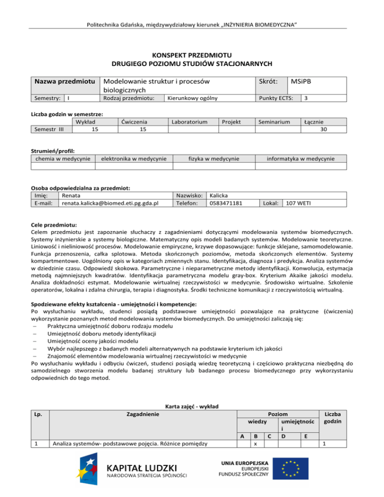 Politechnika Gdańska, międzywydziałowy kierunek „INŻYNIERIA BIOMEDYCZNA” KONSPEKT PRZEDMIOTU DRUGIEGO POZIOMU STUDIÓW STACJONARNYCH Nazwa przedmiotu Modelowanie struktur i procesów biologicznych Skrót: Semestry: Rodzaj przedmiotu: Punkty ECTS: 3 Seminarium Łącznie 30 I Liczba godzin w semestrze: Wykład Semestr III 15 Strumień/profil: chemia w medycynie Kierunkowy ogólny Ćwiczenia 15 Laboratorium elektronika w medycynie Osoba odpowiedzialna za przedmiot: Imię: Renata E-mail: [email protected] Projekt fizyka w medycynie Nazwisko: Telefon: MSiPB informatyka w medycynie Kalicka 0583471181 Lokal: 107 WETI Cele przedmiotu: Celem przedmiotu jest zapoznanie słuchaczy z zagadnieniami dotyczącymi modelowania systemów biomedycznych. Systemy inżynierskie a systemy biologiczne. Matematyczny opis modeli badanych systemów. Modelowanie teoretyczne. Liniowość i nieliniowość procesów. Modelowanie empiryczne, krzywe dopasowujące: funkcje sklejane, samomodelowanie. Funkcja przenoszenia, całka splotowa. Metoda skończonych poziomów, metoda skończonych elementów. Systemy kompartmentowe. Uogólniony opis w kategoriach zmiennych stanu. Identyfikacja, diagnoza i predykcja. Analiza systemów w dziedzinie czasu. Odpowiedź skokowa. Parametryczne i nieparametryczne metody identyfikacji. Konwolucja, estymacja metodą najmniejszych kwadratów. Identyfikacja parametryczna modelu gray-box. Kryterium Akaike jakości modelu. Analiza dokładności estymat. Modelowanie wirtualnej rzeczywistości w medycynie. Środowisko wirtualne. Szkolenie operatorów, lokalna i zdalna chirurgia, terapia i diagnostyka. Środki techniczne komunikacji z rzeczywistością wirtualną. Spodziewane efekty kształcenia - umiejętności i kompetencje: Po wysłuchaniu wykładu, studenci posiądą podstawowe umiejętności pozwalające na praktyczne (ćwiczenia) wykorzystanie poznanych metod modelowania systemów biomedycznych. Do umiejętności zaliczają się: − Praktyczna umiejętność doboru rodzaju modelu − Umiejętność doboru metody identyfikacji − Umiejętność oceny jakości modelu − Wybór najlepszego z badanych modeli alternatywnych na podstawie kryterium ich jakości − Znajomość elementów modelowania wirtualnej rzeczywistości w medycynie Po wysłuchaniu wykładu i odbyciu ćwiczeń, studenci posiądą wiedzę teoretyczną i częściowo praktyczna niezbędną do samodzielnego stworzenia modelu badanej struktury lub badanego procesu biomedycznego przy wykorzystaniu odpowiednich do tego metod. Karta zajęć - wykład Lp. Zagadnienie wiedzy A 1 Analiza systemów- podstawowe pojęcia. Różnice pomiędzy B x Poziom umiejętnośc i C D E Liczba godzin 1 Politechnika Gdańska, międzywydziałowy kierunek „INŻYNIERIA BIOMEDYCZNA” 12 13 14 15 systemami inżynierskimi i fizjologicznymi. Uogólnione właściwości systemów. Parametry rozłożone systemów biomedycznych. Opis matematyczny systemów biomedycznych. Modelowanie teoretyczne. Systemy liniowe i nieliniowe. Zasada superpozycji. Przykłady. Modelowanie empiryczne. Opis odpowiedzi systemu. Równania empiryczne i krzywe dopasowujące. Funkcje sklejane. Self-modeling. Regresja nieliniowa. Odpowiedź impulsowa i splot liniowy. Modelowanie metoda poziomów skończonych i elementów skończonych. Kompartment, podstawowa koncepcja, właściwości. Liniowość modeli kompartmentowych. Systemy compartmentowe donorcontrolled oraz acceptor-controlled. Opis systemów kompartmentowych w kategoriach wejście-stanwyjście. Analiza na płaszczyźnie zmiennych stanu. Identyfikacja, diagnoza i predykcja. Analiza systemów w dziedzinie czasu. Odpowiedź impulsowa i odpowiedź skokowa. Identyfikacja parametryczna i nieparametryczna. Rozplot. Estymacja metoda najmniejszych kwadratów. Analiza w dziedzinie częstotliwości. Potrzeba badań statystycznych. Dokładność pomiarów, dokładność estymat parametrów Projektowanie modelu na podstawie danych pomiarowych. Miary jakości modelu: wariancja residuów, stopień uwarunkowania. Kryteria Akaike i Schwartza. Identyfikacja modelu. Analiza dokładności estymat parametrów. Modelowanie virtual reality w ochronie zdrowia. Edukacja i trening. Zdalna chirurgia. Diagnoza, monitoring, terapia. Środki techniczne zdalnej chirurgii. Lp. Zagadnienie 2 3 4 5 6 7 8 9 10 11 X 1 X 1 X 1 X 1 X 1 X 1 X 1 X 1 X 1 X X X X 1 1 1 1 Razem: 15 Karta zajęć - ćwiczenia Poziom wiedzy A B C 1 2 3 4 5 6 7 8 9 10 11 12 Modele tworzone jako kombinacje elementów systemu. Liniowość modeli systemów fizjologicznych. Model mechanizmu respiracji oraz mechaniki pracy mięsni. Liniowość i nieliniowość modeli biomedycznych względem pobudzenia i/lub względem parametrów. Modele kompartmentowe. Równania stanu oraz ich rozwiązania. Model 1-kompartmentowy i 2-kompartmentowy. Analiza na płaszczyźnie stanu. Modele kompartmentowe. Równania stanu oraz ich rozwiązania. Model 3-kompartmentowy. Analiza na płaszczyźnie stanu. Ifentyfikowalność badanych modeli Związki pomiędzy makroparametrami oraz makroparametrami modelu Dokładność estymat parametrów modeli. Wyniki eksperymentów medycznych (dystrybucja procainamidu) i projektowania modelu/modeli. Wyniki eksperymentów medycznych (dystrybucja gonadotropiny) i projektowania modelu/modeli. Wyniki eksperymentów medycznych (dystrybucja kontrastu DSC w badaniach MRI mózgu) i projektowania modelu/modeli. Porównanie modeli dystrybucji prokainamidu. Wybór najlepszego z Projekt „Przygotowanie i realizacja kierunku inżynieria biomedyczna – studia międzywydziałowe” współfinansowany ze środków Unii Europejskiej w ramach Europejskiego Funduszu Społecznego. umiejętności D E Liczba godzin Politechnika Gdańska, międzywydziałowy kierunek „INŻYNIERIA BIOMEDYCZNA” 13 14 15 modeli. Kryteria Akaike i Schwartza. Porównanie modeli dystrybucji gonadotropiny. Wybór najlepszego z modeli. Kryteria Akaike i Schwartza Porównanie modeli dystrybucji kontrastu DSC w badaniac