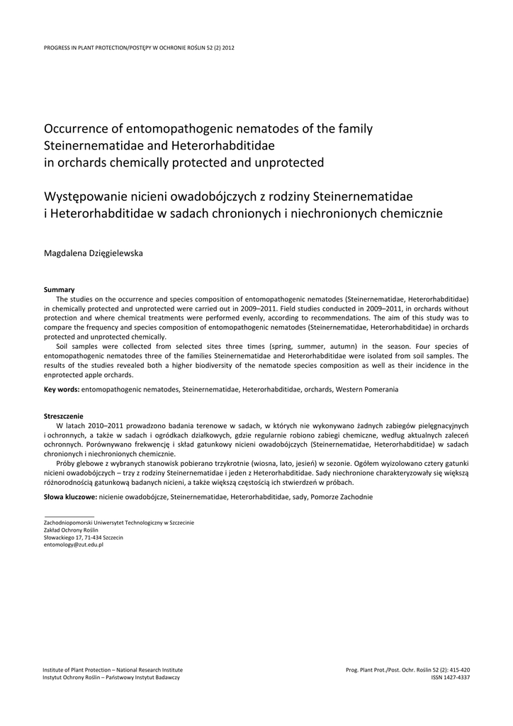PROGRESS IN PLANT PROTECTION/POSTĘPY W OCHRONIE ROŚLIN 52 (2) 2012 Occurrence of entomopathogenic nematodes of the family Steinernematidae and Heterorhabditidae in orchards chemically protected and unprotected Występowanie nicieni owadobójczych z rodziny Steinernematidae i Heterorhabditidae w sadach chronionych i niechronionych chemicznie Magdalena Dzięgielewska Summary The studies on the occurrence and species composition of entomopathogenic nematodes (Steinernematidae, Heterorhabditidae) in chemically protected and unprotected were carried out in 2009–2011. Field studies conducted in 2009–2011, in orchards without protection and where chemical treatments were performed evenly, according to recommendations. The aim of this study was to compare the frequency and species composition of entomopathogenic nematodes (Steinernematidae, Heterorhabditidae) in orchards protected and unprotected chemically. Soil samples were collected from selected sites three times (spring, summer, autumn) in the season. Four species of entomopathogenic nematodes three of the families Steinernematidae and Heterorhabditidae were isolated from soil samples. The results of the studies revealed both a higher biodiversity of the nematode species composition as well as their incidence in the enprotected apple orchards. Key words: entomopathogenic nematodes, Steinernematidae, Heterorhabditidae, orchards, Western Pomerania Streszczenie W latach 2010–2011 prowadzono badania terenowe w sadach, w których nie wykonywano żadnych zabiegów pielęgnacyjnych i ochronnych, a także w sadach i ogródkach działkowych, gdzie regularnie robiono zabiegi chemiczne, według aktualnych zaleceń ochronnych. Porównywano frekwencję i skład gatunkowy nicieni owadobójczych (Steinernematidae, Heterorhabditidae) w sadach chronionych i niechronionych chemicznie. Próby glebowe z wybranych stanowisk pobierano trzykrotnie (wiosna, lato, jesień) w sezonie. Ogółem wyizolowano cztery gatunki nicieni owadobójczych – trzy z rodziny Steinernematidae i jeden z Heterorhabditidae. Sady niechronione charakteryzowały się większą różnorodnością gatunkową badanych nicieni, a także większą częstością ich stwierdzeń w próbach. Słowa kluczowe: nicienie owadobójcze, Steinernematidae, Heterorhabditidae, sady, Pomorze Zachodnie Zachodniopomorski Uniwersytet Technologiczny w Szczecinie Zakład Ochrony Roślin Słowackiego 17, 71-434 Szczecin [email protected] Institute of Plant Protection – National Research Institute Instytut Ochrony Roślin – Państwowy Instytut Badawczy Prog. Plant Prot./Post. Ochr. Roślin 52 (2): 415-420 ISSN 1427-4337 416 Occurrence of entomopathogenic nematodes / Występowanie nicieni owadobójczych Wstęp / Introduction Nicienie owadobójcze z rodziny Steinernematidae i Heterorhabditidae znajdują szerokie zastosowanie w ochronie roślin w całej Europie. Szczególnie przeciwko opuchlakom (Otiorrhynchus sulcatus L.) w uprawach truskawek i roślin ozdobnych, ziemiórkom w pieczarkarniach i szklarniach (Ehlers 1996, 2001; Kaya i wsp. 2006), wciornastkom w ochronie roślin warzywnych (Fiedler i Sosnowska 2009), a także przeciwko pędrakom i drutowcom w agrocenozach (Kowalska 2001; Ansari i wsp. 2003, 2009). Występowanie i aktywność biologiczna tych nicieni zależy od wielu czynników środowiskowych (biotycznych i abiotycznych), które warunkują ich dalszy rozwój w glebie (Gaugler i Kaya 1990). Z licznych badań wynika, że nicienie owadobójcze są stosunkowo odporne na zanieczyszczenia chemiczne gleby, w tym na pestycydy (Kamionek 1992; Jaworska i wsp. 1997). Jednak niektóre insektycydy, z grupy karbaminianów czy związków fosfoorganicznych wykazują wysoką toksyczność względem larw inwazyjnych tych nicieni. Celem badań było porównanie frekwencji i składu gatunkowego nicieni owadobójczych (Steinernematidae, Heterorhabditidae) w sadach chronionych i niechronionych chemicznie. Materiały i metody / Materials and methods Badania terenowe prowadzono w latach 2010–2011 na Pomorzu Zachodnim, w sadach zaniedbanych, pozbawionych jakichkolwiek zabiegów pielęgnacyjnych i och- ronnych (7 stanowisk) oraz w sadach i ogródkach działkowych, gdzie regularnie wykonywano zabiegi chemiczne (19 stanowisk) (rys. 1, tab. 1), według aktualnych zaleceń ochronnych. Ogółem najwięcej prób glebowych pobrano z sadów jabłoniowych i jabłoniowo-śliwowych (tab. 1). Większość wyróżniała się odczynem obojętnym, tylko na dwóch stanowiskach odczyn gleby był kwaśny (tab. 1). Próby glebowe z wybranych stanowisk pobierano trzykrotnie (wiosna, lato, jesień) w sezonie. Z wybranej powierzchni o wymiarach około 100 m2, z głębokości 20 cm, pobierano 50 próbek jednostkowych stanowiących próbę zbiorczą o łącznej objętości około 600 cm3. Glebę przewożono do laboratorium w plastikowych, perforowanych workach. Obecność nicieni owadobójczych w próbach glebowych określono standardową metodą „owadów pułapkowych” Galleria mellonella (Bedding i Akhurst 1975; Mràček 1980). Śmiertelność owadów G. mellonellla, porażonych przez nicienie, oceniano po 5 dniach od założenia doświadczenia. Oznaczenia taksonomiczne poszczególnych gatunków nicieni wykonano na podstawie cech morfologicznych i morfometrycznych: larw inwazyjnych (J3) tych nicieni pozyskanych metodą White’a (1927) oraz osobników dorosłych wyizolowanych z martwych gąsienic Galleria przez sekcjonowanie (Nguyen Smart 1996; Hominik i wsp. 1997; Nguyen 2007). Dla ustalenia struktury dominacji gatunków nicieni stwierdzonych w próbach glebowych pobranych z terenu, zastosowano współczynnik dominacji (Krebs 1997). Analizę statystyczną przeprowadzono za pomocą programu STASTICA 6.0 software (StatSoft 1999). Zastosowano test istotności różnic między wskaźnikami struktury (p < 0,05). Rys. 1. Lokalizacja miejsc poboru gleby na obecność nicieni owadobójczych z rodziny Steinernematidae i Heterorhabditidae 