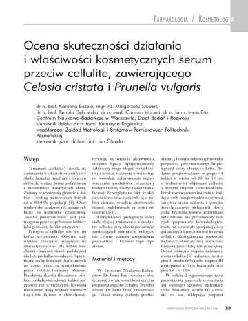 FARMAKOLOGIA / KOSMETOLOGI A Ocena skutecznoÊci dzia∏ania i w∏aÊciwoÊci kosmetycznych serum przeciw cellulite, zawierajàcego Celosia cristata i Prunella vulgaris dr n. biol. Karolina Bazela, mgr in˝. Ma∏gorzata Szubert, dr n. biol. Renata D´bowska, dr n. med. Carmen Vincent, dr n. farm. Irena Eris Centrum Naukowo-Badawcze w Warszawie, Dzia∏ Badaƒ i Rozwoju kierownik dzia∏u: dr n. farm. Katarzyna Rogiewicz wspó∏praca: Zak∏ad Metrologii i Systemów Pomiarowych Politechniki Poznaƒskiej kierownik: prof. dr hab. in˝. Jan Chajda Wst´p Terminem „cellulite” okreÊla si´ zaburzenia w ukszta∏towaniu skóry okolic brzucha, miednicy i koƒczyn dolnych, majàce form´ pofa∏dowaƒ i nierównoÊci powierzchni skóry. Zmiany te wyst´pujà g∏ównie u kobiet – wed∏ug najnowszych danych a˝ u 85-98% populacji [1]. Choç Êrodowisko naukowe nie uznaje cellulite za jednostk´ chorobowà, „skórka pomaraƒczowa” jest postrzegana przez wspó∏czesne kobiety jako powa˝ny defekt estetyczny. Patogeneza cellulite nie jest do koƒca wyjaÊniona. Obecnie najwi´ksze znaczenie przypisuje si´ charakterystycznej dla kobiet biochemii i budowie tkanki podskórnej okolicy poÊladkowo-udowej. Specyficzne cechy komórek t∏uszczowych tej cz´Êci cia∏a sà warunkowane przez ˝eƒskie hormony p∏ciowe. Podskórna tkanka t∏uszczowa okolicy poÊladkowo-udowej kobiet jest grubsza ni˝ u m´˝czyzn. Komórki t∏uszczowe majà wi´ksze rozmiary i sà luêno u∏o˝one, a tak˝e charak- teryzujà si´ wi´kszà aktywnoÊcià enzymu lipazy lipoproteinowej. Adipocyty mogà ulegaç powi´kszeniu i uciskaç naczynia krwionoÊne, co powoduje zahamowanie odprowadzania produktów przemiany materii i utrat´ elastycznoÊci tkanki ∏àcznej. Ze wzgl´du na fakt, ˝e skóra w∏aÊciwa oraz naskórek sà u kobiet cieƒsze, wszelkie nierównoÊci tkanek podskórnych sà lepiej widoczne [2-5]. Kompleksowa piel´gnacja skóry cia∏a obj´tej zmianami o charakterze cellulitu przy u˝yciu preparatów zawierajàcych substancje biologicznie czynne stanowi uzupe∏nienie profilaktyki i leczenia tego typu zmian. Materia∏ i metody W Centrum Naukowo-Badawczym Dr Irena Eris oceniono skutecznoÊç i w∏aÊciwoÊci kosmetyczne preparatu przeciw cellulite Tricellux serum (Dr Irena Eris), zawierajàcego Celosia cristata (celozja grzebie- niasta) i Prunella vulgaris (g∏owienka pospolita), przeznaczonego do piel´gnacji skóry obj´tej cellulite. Badanie przeprowadzono w grupie 44 kobiet w wieku od 20 do 58 lat, z widocznymi objawami cellulite o ró˝nym stopniu zaawansowania. Przed rozpocz´ciem badania u ka˝dej z osób przeprowadzono wywiad odnoÊnie stanu zdrowia i sposobu dotychczasowej piel´gnacji skóry cia∏a. Wybrane losowo ochotniczki by∏y zdrowe, nie przyjmowa∏y ˝adnych preparatów farmakologicznych, nie stosowa∏y specjalnej diety ani ˝adnych innych metod leczenia cellulite. Zdecydowana wi´kszoÊç badanych okreÊla∏a swà aktywnoÊç fizycznà jako s∏abà lub przeci´tnà. Ocena kliniczna stopnia zaawansowania cellulite [6] wykaza∏a, ˝e stopieƒ II mia∏o 66% osób, stopieƒ III wyst´powa∏ u 21% badanych, stopieƒ IV – u 13%. W trakcie 2-tygodniowego testu pacjentki nie zmienia∏y trybu ˝ycia ani ogólnego sposobu piel´gnacji cia∏a. Stosowa∏y serum raz dziennie, na noc, wklepujàc preparat DERMATOLOGIA ESTETYCZNA /VOL.8 /NR 4 /2006 219 F ARMAKOLOGIA / KOSMETOLOGIA w okolice cia∏a obj´te cellulite, bez wykonywania masa˝u. Pomiary aparaturowe wykonano na poczàtku badania (przed zastosowaniem kosmetyku) oraz po 2 tygodniach stosowania ocenianego preparatu. OkreÊlono stopieƒ nawil˝enia skóry (Corneometer CM 820, Courage-Khazaka), jej elastycznoÊç (Cutometer SEM 575, Courage-Khazaka) oraz g∏adkoÊç skóry (Video Digitizer VD 300, Courage-Khazaka) w okolicach obj´tych cellulite. Ponadto u ka˝dej z ochotniczek za pomocà centymetru lekarskiego zmierzono obwód uda. Do monitorowania post´pów kuracji przeciwcellulitowej wybrano technik´ termografii, która umo˝liwia ocen´ stopnia zaawansowania cellulite poprzez rejestracj´ temperatury powierzchni skóry w obszarach obj´tych zmianami [7-11]. U ka˝dej z badanych osób zarejestrowano obraz termograficzny (ThermaCAM s.c., FLIR Systems) wybranych fragmentów obu nóg przed oraz po 2 tygodniach kuracji. Na termogramach otrzymanych w kolejnych etapach badania poddano analizie obszary, które by∏y charakterystyczne dla cz´Êci powierzchni „zdrowej” skóry uda oraz cz´Êci obj´tej cellulite. Po zakoƒczeniu badania ochotniczki wype∏nia∏y specjalnie przygotowanà ankiet´, w której ocenia∏y skutecznoÊç przeprowadzonej kuracji oraz w∏aÊciwoÊci u˝ytkowe testowanego produktu. Wyniki Testowany preparat by∏ bardzo dobrze tolerowany przez wszystkie osoby bioràce udzia∏ w badaniu. Pomiary aparaturowe kondycji skóry po 2-tygodniowej kuracji wskazujà na: - Wzrost poziomu nawil˝enia skóry okolic obj´tych cellulite Êred- 220 DERMATOLOGIA ESTETYCZNA /VOL.8 /NR 4 /2006 Ocena skutecznoÊci dzia∏ania i w∏aÊciwoÊci kosmetycznych serum przeciw cellulite, zawierajàcego Celosia cristata i Prunella vulgaris STRESZCZENIE S∏owa kluczowe: cellulite, lipoliza, adipogeneza Wprowadzenie: Cellulite, widoczny w postaci nierównoÊci i pofa∏dowaƒ powierzchni skóry okolicy poÊladkowo-udowej, jest uwa˝any przez wspó∏czesne kobiety za powa˝ny defekt urody. Piel´gnacja skóry cia∏a przy u˝yciu preparatów zawierajàcych substancje biologicznie czynne stanowi cenne uzupe∏nienie profilaktyki i leczenia cellulitu. Celem badania by∏a ocena skutecznoÊci dzia∏ania i w∏aÊciwoÊci kosmetycznych serum przeciw cellulite, zawierajàcego Celosia cristata oraz Prunella vulgaris, przeznaczonego do piel´gnacji skóry cia∏a obj´tej cellulite. Materia∏ i metody: W artykule przedstawiono wyniki badaƒ aplikacyjnych skutecznoÊci dzia∏ania Tricellux serum (Dr Irena Eris). Badan