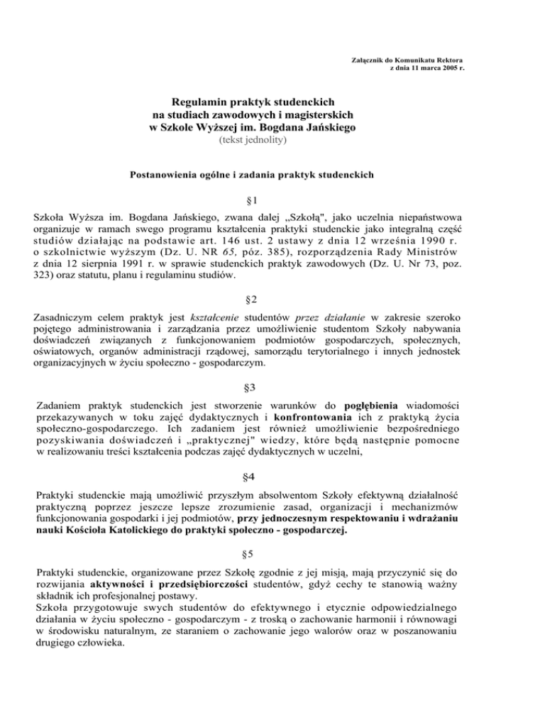 Załącznik do Komunikatu Rektora z dnia 11 marca 2005 r. Regulamin praktyk studenckich na studiach zawodowych i magisterskich w Szkole Wyższej im. Bogdana Jańskiego (tekst jednolity) Postanowienia ogólne i zadania praktyk studenckich §1 Szkoła Wyższa im. Bogdana Jańskiego, zwana dalej „Szkołą", jako uczelnia niepaństwowa organizuje w ramach swego programu kształcenia praktyki studenckie jako integralną część studiów działając na podstawie art. 146 ust. 2 ustawy z dnia 12 września 1990 r. o szkolnictwie wyższym (Dz. U. NR 65, póz. 385), rozporządzenia Rady Ministrów z dnia 12 sierpnia 1991 r. w sprawie studenckich praktyk zawodowych (Dz. U. Nr 73, poz. 323) oraz statutu, planu i regulaminu studiów. §2 Zasadniczym celem praktyk jest kształcenie studentów przez działanie w zakresie szeroko pojętego administrowania i zarządzania przez umożliwienie studentom Szkoły nabywania doświadczeń związanych z funkcjonowaniem podmiotów gospodarczych, społecznych, oświatowych, organów administracji rządowej, samorządu terytorialnego i innych jednostek organizacyjnych w życiu społeczno - gospodarczym. §3 Zadaniem praktyk studenckich jest stworzenie warunków do pogłębienia wiadomości przekazywanych w toku zajęć dydaktycznych i konfrontowania ich z praktyką życia społeczno-gospodarczego. Ich zadaniem jest również umożliwienie bezpośredniego pozyskiwania doświadczeń i „praktycznej" wiedzy, które będą następnie pomocne w realizowaniu treści kształcenia podczas zajęć dydaktycznych w uczelni, §4 Praktyki studenckie mają umożliwić przyszłym absolwentom Szkoły efektywną działalność praktyczną poprzez jeszcze lepsze zrozumienie zasad, organizacji i mechanizmów funkcjonowania gospodarki i jej podmiotów, przy jednoczesnym respektowaniu i wdrażaniu nauki Kościoła Katolickiego do praktyki społeczno - gospodarczej. §5 Praktyki studenckie, organizowane przez Szkołę zgodnie z jej misją, mają przyczynić się do rozwijania aktywności i przedsiębiorczości studentów, gdyż cechy te stanowią ważny składnik ich profesjonalnej postawy. Szkoła przygotowuje swych studentów do efektywnego i etycznie odpowiedzialnego działania w życiu społeczno - gospodarczym - z troską o zachowanie harmonii i równowagi w środowisku naturalnym, ze staraniem o zachowanie jego walorów oraz w poszanowaniu drugiego człowieka. §6 Praktyki mają kształtować podmiotowość i aktywność indywidualną studentów, ale równie ważnym zadaniem jest rozwijanie ich umiejętności zespołowej współpracy. Podejmowana ona będzie między innymi na rzecz Szkoły, społeczności akademickiej, środowiska lokalnego i pozalokalnego oraz służyć upowszechnianiu dobrego imienia Szkoły - jej promocji w szeroko rozumianym znaczeniu. §7 Praktyki studenckie mają przyczynić się także do zintegrowania społeczności akademickiej Szkoły w twórczej współpracy oraz do wyzwolenia kreatywności. Mają ukazywać studentom sens pracy dla dobra Rodziny, Narodu, Kościoła, Państwa Polskiego - zgodnie z naczelną ideą Szkoły, jaką jest służba w duchu patriotyzmu, prawdy, dobra, miłości oraz odpowiedzialności za losy Rodziny, społeczności lokalnej, Narodu i Kraju. §7a Zasadniczym celem praktyk magisterskich jest praktyczna nauka planowania przedsięwzięć -czyli praktyczne wykonywanie projektów zamierzeń gospodarczych, społecznych, edukacyjnych, naukowych. Realizowanie projektów przez studentów stanowić ma również element uzupełniający i sprawdzający w trakcie realizacji przedmiotów zawodowych studiów magisterskich. §7b Projekt, o którym mowa w § 7 a powinien zawierać następujące elementy: 1.temat, 2.uzasadnienie przydatności projektu, 3.metody organizacji, 4.plan działania, 5.kryteria wykonania, 6.szczegółową kalkulację kosztów, 7.spodziewane efekty. §7c Wykonywane przez studentów projekty muszą dotyczyć rzeczywistych przedsięwzięć, np. wykonanie projektu planu promocji Szkoły, z podziałem na miesięczną realizację, wysokości finansowania, badania konkurencji, przewidywanego naboru oraz zawierać w/w elementy. W przypadku studentów pracujących wykonywane projekty mogą dotyczyć konkretnych przedsięwzięć z własnego zakładu pracy i powinny stanowić w pierwszej kolejności inicjatywę studenta. Organizacja praktyk §8 Organizacją zawodowych praktyk studenckich zajmuje się Szkoła, stwarzając okazję do nabywania doświadczeń w ramach zajęć dydaktycznych oraz pozadydaktycznych i pozaszkolnych. Regulamin praktyk studenckich strona 2 z 8 W tym celu, zgodnie z regulaminem studiów, wyodrębnia się w planie nauczania godziny przewidziane na praktyki studenckie. Także służy temu metodyka nauczania (warsztaty, zajęcia terenowe itp.) poszczególnych przedmiotów oraz sfera społeczno — wychowawczej działalności Szkoły. §9 O p t y m a l n a r e a l i za c j a i d e i e d uk ac j i po pr z ez p ow i ą z an i e p r a k ty k s tu de n ck i c h z przedmiotami kształcenia oraz sfery dydaktycznej z pozadydaktyczną wymaga integracji jednych i drugich, zwłaszcza w zakresie treści, form i metod kształcenia. Służą temu cykliczne spotkania metodyczne pracowników i studentów Szkoły celem wypracowania jak najefektywniejszego modelu edukacji i formacji zawodowej studentów- zgodnie z ideą misji Zmartwychwstańców oraz dorobku tego Zgromadzenia. §10 Nadzór nad organizacją i koordynacją praktyk Szkoły sprawuje koordynator ds. praktyk -zwany dalej „koordynatorem praktyk". Koordynator praktyk sprawuje nadzór nad realizacją praktyk we wszystkich jednostkach organizacyjnych Szkoły. §11 Za realizację praktyk studenckich w Wydziałach odpowiadają kierownicy praktyk studenckich. §12 Praktyki w zakładach pracy lub innych jednostkach organizacyjnych odbywają studenci po uprzednim uzyskaniu zgody kierownika praktyk i otrzymaniu stosownego skierowania. §13 Studenci odbywają praktykę w mi