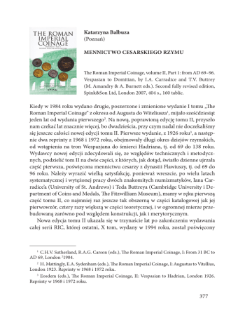 KATARZYNA BALBUZA, MENNICTWO CESARSKIEGO RZYMU Katarzyna Balbuza (Poznań) MENNICTWO CESARSKIEGO RZYMU The Roman Imperial Coinage, volume II, Part 1: from AD 69–96. Vespasian to Domitian, by I.A. Carradice and T.V. Buttrey (M. Amandry & A. Burnett eds.). Second fully revised edition, Spink&Son Ltd, London 2007, 404 s., 160 tablic. Kiedy w 1984 roku wydano drugie, poszerzone i zmienione wydanie I tomu „The Roman Imperial Coinage” z okresu od Augusta do Witeliusza1, mijało sześćdziesiąt jeden lat od wydania pierwszego2. Na nową, poprawioną edycję tomu II, przyszło nam czekać lat znacznie więcej, bo dwadzieścia, przy czym nadal nie doczekaliśmy się jeszcze całości nowej edycji tomu II. Pierwsze wydanie, z 1926 roku3, a następnie dwa reprinty z 1968 i 1972 roku, obejmowały długi okres dziejów rzymskich, od wstąpienia na tron Wespazjana do śmierci Hadriana, tj. od 69 do 138 roku. Wydawcy nowej edycji zdecydowali się, ze względów technicznych i metodycznych, podzielić tom II na dwie części, z których, jak dotąd, światło dzienne ujrzała część pierwsza, poświęcona mennictwu cesarzy z dynastii Flawiuszy, tj. od 69 do 96 roku. Należy wyrazić wielką satysfakcję, ponieważ wreszcie, po wielu latach systematycznej i wytężonej pracy dwóch znakomitych numizmatyków, Iana Carradice’a (University of St. Andrews) i Teda Buttreya (Cambridge University i Department of Coins and Medals, The Fitzwilliam Museum), mamy w ręku pierwszą część tomu II, co najmniej raz jeszcze tak obszerną w części katalogowej jak jej pierwowzór, cztery razy większą w części teoretycznej, i w ogromnej mierze przebudowaną zarówno pod względem konstrukcji, jak i merytorycznym. Nowa edycja tomu II ukazała się w trzynaście lat po zakończeniu wydawania całej serii RIC, której ostatni, X tom, wydany w 1994 roku, został poświęcony 1 C.H.V. Sutherland, R.A.G. Carson (eds.), The Roman Imperial Coinage, I: From 31 BC to AD 69, London 21984. 2 H. Mattingly, E.A. Sydenham (eds.), The Roman Imperial Coinage, I: Augustus to Vitellius, London 1923. Reprinty w 1968 i 1972 roku. 3 Eosdem (eds.), The Roman Imperial Coinage, II: Vespasian to Hadrian, London 1926. Reprinty w 1968 i 1972 roku. 377 STUDIA EUROPAEA GNESNENSIA 4/2011 · RECENZJE mennictwu okresu schyłkowego Imperium Romanum, tj. latom 395–491 n.e.4 Cała pierwsza seria RIC, włącznie z reprintami, wydawana była przez blisko stulecie w wydawnictwie Spink and Son Ltd. (bieżący tom został opublikowany przez tego samego wydawcę). Nowa edycja tomu II jest konsekwencją ogromnego przyrostu źródeł numizmatycznych wskutek nowych odkryć, nowoczesnej ich analizy i badań. Wydany w 2007 roku nowy katalog monet emitowanych przez cesarzy z dynastii flawijskiej charakteryzuje się wyjątkową kompletnością. Uzyskano ją m.in. przez uzupełnienie dotychczasowego katalogu o jego imperialny odpowiednik w prowincjach, który wcześniej opublikowano w II tomie katalogu „Roman Provincial Coinage”5, oraz przez dodanie wielu nowych typów monet, często już skatalogowanych w innych publikacjach6 lub odkrytych po 1926 roku. Poprzedni zbiór monet, składający się na pierwszą edycję RIC, został poddany wnikliwej krytyce i starannej weryfikacji. W wyniku wspomnianych zabiegów dotychczasowy katalog uszczuplono o egzemplarze monet, w stosunku do których stwierdzono wątpliwą autentyczność. Często są to monety, które, pomimo pewnych wątpliwości, włączono do pierwszej edycji katalogu niemal mechanicznie, bezkrytycznie przejmując je ze starego korpusu Henry’ego Cohena7. Dokładną liczbę nowych typów monet trudno sprecyzować, gdyż w pierwszej edycji RIC ciągłą numerację wzbogacono znacznikami typu a lub A, co utrudnia ich policzenie. W celu wyeliminowania niejasności, jakie wyniknęły w pierwszej edycji, dla uzyskania większej przejrzystości, wydawcy bieżącej edycji odmiany poszczególnych typów emisji skatalogowali pod oddzielnymi numerami. I tak, podczas gdy w pierwszej edycji katalogu ostateczna (po dodaniu wariacji typu a i A) liczba typów monet Wespazjana wyniosła 913, obecnie, po odjęciu od tej liczby 85 typów nieautentycznych, liczba ostateczna w nowej edycji wzrosła do 1581. W odniesieniu do mennictwa Tytusa, w stosunku do pierwszej edycji, gdzie ogółem wydzielono, wraz z odmianami poszczególnych typów, 304 warianty, obecny katalog, po usunięciu 54 fałszerstw, oferuje 518 typów. Mennictwo Domicjana w poprzedniej edycji zawierało ogółem 574 typy. Po 4 R.A.G. Carson, J.P.C. Kent, A.M. Burnett (eds.), The Roman Imperial Coinage, X: The divided Empire and the fall of the Western parts: AD 395–491, London 1994. 5 A. Burnett, M. Amandry, P.P. Ripollès (eds.), Roman Provincial Coinage, II: From Vespasian to Domitian: (AD 69–96), London 1999. 6 Zestawienie katalogów i publikacji numizmatycznych, zob. I.A. Carradice, T.V. Buttrey, The Roman Imperial Coinage, II2, s. xiii–xx. 7 H. Cohen, Description historique des monnaies frappés sous l’empire romain, I, Paris 2 1880. 378 KATARZYNA BALBUZA, MENNICTWO CESARSKIEGO RZYMU usunięciu fałszerstw w liczbie 59 i dodaniu nowych monet ostateczna liczba dla ostatniego z Flawiuszy wyniosła ogółem 830 typów. Reasumując, nowy katalog prezentuje 2929 typów monet, zamiast 1791, które skatalogowano w pierwszej edycji. Jest bogatszy o 1138 nowych typów monet flawijskich (Wespazjan: 668; Tytus: 214; Domicjan: 256), i uboższy o 198 typów monet, które w wyniku weryfikacji uznano za antyczne lub nowożytne fałszerstwa. Powyższe zestawienie liczbowe jasno wykazuje, że nowa edycja RIC II, cz. 1, w porównaniu do pierwszej, oferuje niemal podwójną liczbę typów monet8. Nadzwyczaj wartościowe w nowej edycji jest uwzględnienie przez Carradice’a i Buttreya aktualnego stanu badań nad mennictwem Flawiuszy (tj. po roku 1926), zarówno we wstępach analitycznych do mennictwa poszczególnych cesarzy, jak i w całym komentar