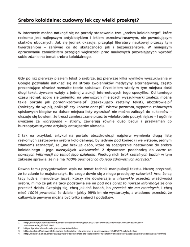 Srebro koloidalne: cudowny lek czy wielki przekręt? W internecie można natknąć się na porady stosowania tzw. „srebra koloidalnego”, które rzekomo jest najlepszym antybiotykiem i lekiem przeciwwirusowym, nie powodującym skutków ubocznych. Jak się jednak okazuje, przegląd literatury naukowej przeczy tym twierdzeniom – zarówno co do skuteczności jak i bezpieczeństwa. W niniejszym opracowaniu zamieściłem przegląd większości prac naukowych pozwalających wyrobić sobie zdanie na temat srebra koloidalnego. Gdy po raz pierwszy pisałem tekst o srebrze, już pierwsze kilka wyników wyszukiwania w Google pozwalało natknąć się na strony zwolenników medycyny alternatywnej, często prezentujące również rozmaite teorie spiskowe. Przekleiłem wtedy w tym miejscu dość długi tekst, żywcem wzięty z jednej z aukcji internetowych tego specyfiku. Od tamtego czasu jednak sporo się zmieniło; na pierwszych miejscach wyszukiwarki znaleźć można takie portale jak poradnikzdrowie.pl1 (zaskakująco rzetelny tekst), abczdrowie.pl2 (należący do wp.pl), polki.pl 3 czy kobieta.onet.pl4. Wbrew pozorom, wyparcia zabawnych spiskowych blogów na dalsze miejsca listy wyszukań nie można zaliczyć do sukcesów – okazuje się bowiem, że treści zamieszczane przez te wielokrotnie poczytniejsze - i ogólnie uważane za wiarygodne - strony, zawierają równie dużo bzdur i przekłamań co hurraoptymistyczne artykuły entuzjastów altmedu. I tak na przykład, artykuł na portalu abczdrowie.pl najpierw wymienia długą listę rzekomych zastosowań srebra koloidalnego, by jedynie pod koniec (i we wstępie, jednym zdaniem) zaznaczyć, że „nie brakuje osób, które są sceptycznie nastawione do srebra koloidalnego i jego niezwykłych właściwości. Z dystansem podchodzą do coraz to nowszych informacji na temat jego działania. Według nich brak rzetelnych badań w tym zakresie sprawia, że nie ma 100% pewności co do jego zdrowotnych korzyści.” Dawno temu przygotowałem wpis na temat technik manipulacji tekstu. Muszę przyznać, że to zdanie to majstersztyk. Bo czego dowie się z niego przeciętny człowiek? Ano, że są tacy ludzie, maruderzy jacyś, którzy nie dowierzają w niezwykłe przecież właściwości srebra, mimo że jak na tacy podstawia się im pod nos coraz to nowsze informacje że ono przecież działa. Czepiają się, chcą jakichś badań, bo przecież nie ma rzetelnych, i chcą mieć 100% pewności, że działa – jakby 99% im nie wystarczyło, a wiadomo przecież, że całkowicie pewnym można być tylko śmierci i podatków. 1 2 3 4 http://www.poradnikzdrowie.pl/zdrowie/domowa-apteczka/srebro-koloidalne-wlasciwosci-lecznicze-izastosowanie_42040.html https://portal.abczdrowie.pl/srebro-koloidalne http://polki.pl/zdrowie/leki,srebro-koloidalne-wlasciwosci-i-zastosowanie,10415870,artykul.html http://kobieta.onet.pl/zdrowie/zycie-i-zdrowie/srebro-koloidalne-naturalny-antybiotyk-zastosowanie-wlasciwosci/kx9481 Tekst abczdrowie.pl został zweryfikowany (pozytywnie, jak rozumiem) przez p. Elizę Gosławską, „specjalistkę ds. żywienia człowieka” (specjalizacja dietetyki). Dobrze, że przynajmniej nie przez lekarza… Idziemy dalej. Polki.pl, jak się zdaje, nie rozróżnia srebra koloidalnego stosowanego w medycynie alternatywnej od kolargolu – roztworu srebra stosowanego jako surowiec farmaceutyczny, głównie w okulistyce. Wrzuca wszystko do jednego worka, ostrzegając przy tym – co dość zabawne – żeby wykazać się ostrożnością, gdyż „nie wszystkie produkty na rynku polskim są pełnowartościowe.” Poza tym następuje standardowa lista schorzeń, na które pomaga – od kataru, przez słynne „650 rodzajów bakterii, grzybów, pleśni i wirusów”, aż do – jakżeby inaczej – raka. Onet szarpnął się na najdłuższy, i najbardziej „wnikliwy” tekst – powołuje się na Hipokratesa i arystokrację co się dżumie nie kłaniała bo jadła srebrami, jest więc nawiązanie do tego, od jak bardzo dawna znane są jego magiczne właściwości. Oczywiście piszą też o sześciuset pięćdziesięciu zarazkach, przeziębieniach, grypie i tym podobnych. Ale chociaż nie piszą nic o nowotworach, zawsze to jakiś plus… A jak to wyglądało dawniej? Ano tak 5 (pod cytatem podsumowanie w punktach, nie zmuszam do czytania tego bełkotu): Srebro kolidalne Ag 100, zwane naturalnym antybiotykiem zawiera srebro najwyższej czystości (99,999%). Zabija 650 szczepów bakterii. W przeciwieństwie do antybiotyków, nie niszczy dobroczynnej flory bakteryjnej. Jak dotąd, nie stwierdzono aby chorobotwórcze mikroorganizmy uodporniły się na jego działanie.Wspomaga leczenie przeziębień, kataru, kaszlu, grypy, anginy, zapalenia gardła, zatok, oskrzeli, płuc i innych infekcji bakteryjnych. Jedyny w Polsce preparat na bazie koloidu srebra, dopuszczony do obrotu. – działa jak antybiotyk – w ciągu 6 minut niszczy 650 chorobotwórczych mikroorganizmów – zarazki nie potrafią rozwinąć odporności na działanie srebra koloidalnego. Czym jest srebro koloidalne Srebro koloidalne to mikroskopijne cząsteczki – jony srebra, zawieszone w dejonizowanej wodzie. Struktura koloidu jest taka sama jak wewnętrznych płynów ustrojowych, dlatego jego przyswajalność wynosi od 90 do 100%. Srebro koloidalne jest preparatem nietoksycznym i nie powoduje negatywnych skutków ubocznych. Zachowuje przy życiu dobre, ochraniające organizm bakterie. Nie akumuluje się w organizmie. Zostaje z niego w ciągu kilku dni wydalone. Nie osłabia wątroby oraz nie podrażnia układu pokarmowego. Jak działa srebro koloidalne. Zaobserwowano, że samo wyszukuje zarazki w organizmie, przyciąga je swym dodatnim ładunkiem i niszczy niezbędne im do życia enzymy. Beztlenowe bakterie i wirusy po prostu utlenia, czyli spala. Z tego powodu nazywane jest srebrnym pociskiem. Nie atakuje w sposób schematyczny, ale inteligentny. Dzięki temu podczas blisko stuletnich bada